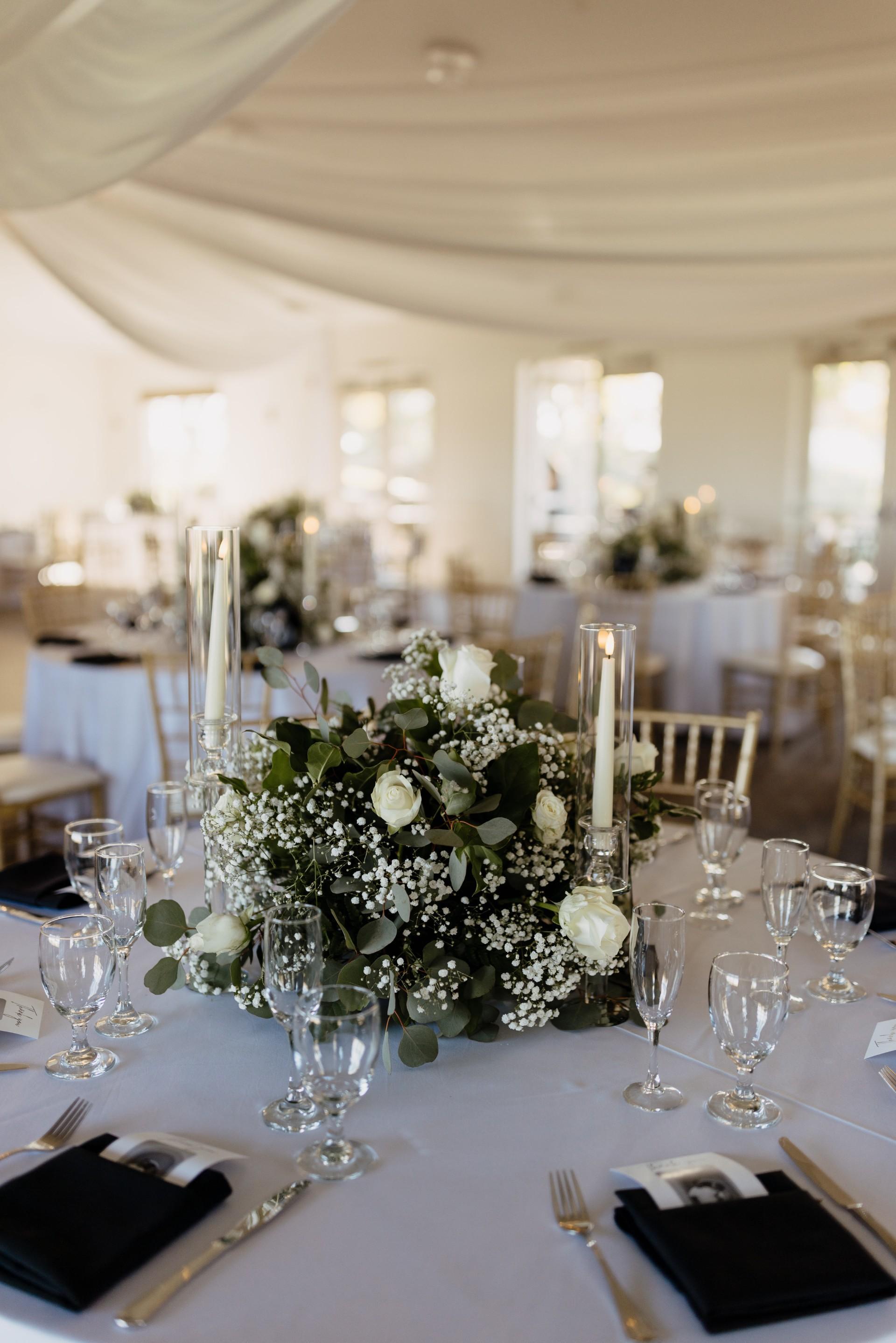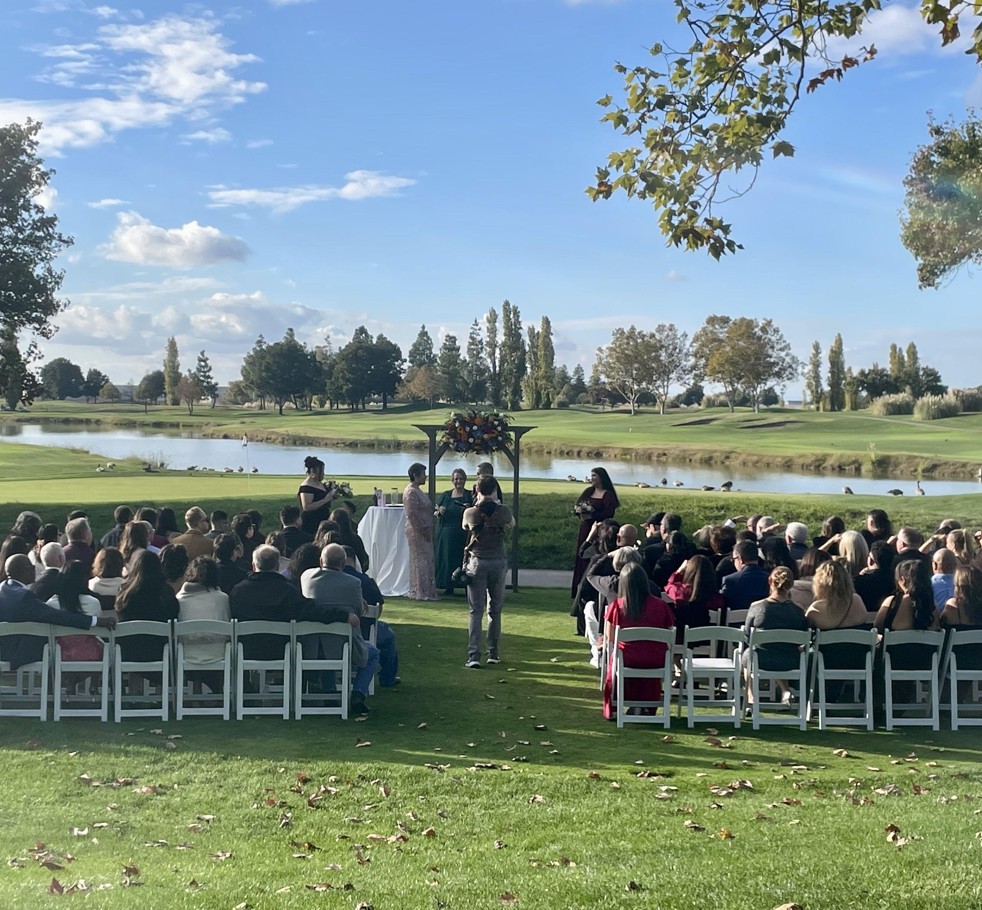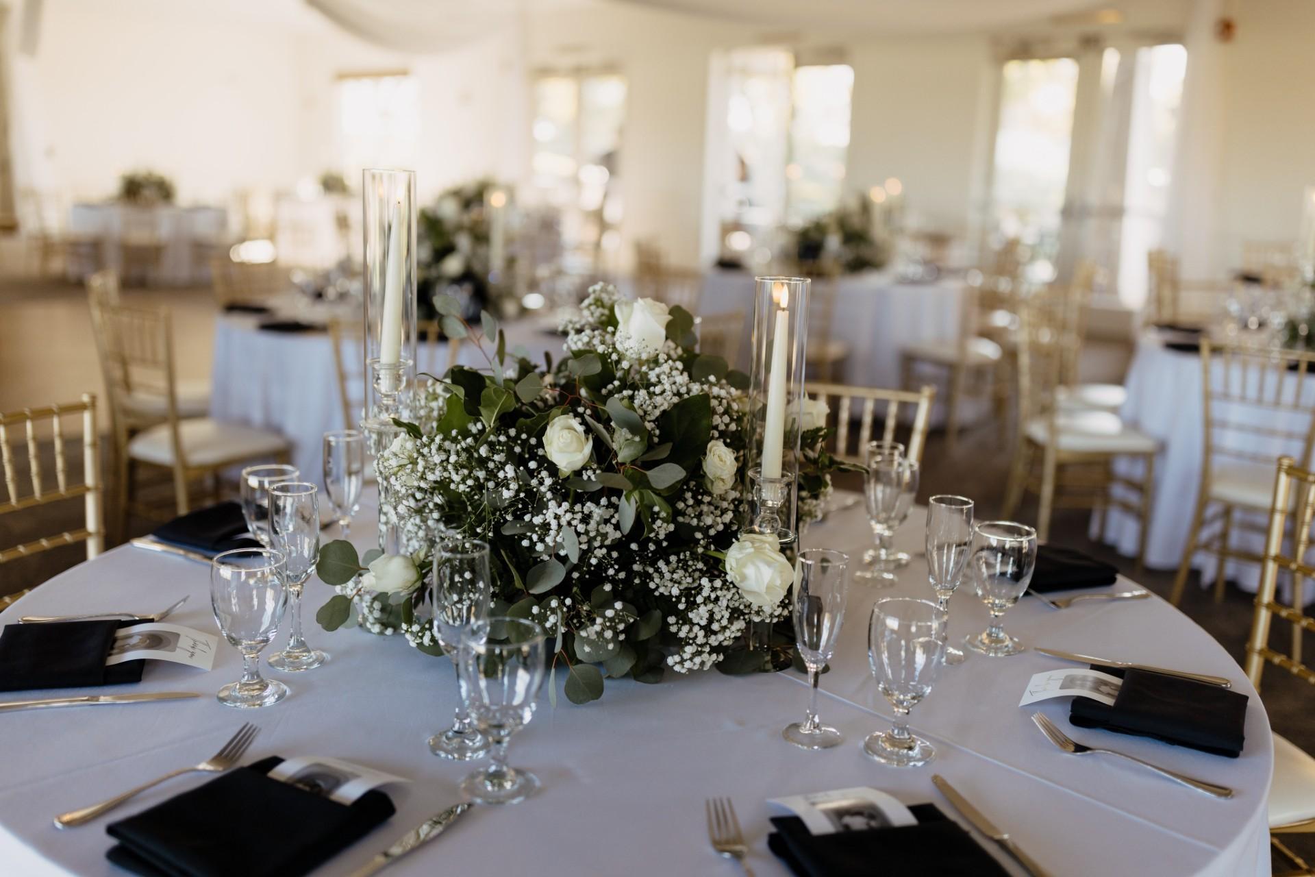 With breathtaking lake views and unforgettable sunsets over the golf course, there’s truly no better setting for your special day. Exchange vows in a picturesque ceremony overlooking our tranquil lake, then celebrate with up to 190 guests in our elegant indoor reception space, featuring rich wood floors and stylish lighting. We provide everything you need to bring your vision to life. We include all your table needs, gold chivari chairs, floor-length linens and napkins in any color, as well as full china, glassware, and flatware. Our experienced team handles all setup, takedown, and cleanup, and we include all the appropriate staffing to ensure your event runs seamlessly. Whether you're planning an intimate gathering or a grand celebration, our venue offers the perfect blend of natural beauty and effortless sophistication.