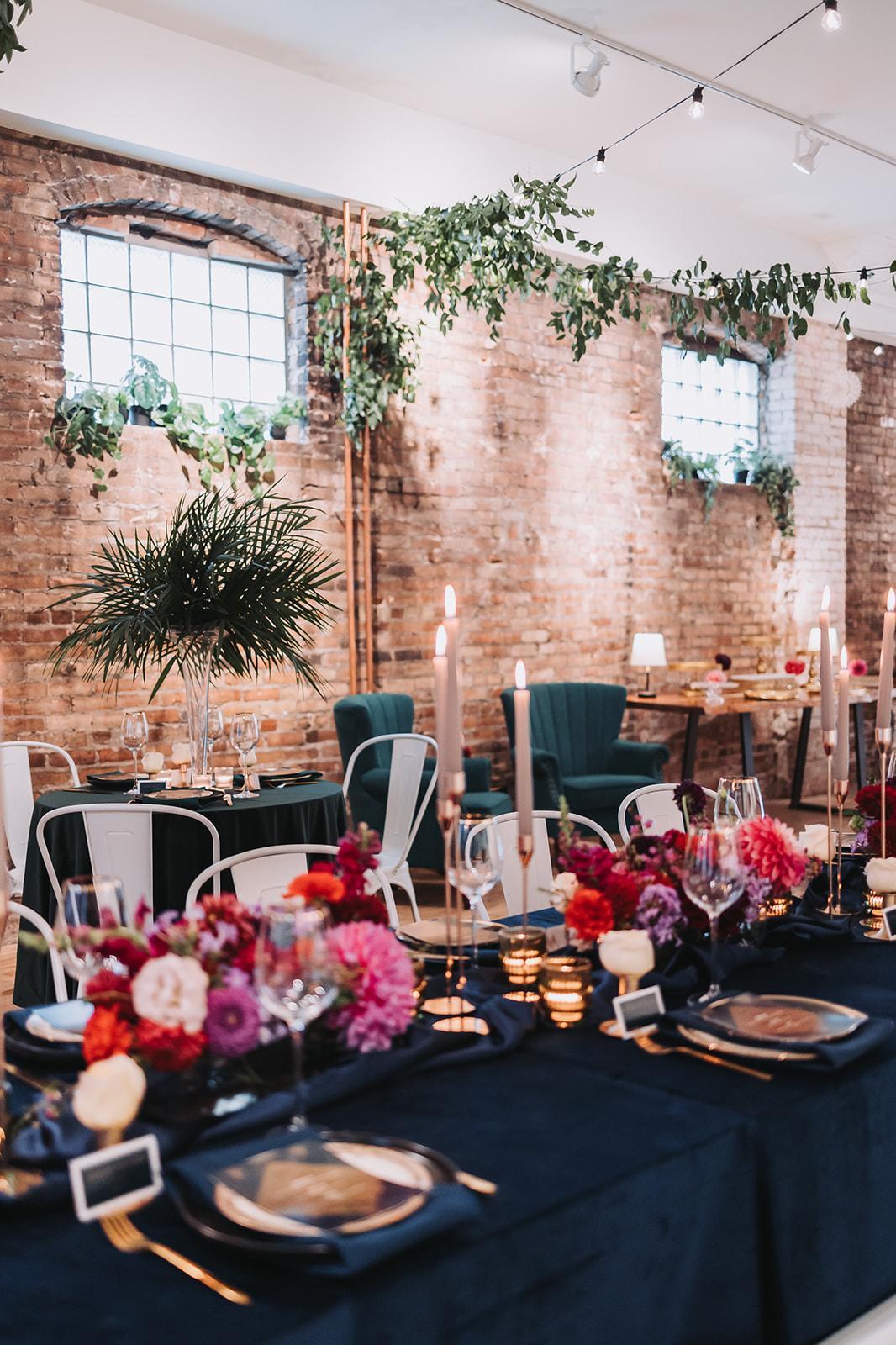 This spaces comes equipped with wooden tables, black or white chairs, lounge furniture, string lights, and live plant life. Tall brick walls connect to original ornate ceiling tiles and wood floors complete the look.