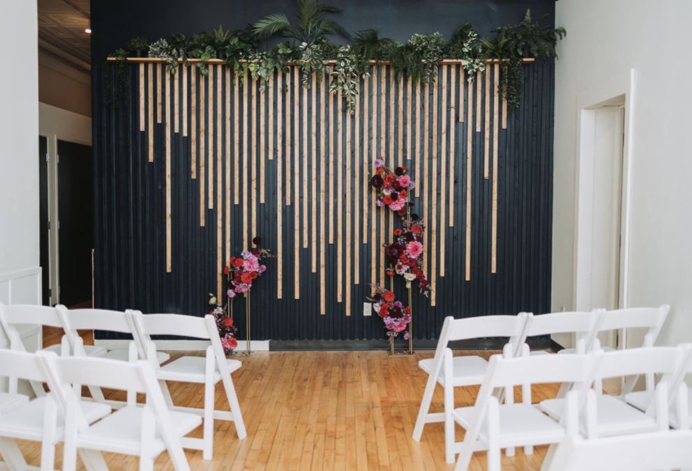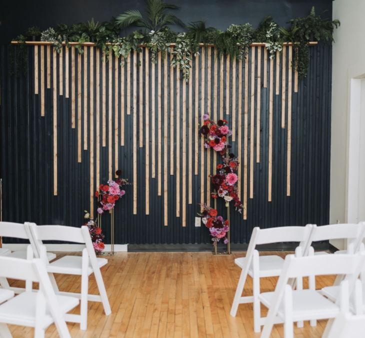 - 2 getting-ready/storage rooms - Wooden art wall - String lights - Chairs - Cocktail tables - Kitchen prep space