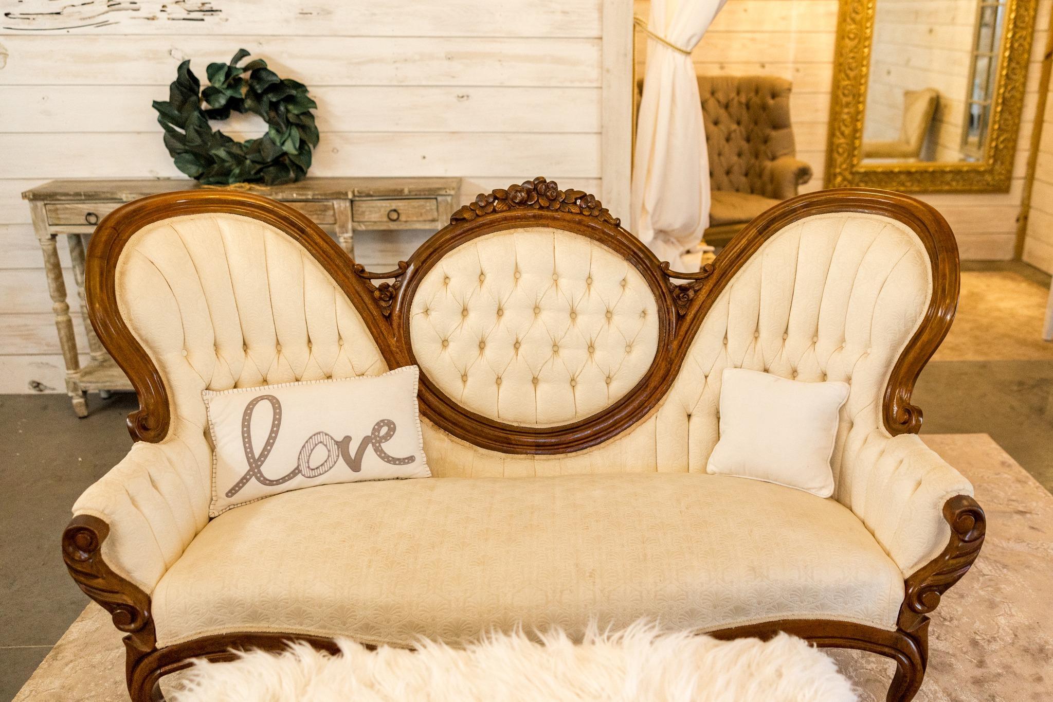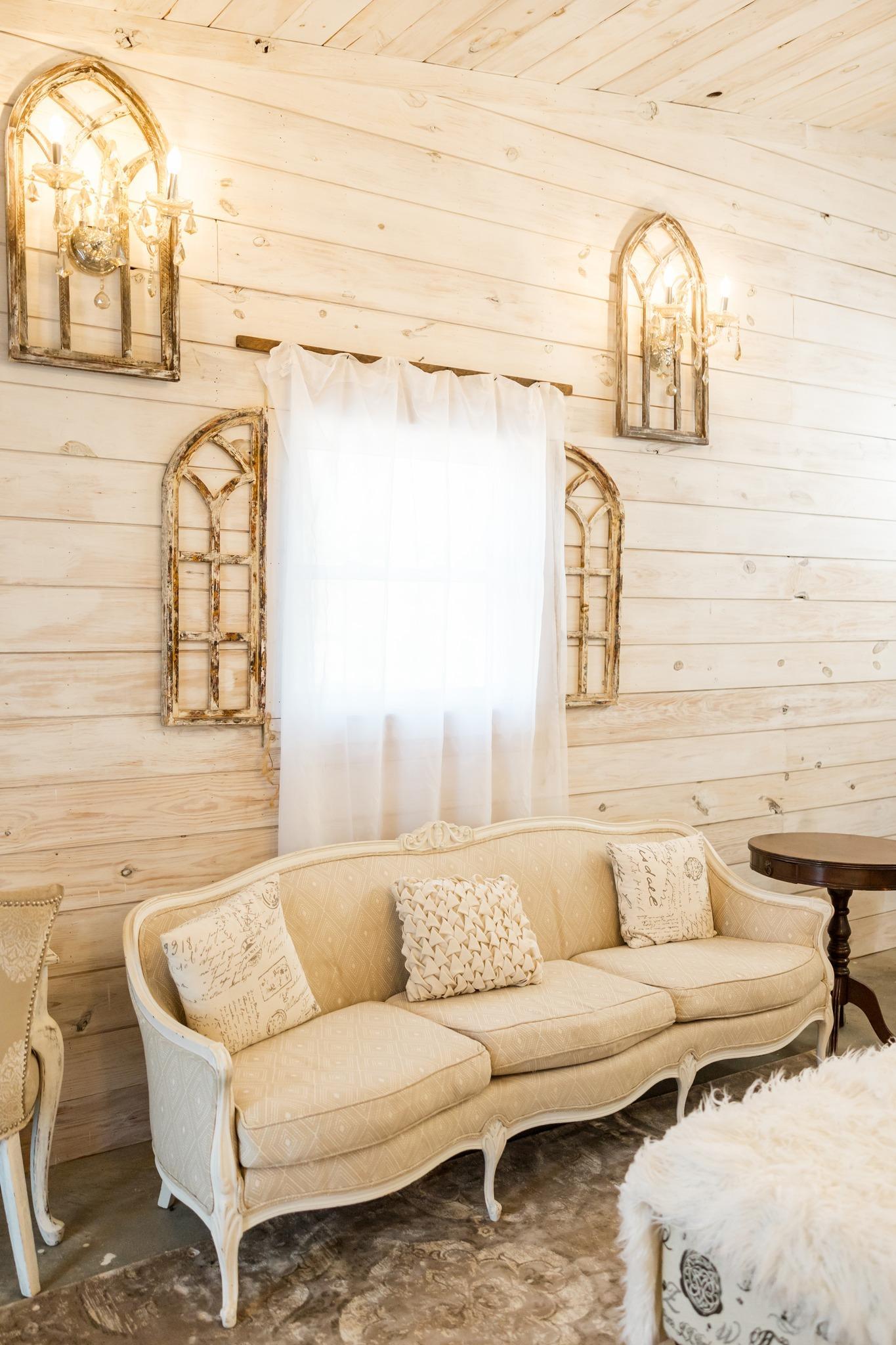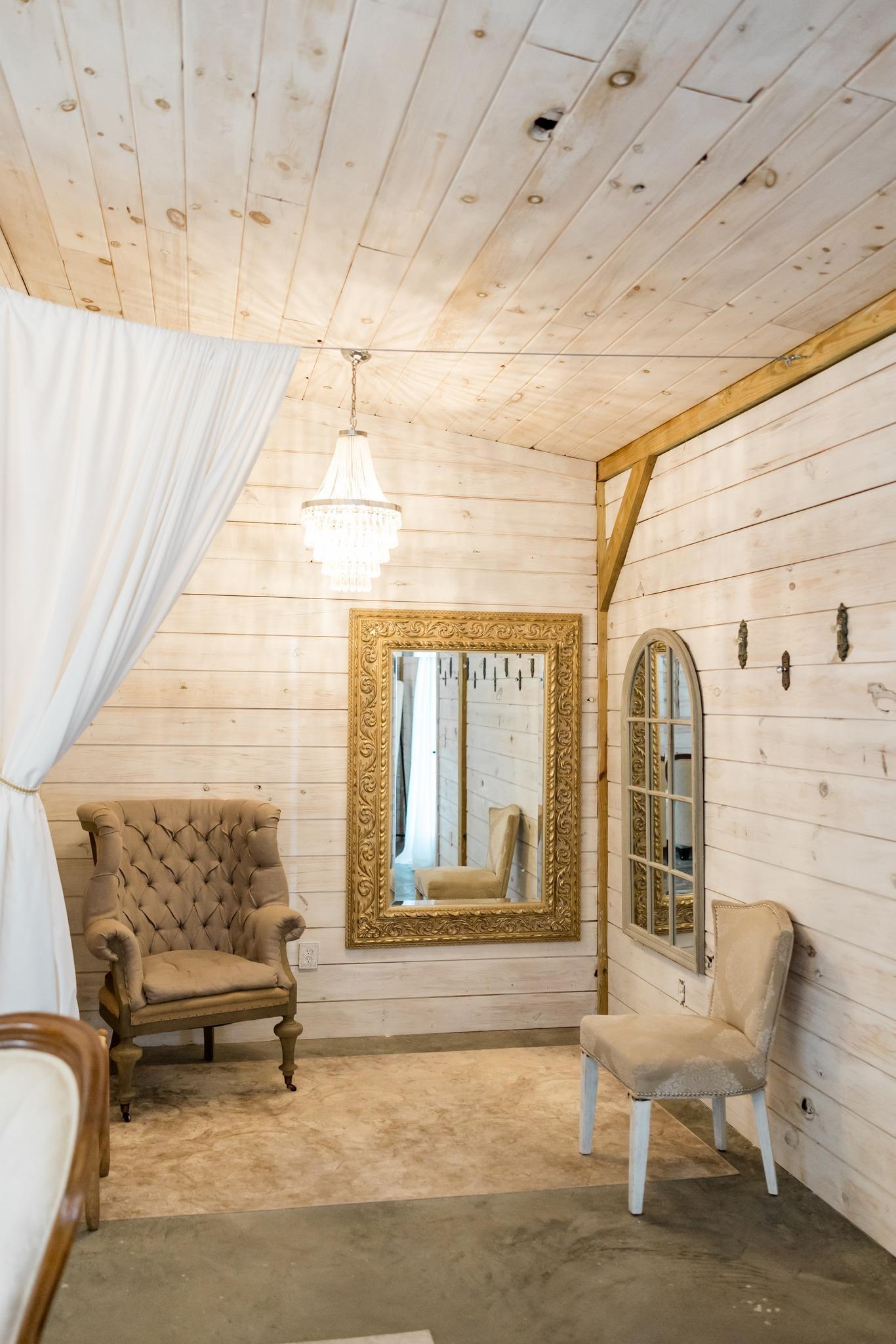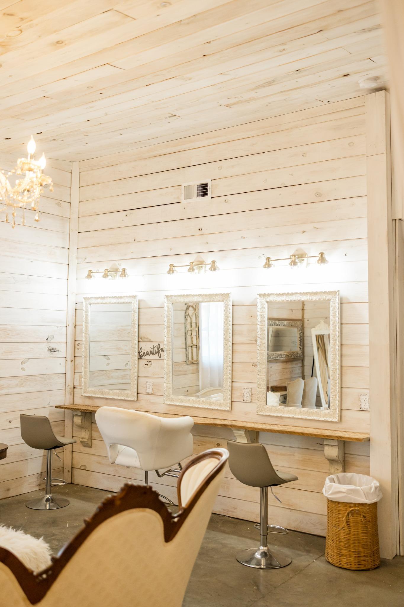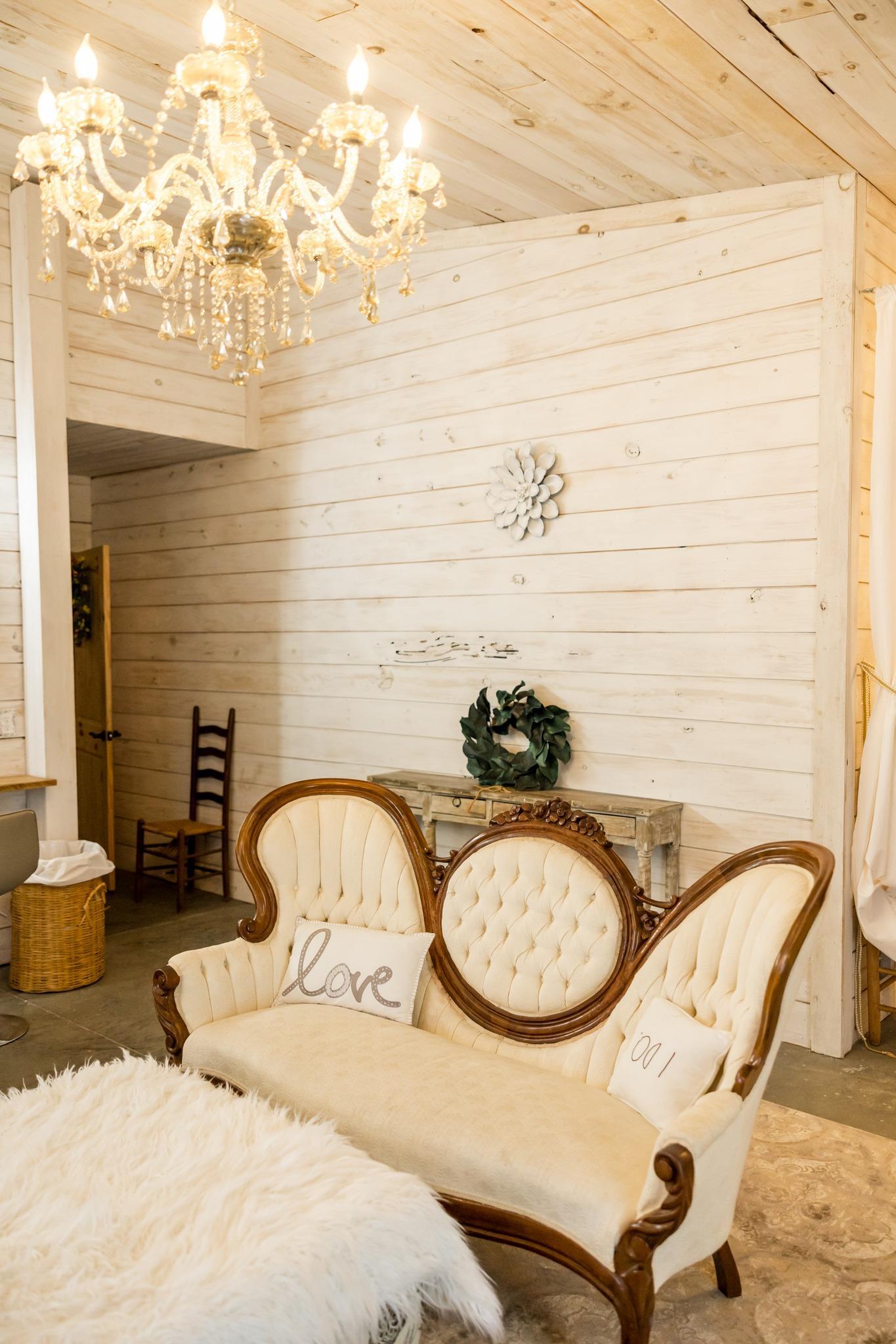This bridal suite includes two couches for sitting or lounging. Private side door and bathroom entrance. A curtain to close when getting ready. A hair and makeup station with mirrors and chairs. Complete with a touch of southern charm!
