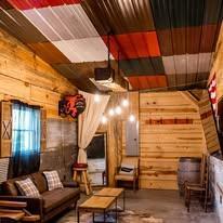 The grooms quarters includes a curtain and mirror to get dressed. A wall mounted roku tv, several neon signs, a couch for sitting or lounging and a table with some chairs.