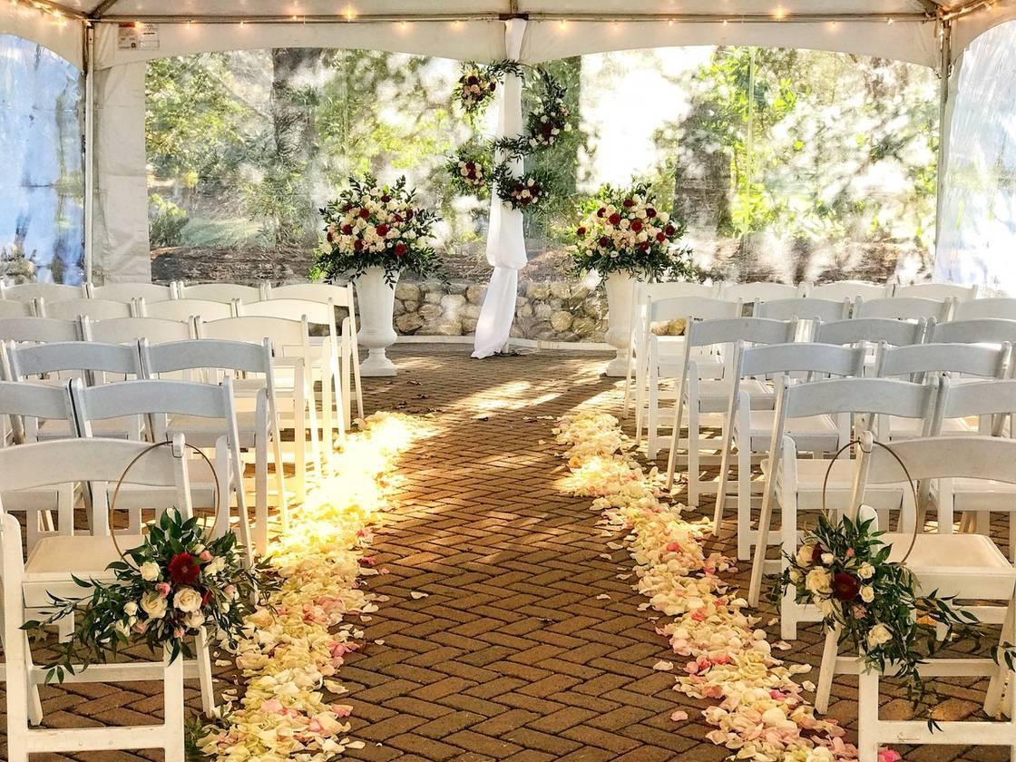 Couples can have outdoor ceremonies for their wedding at The Ridge Club just off the stunning patio and under the magnificent tent. This open-air space shelters couples from the elements while still allowing for the light and scenery of an outdoor affair. With brick underfoot, this space is top-of-the-line classic elegance. Inside, couples will find a garden-inspired ballroom. This space has high ceilings and grand windows looking out onto the landscaping.