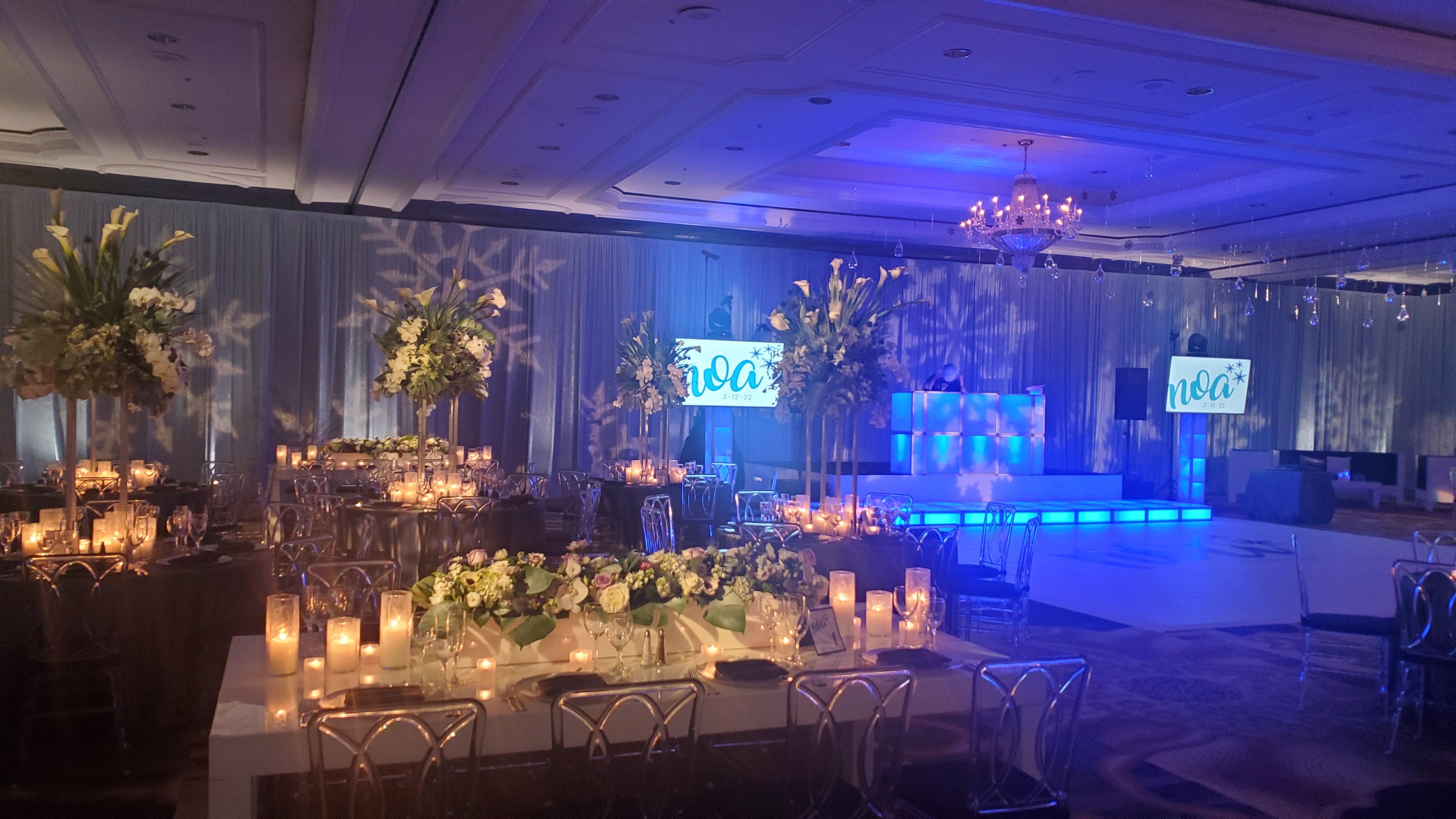 Dimmers for total lighting customization Crystal Chandeliers Wooden Dance Floor Staging Tables, banquet chairs and house linens China, glass and silverware Votive Candles