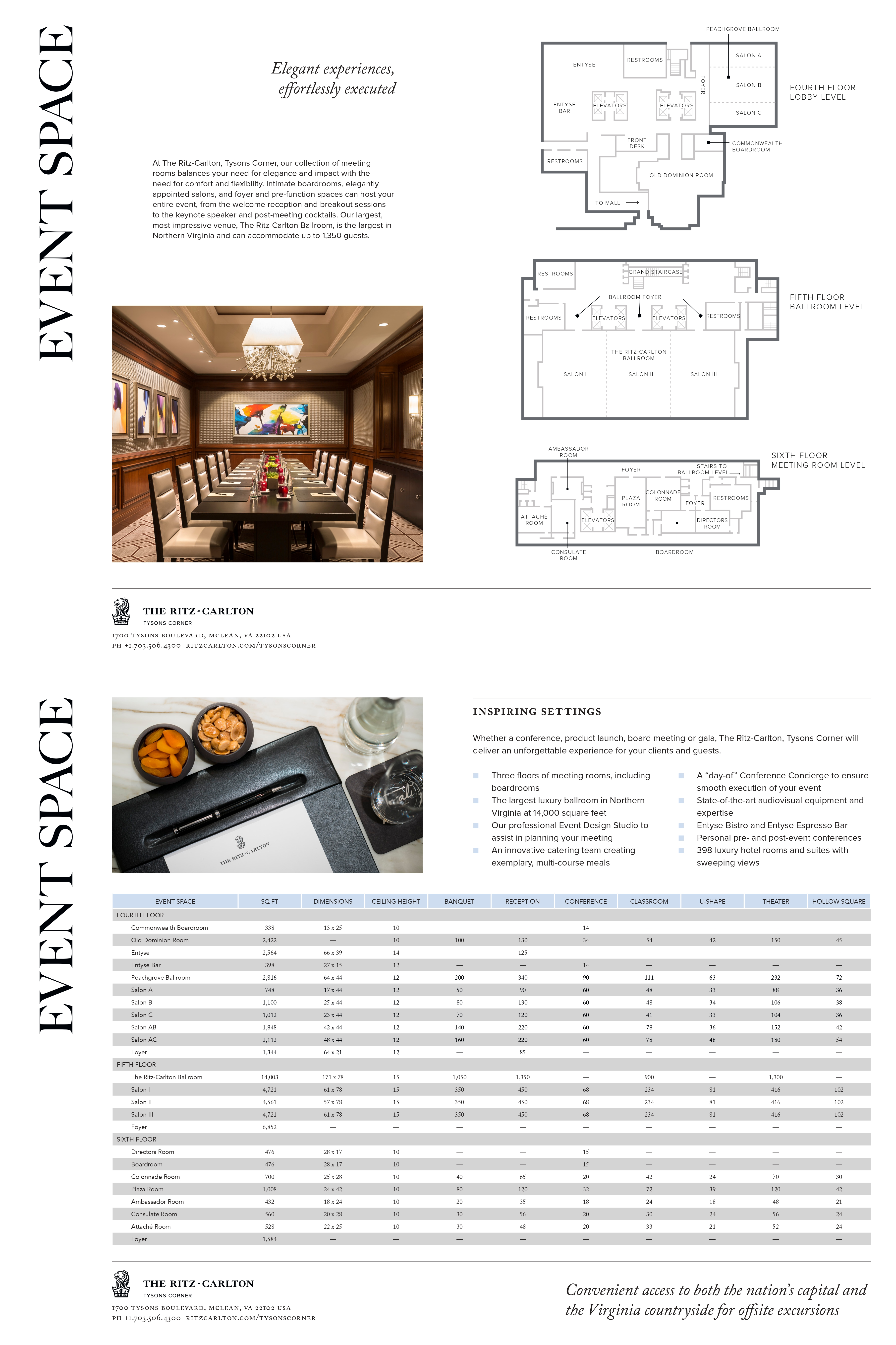 Experience the timeless elegance at the Ritz-Carlton, Tysons Corner where every moment is perfectly crafted to create memories that will last a lifetime. Our sophisticated venues offer a degree of unrivaled luxury paired with impeccable service that sets the stage for an unforgettable celebration. From intimate ceremonies to grand receptions, our dedicated team orchestrates every detail with precision and care. Elegant ballrooms with thoughtful appointments exude sophistication creating a captivating backdrop for a fairytale wedding of unmatched style. Welcome to the Ritz-Carlton, Tysons Corner where your wedding day is a masterpiece in the making.