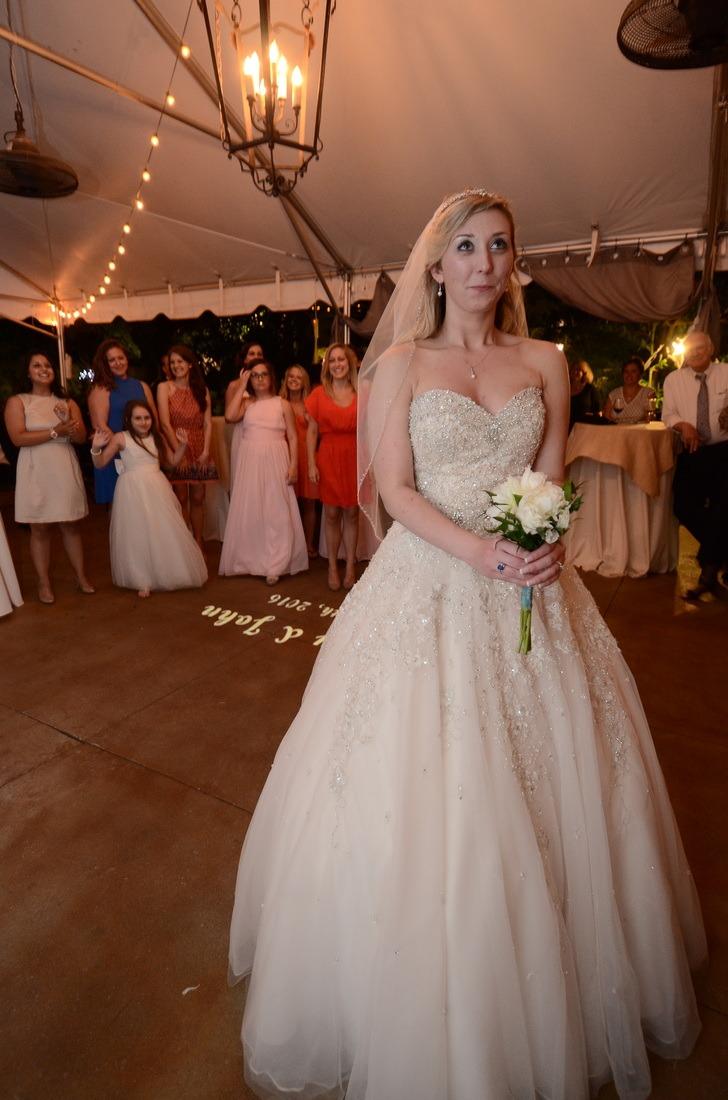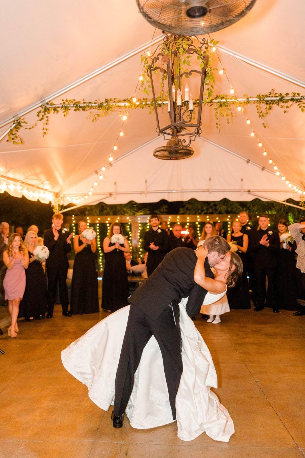 • The ceremony takes place in the garden of the River Road House, but in the case of inclement weather, we have a back up ceremony option inside the house. This house is also the bridal suite, where the bride and her bridesmaids come into on the wedding day. The ability to rent extra time before the wedding allows for a stress-free day of getting ready! There's plenty of space for hair and make-up artists to set up, and you're welcome to bring food and drinks to enjoy! • The reception takes place at the Jasmine House, and includes the use of our tent that stays up year round, complete with string lights and a greenery backdrop!