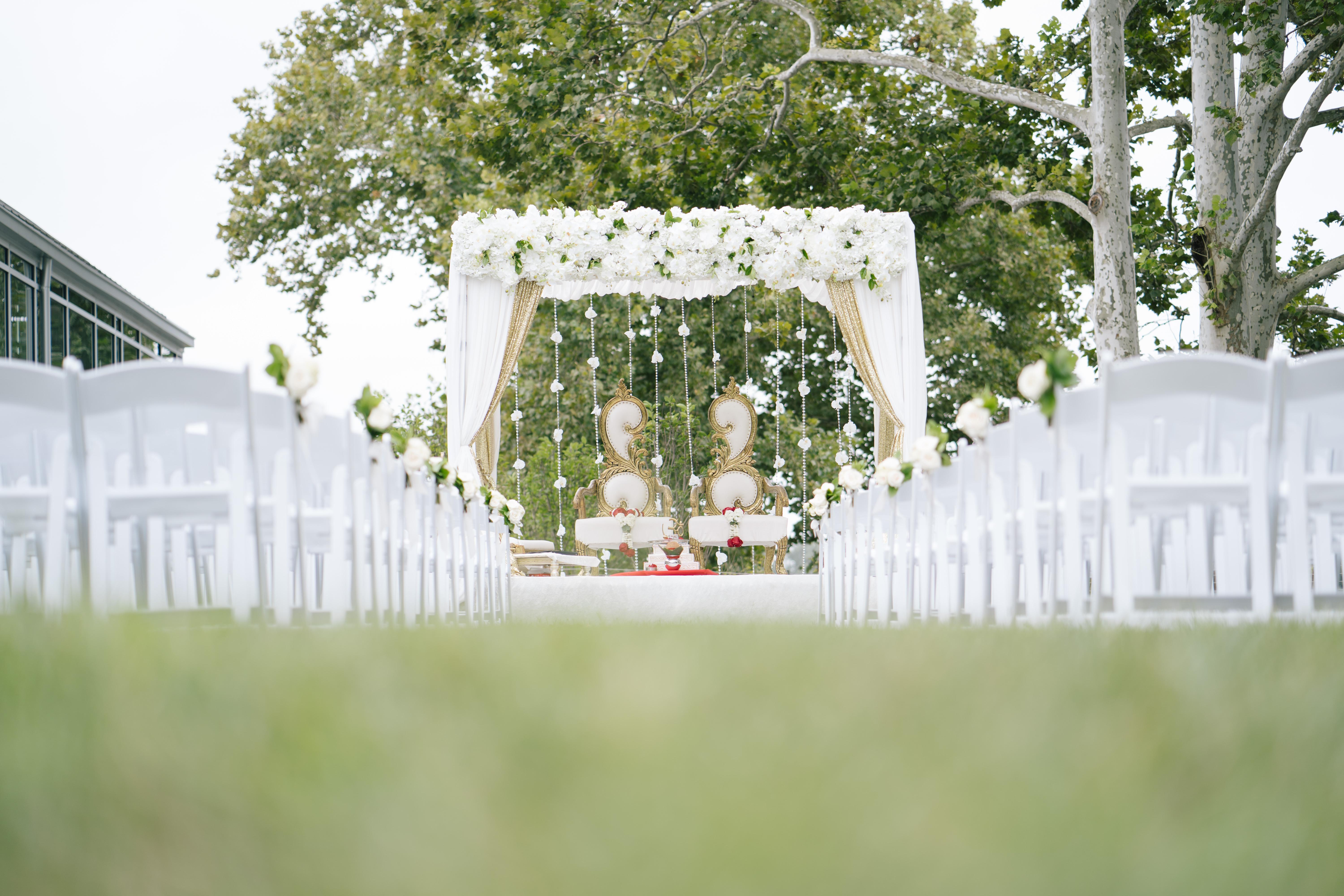 -white resin folding chairs -custom wood arch -tables as needed for ceremony
