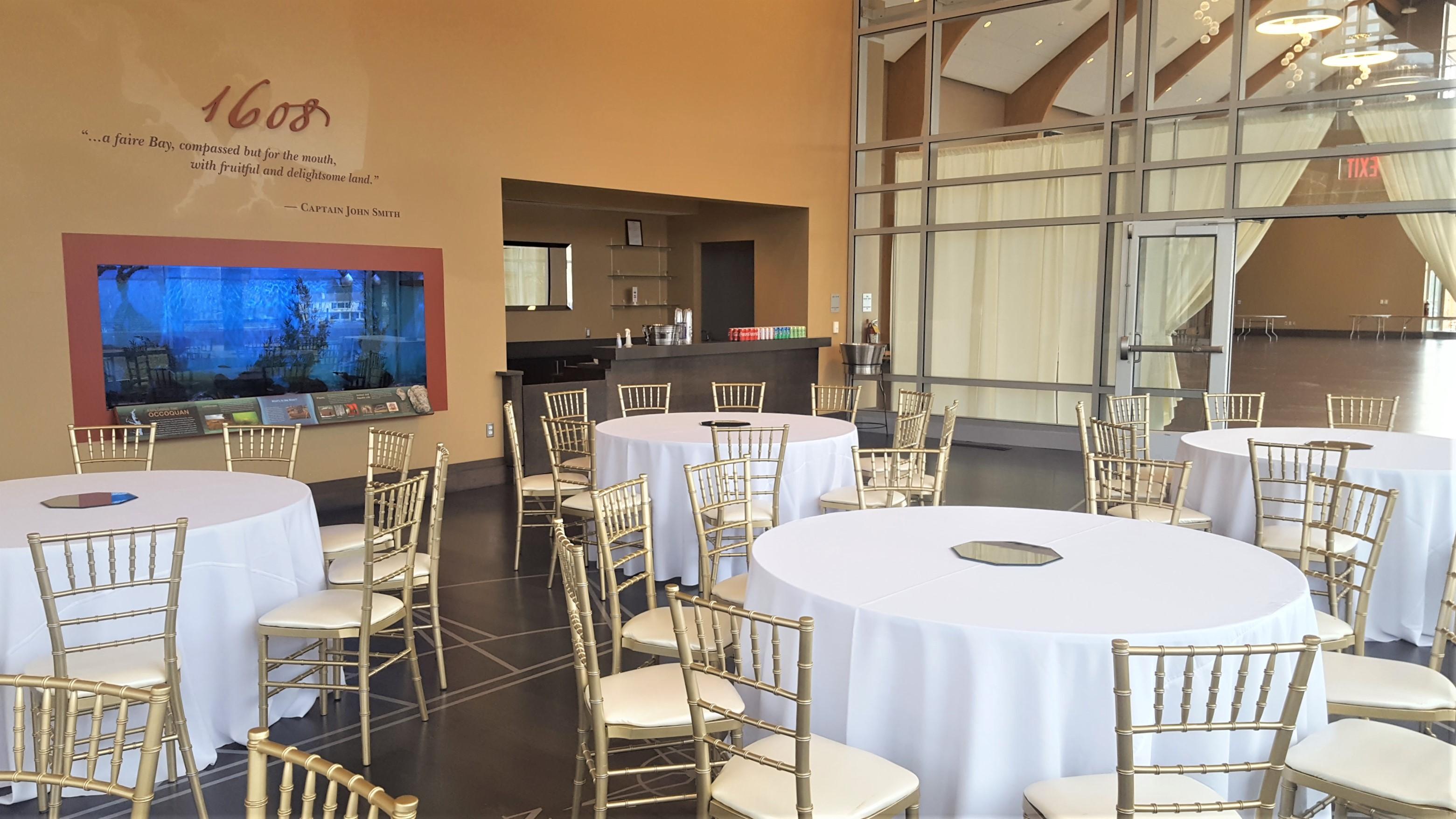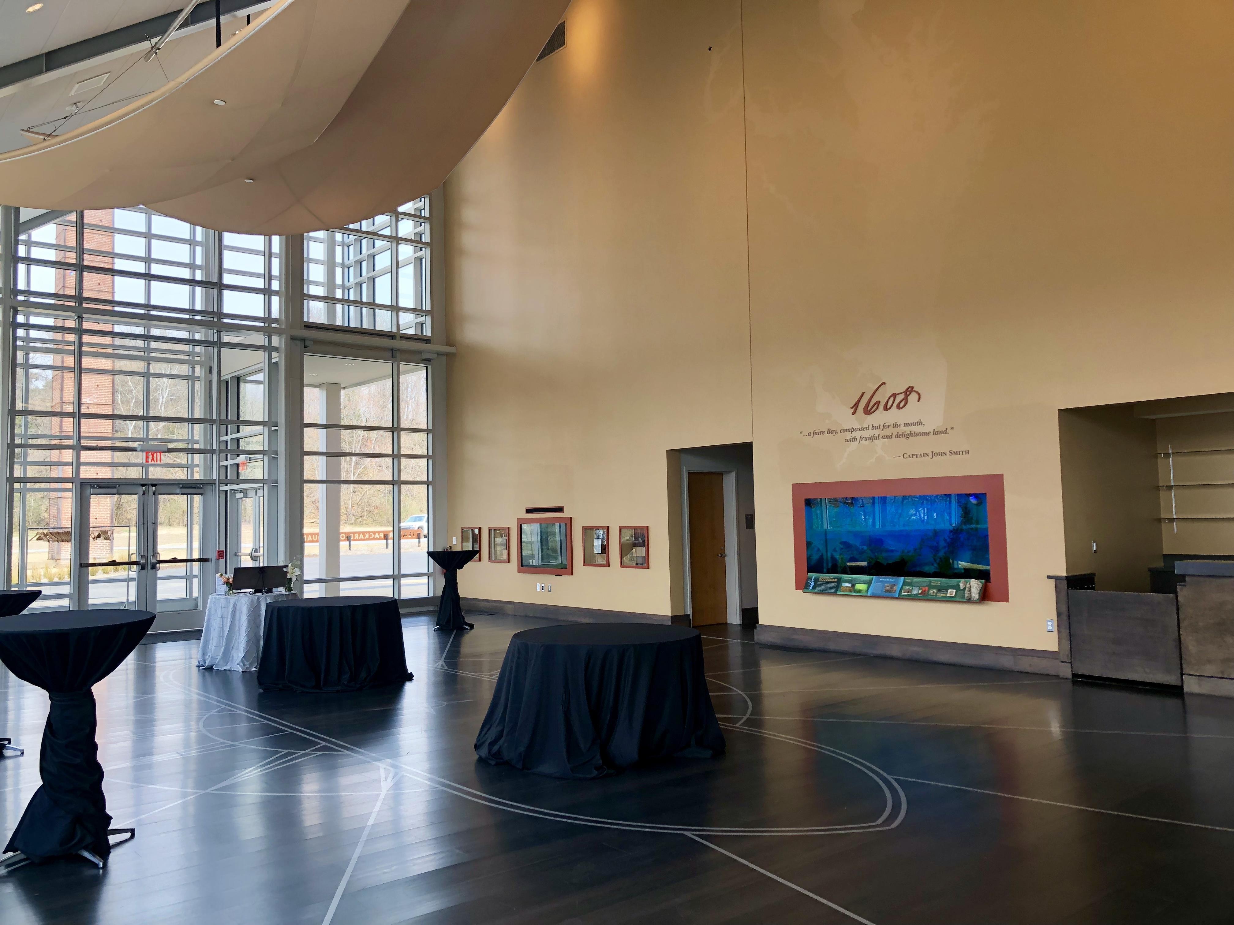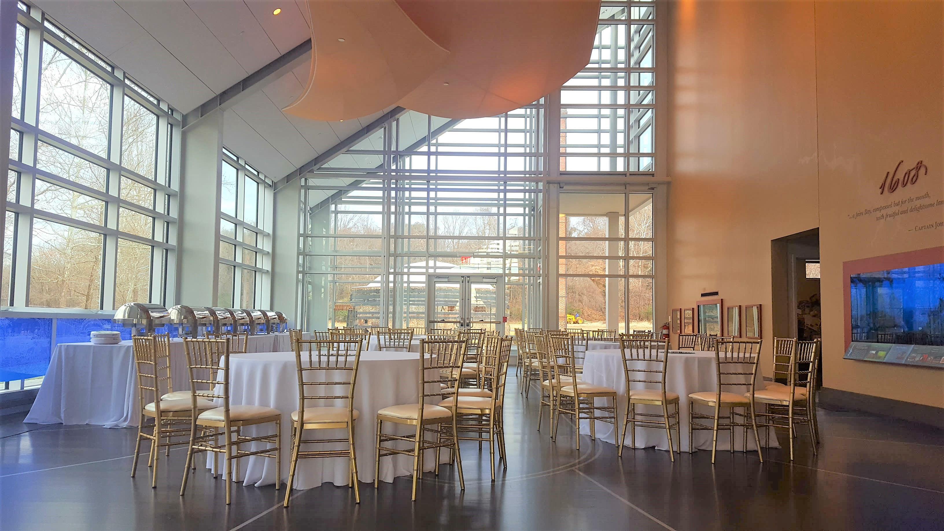Our 1608 Room features interpretive elements of John Smith's voyage up the river in 1608. As our facility is located in a regional park, we love to educate guests on the history of the area. This spaces serves as the cocktail and appetizer area for your event. Adjacent to the ceremony lawn, it is easy to find.