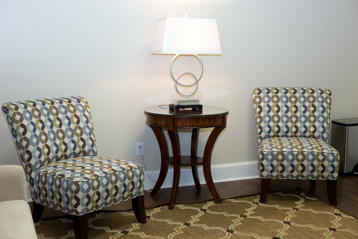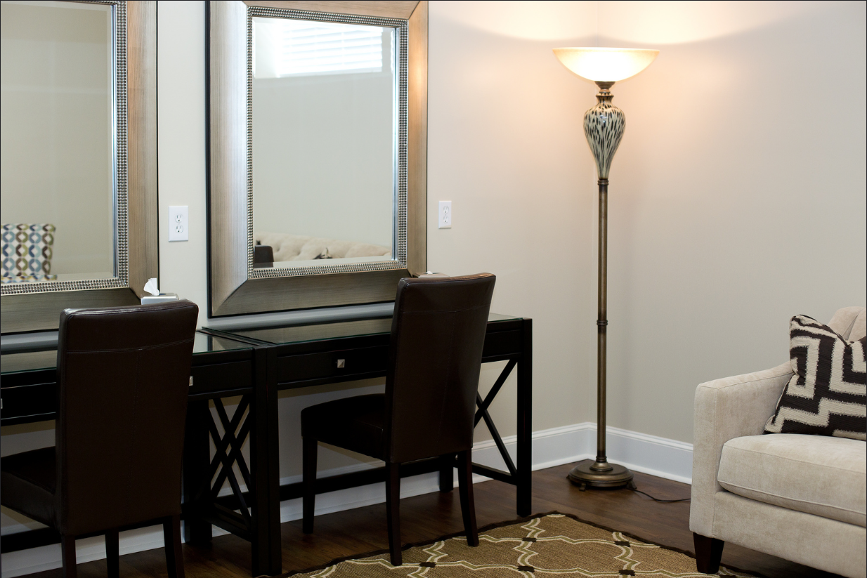 The Bride's room is available for wedding events and is equipped with additional lighting, mirrors, and comfortable stylish seating for the bridal party.