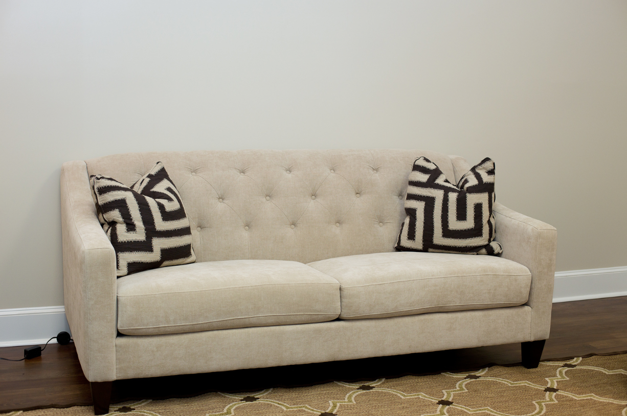 Vanities with mirrors, sofa and chairs.