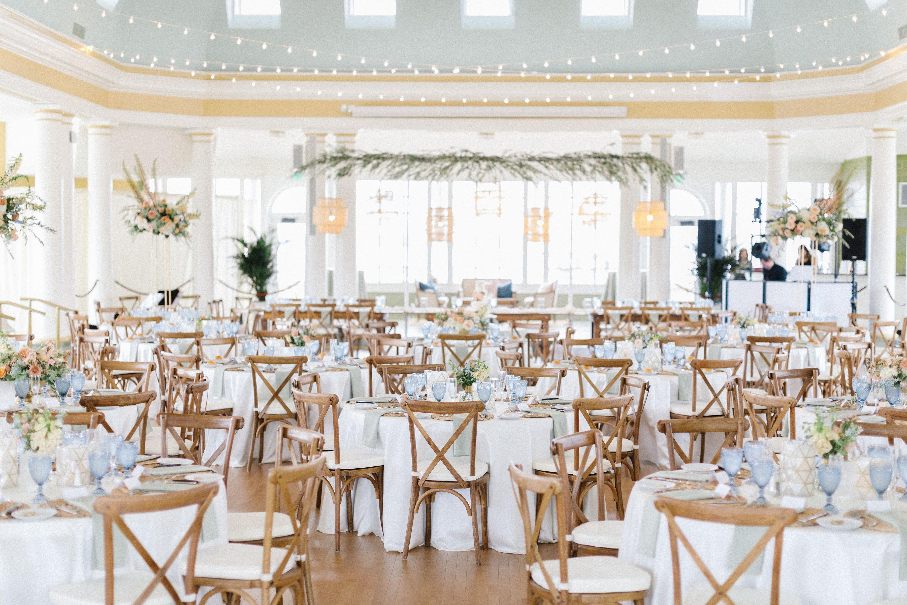 - 60" Dining Tables accommodating 8 guests per table - 8ft banquet tables - 4ft round for cake or sweetheart table - Up to 280 banquet chairs - Dimmers to create a customized lighting experience - Built in wood dance floor - Built-in screen, projector and audio system - Set up and break down of tables and chairs