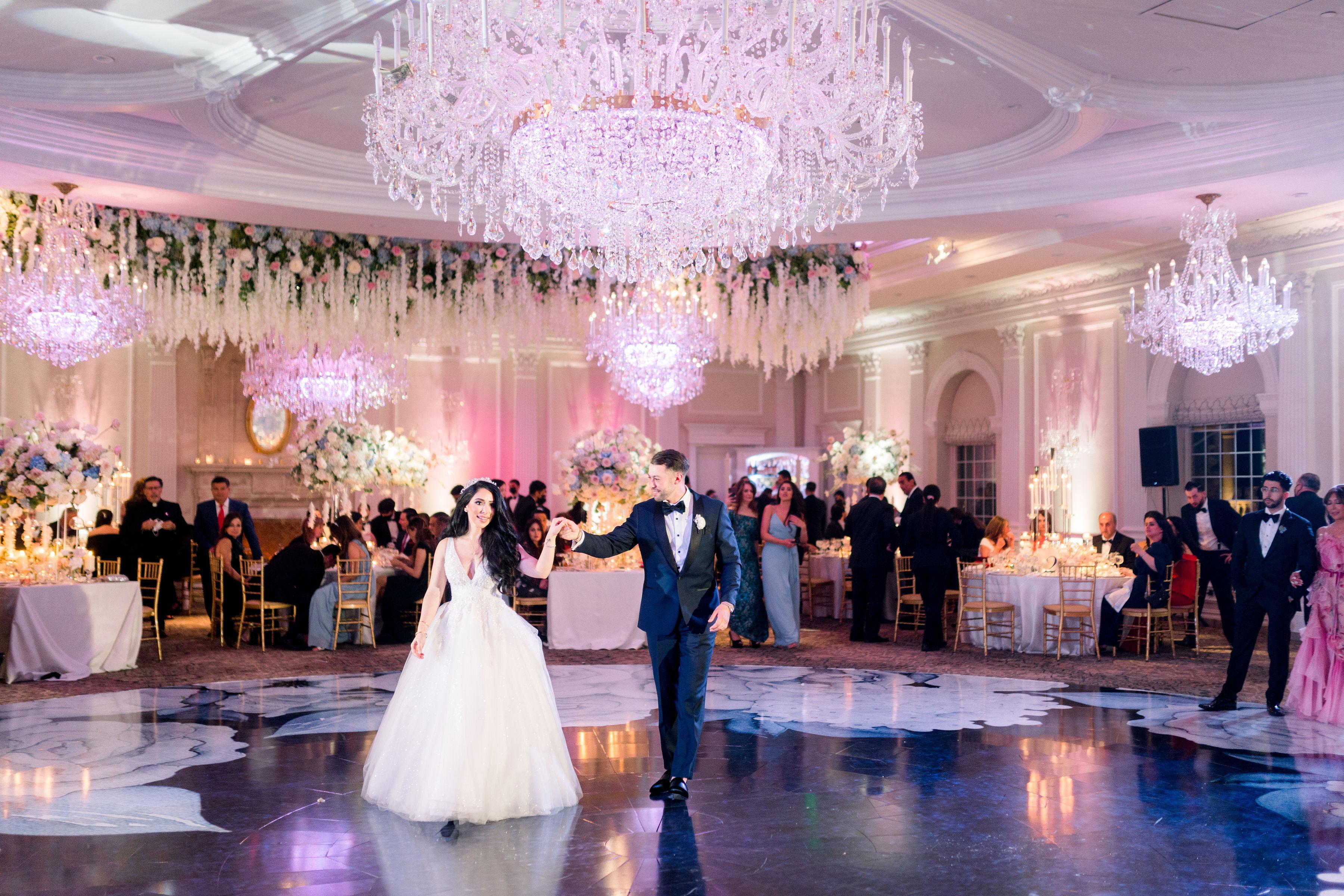 Exquisite ballroom featuring crystal chandeliers, detailed wainscoting, Palladian windows, marble dance floor, LED lighting and an atmosphere of elegance.