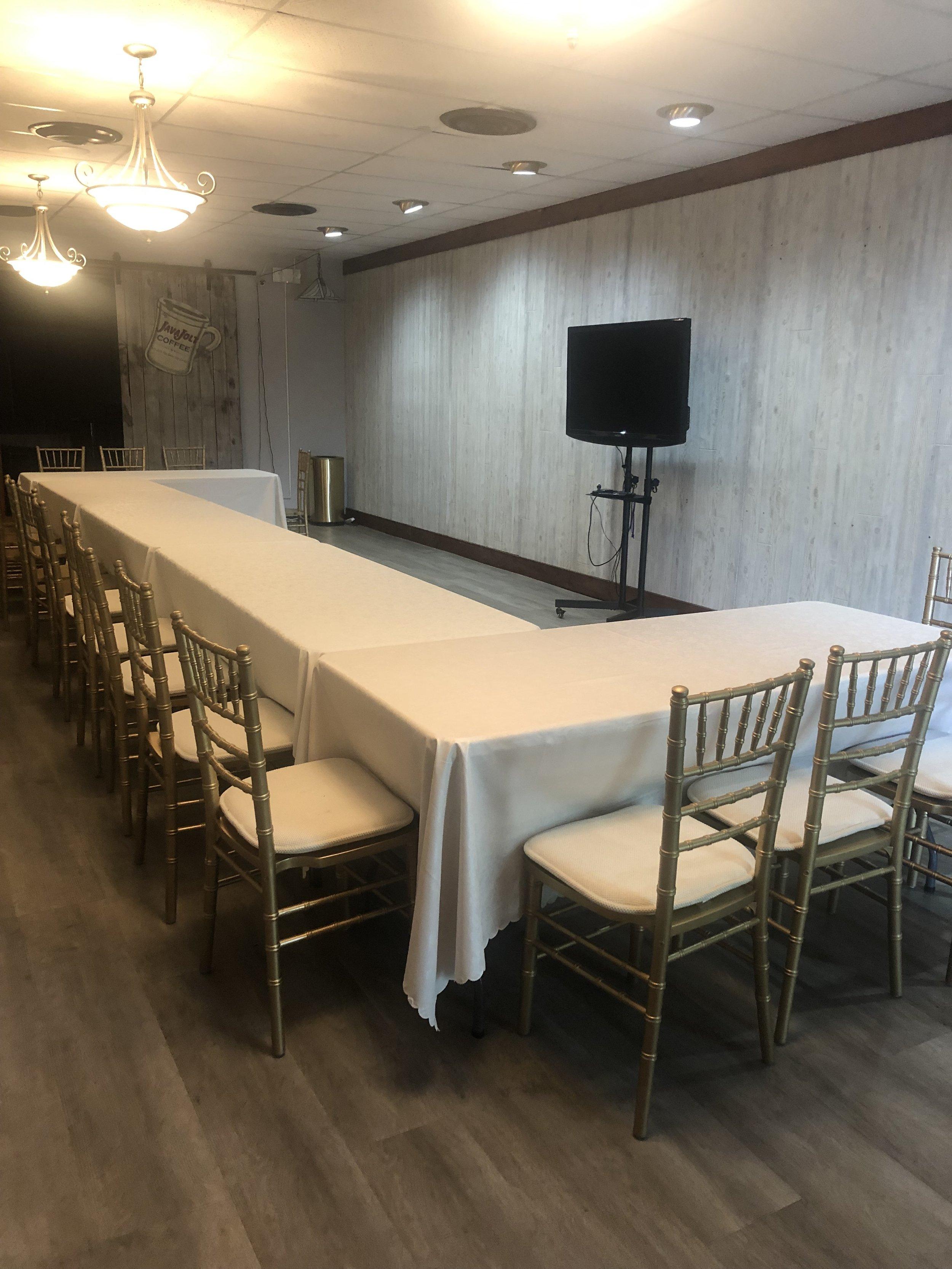 The Belmont Room has it's own private entrance, a small fully operating bar, bathroom access, wifi, a television for display needs, heat/ac.