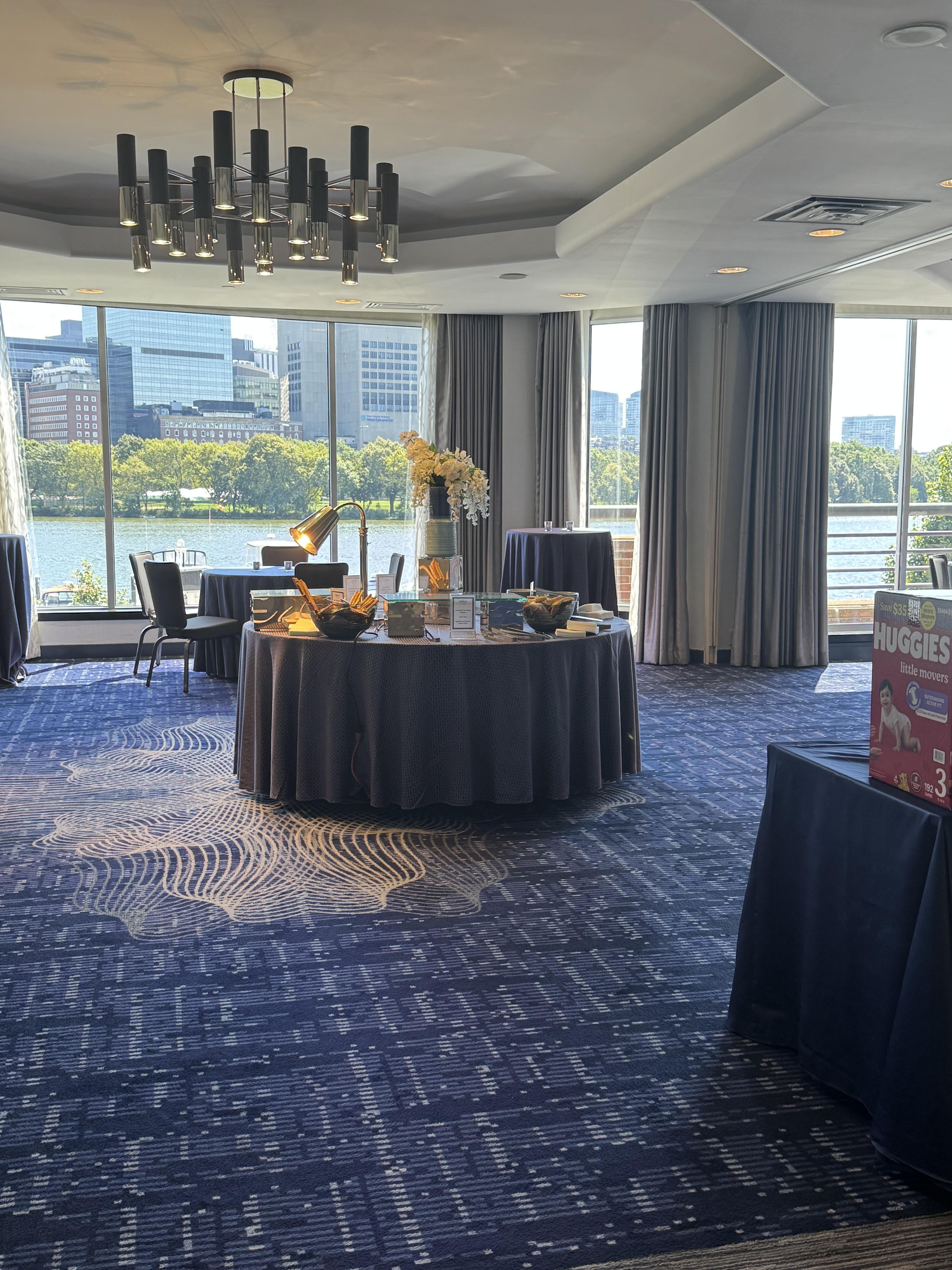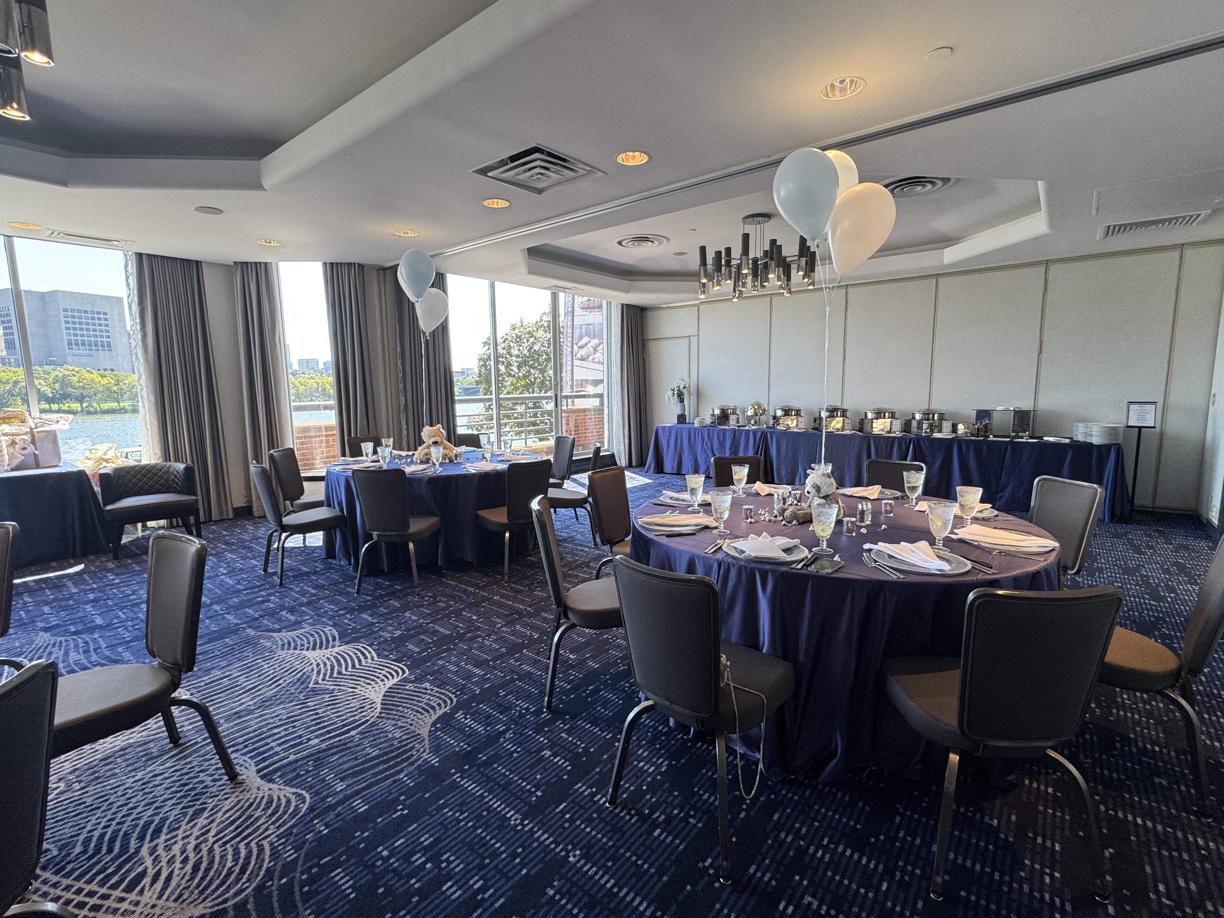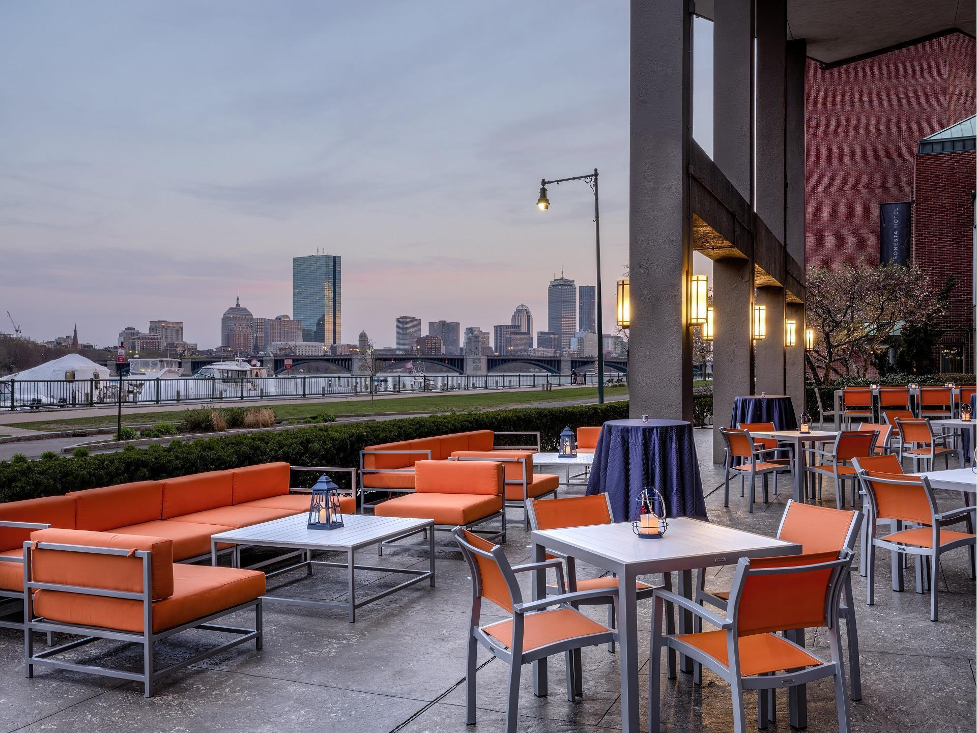 - Elegant linens: ivory, silver, navy. - Stylish tables, chairs, service ware, votives. Riser/stage & dance floor. - Chic backlit mirrors enhance space. - Breathtaking Charles River views. - Grand foyer with scenic river vistas.