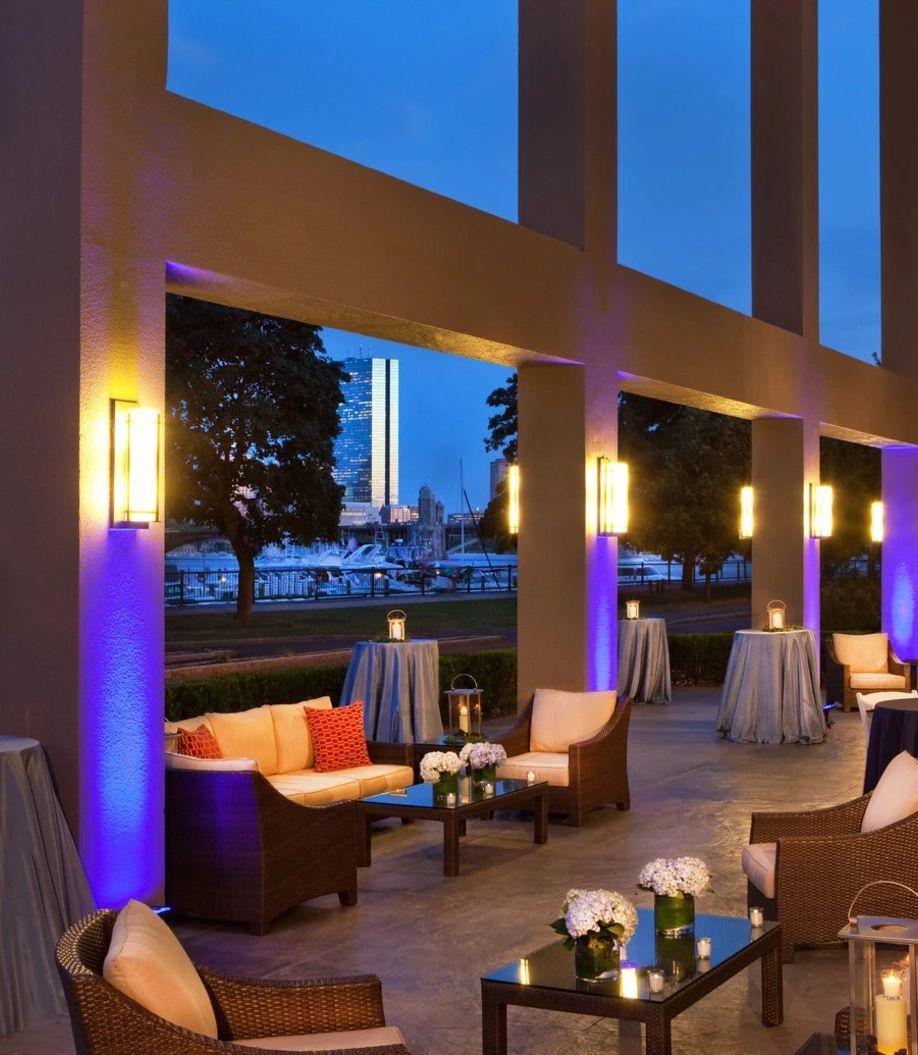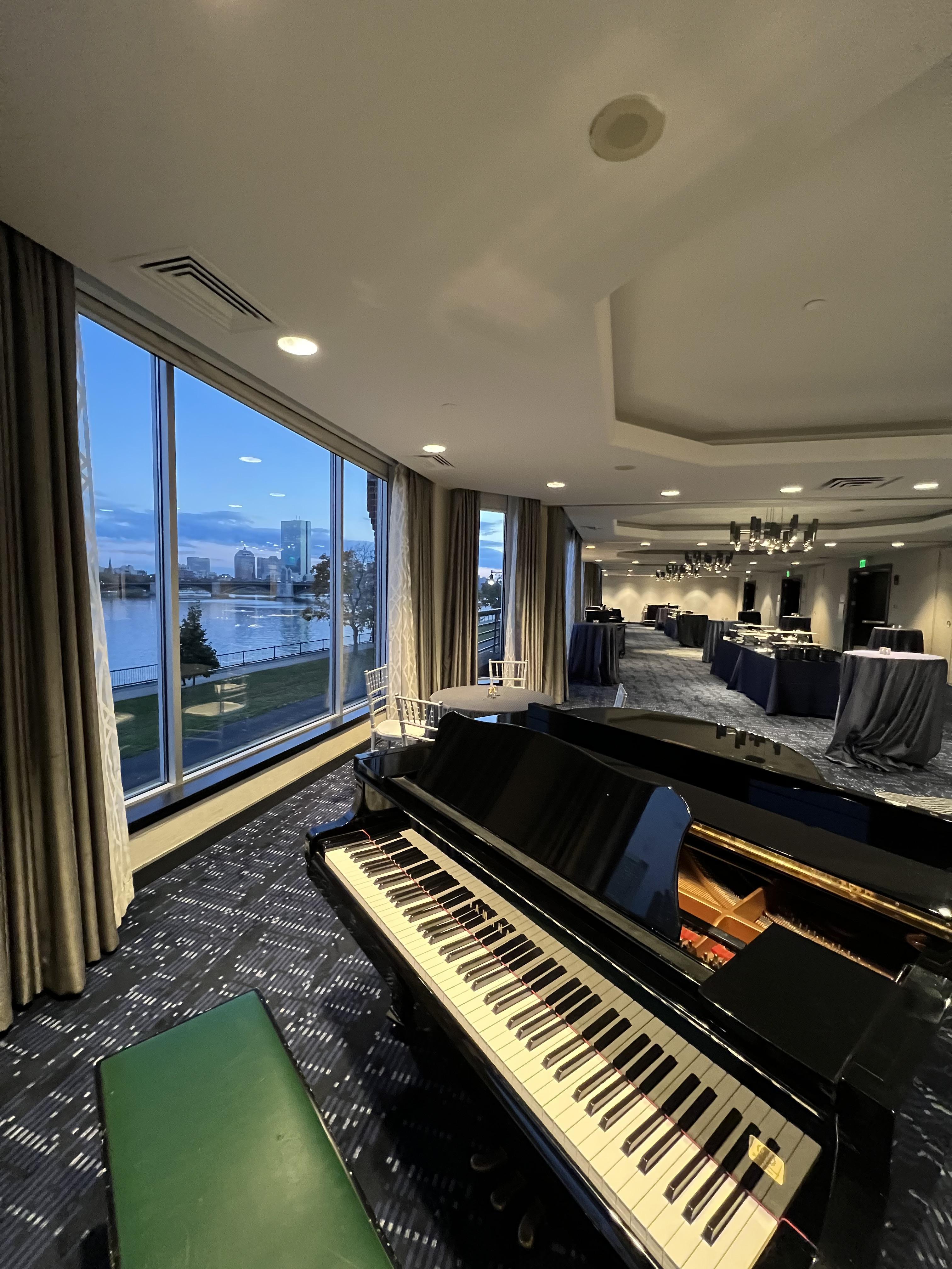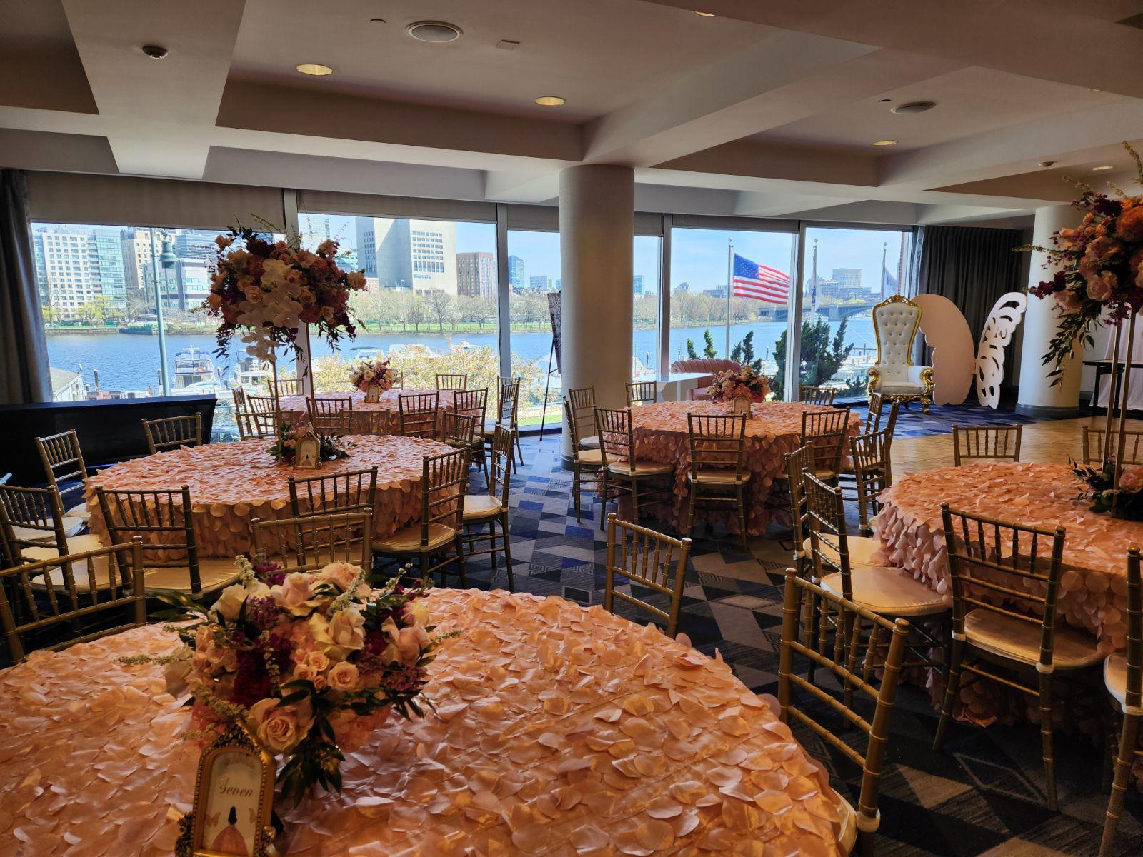 - Elegant linens: ivory, silver, navy. - Stylish tables, chairs, service ware, votives. Riser/stage & dance floor. - Chic backlit mirrors enhance space. - Breathtaking Charles River views. - Grand foyer with scenic river vistas.