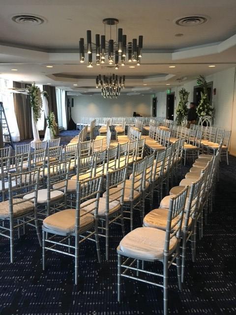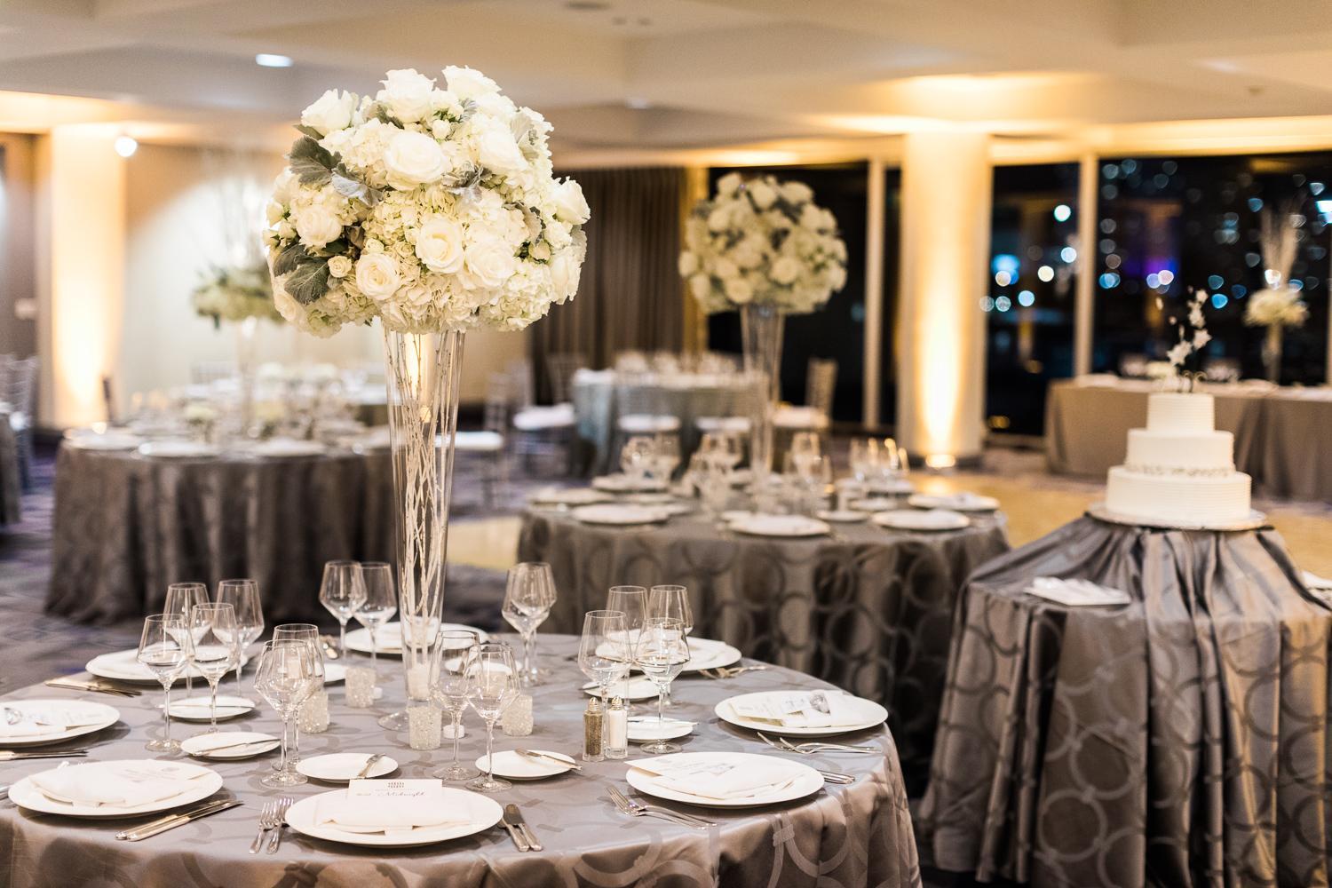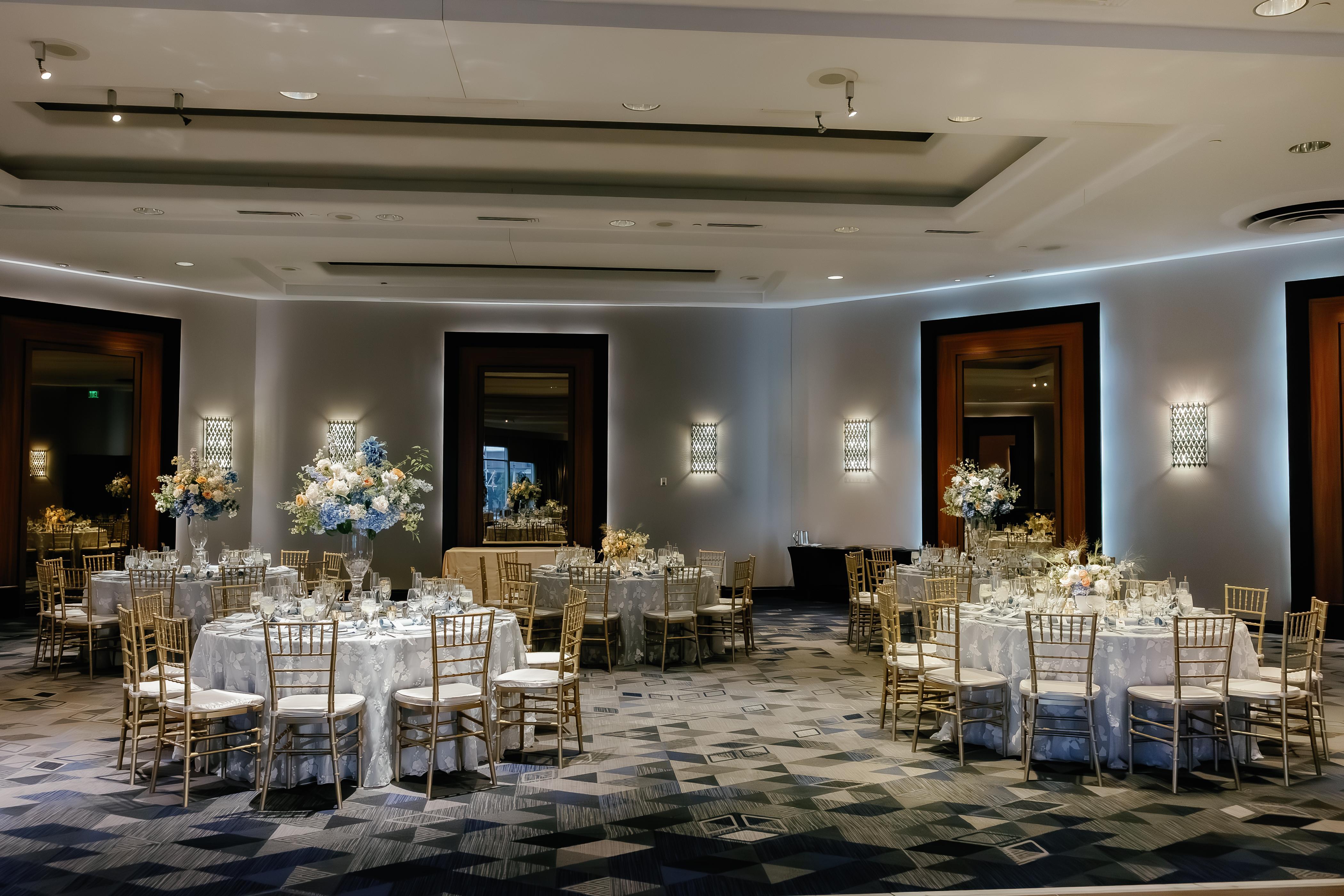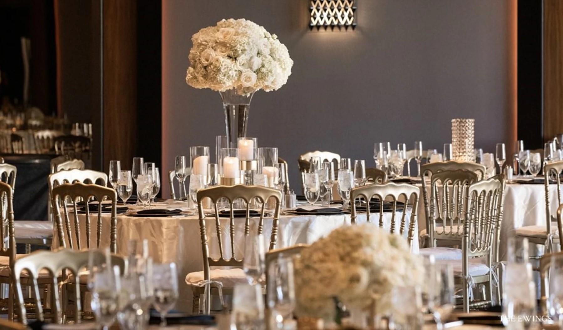 - Elegant linens: ivory, silver, navy - Stylish tables, chairs, service ware, votives - Dimmable chandeliers - Breathtaking views