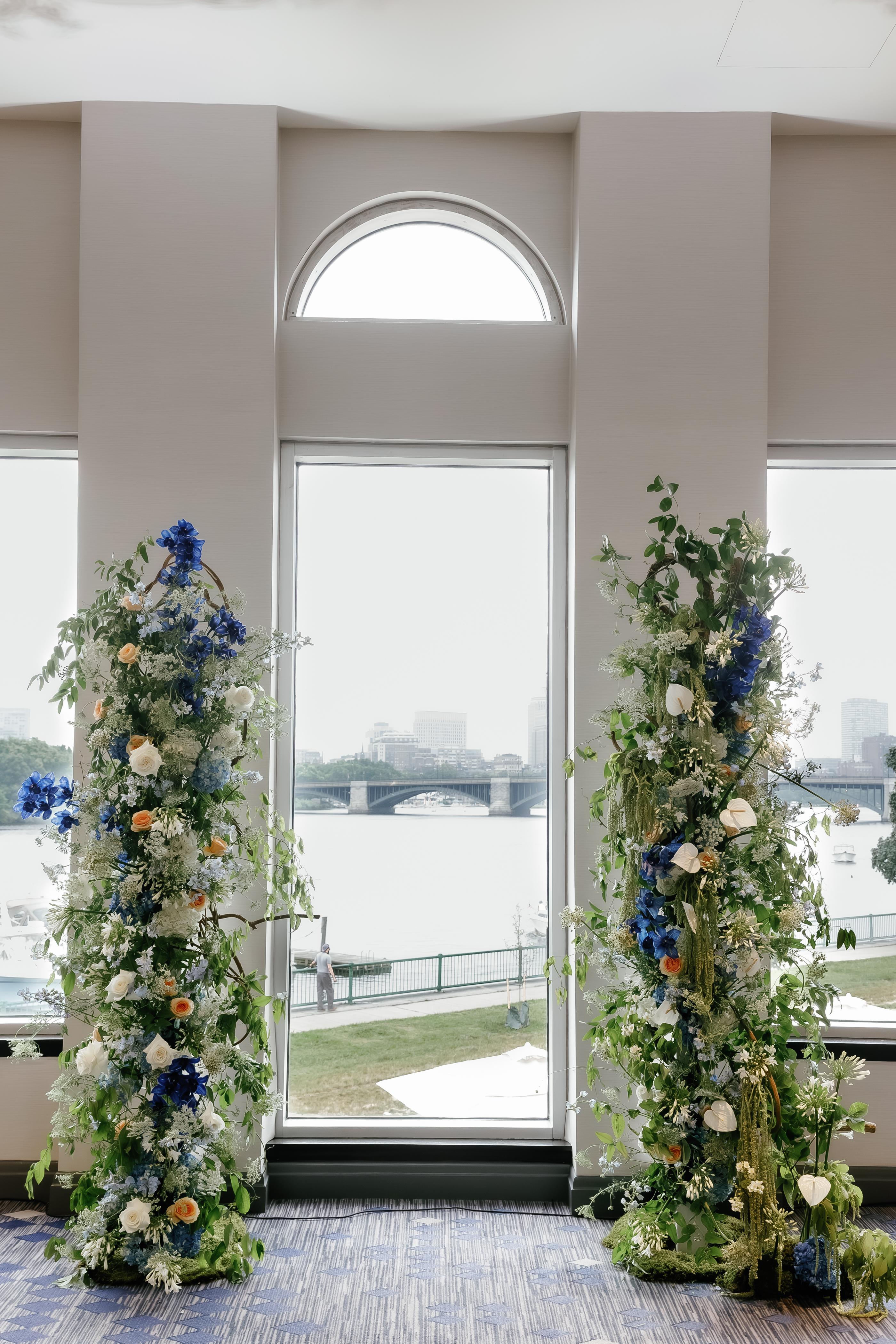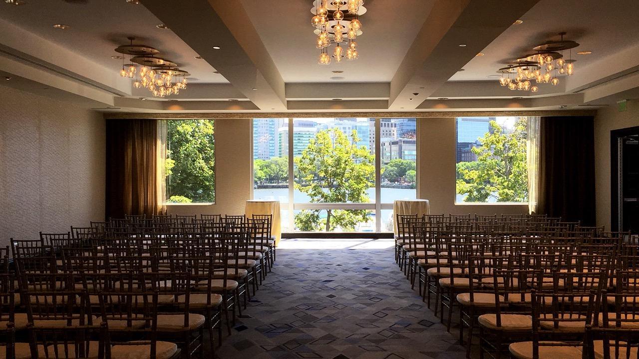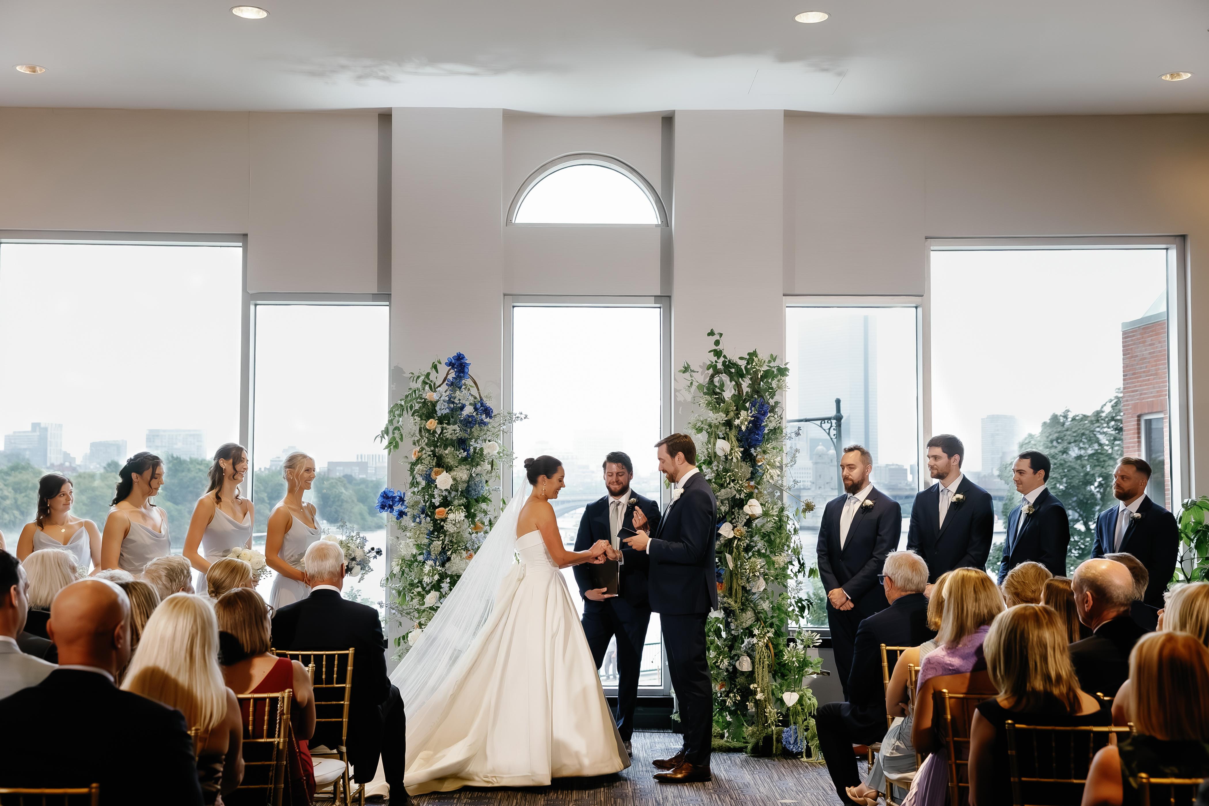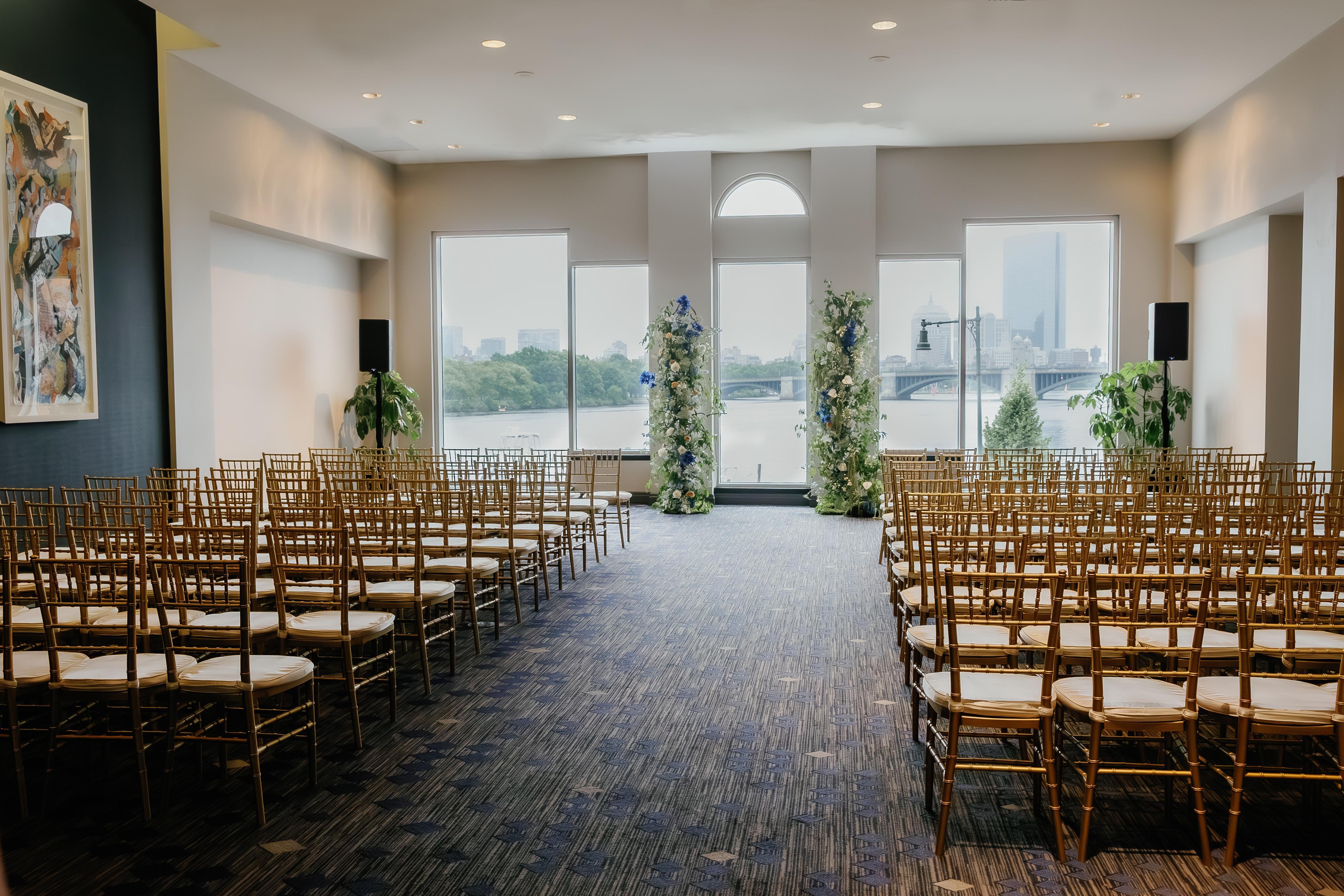 This space features large windows overlooking the Charles River and the Boston skyline, creating a stunning backdrop for a wedding ceremony.