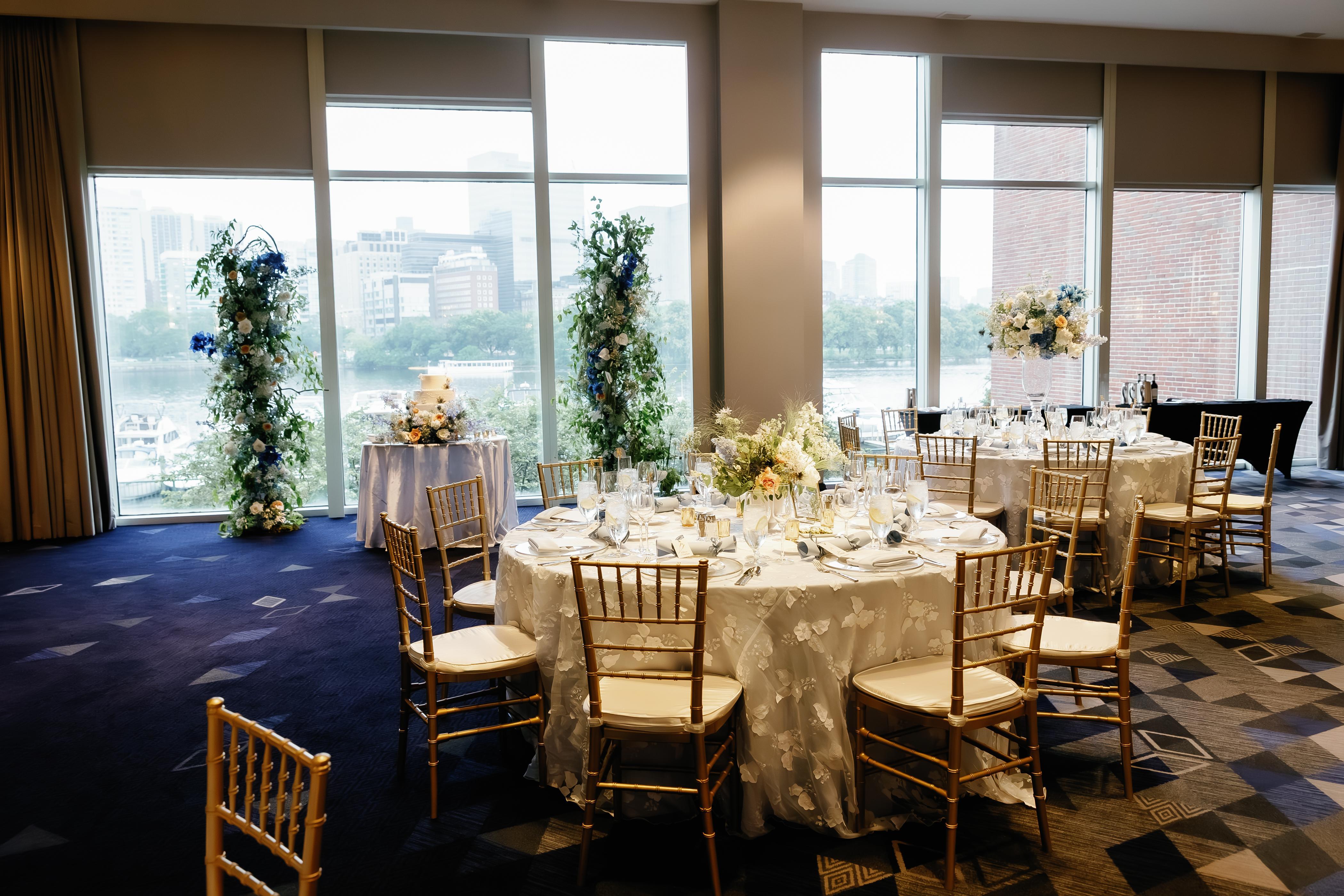 The Riverfront Ballroom is the perfect venue for an intimate wedding dinner of up to 140 guests. The room has a cozy, luxurious feel with its floor-to-ceiling windows offering stunning views of the Charles River and the Boston skyline.