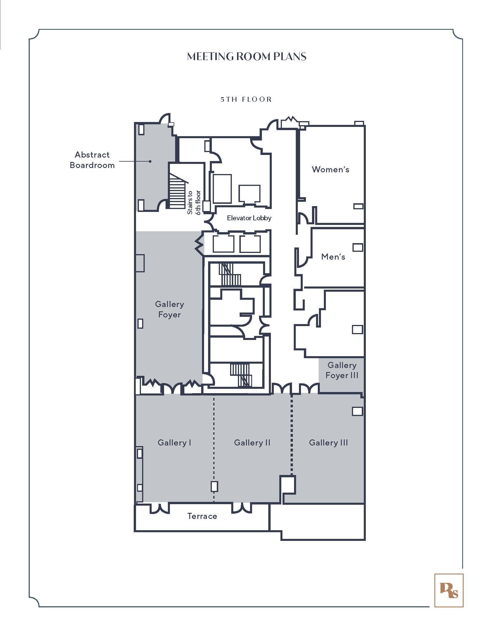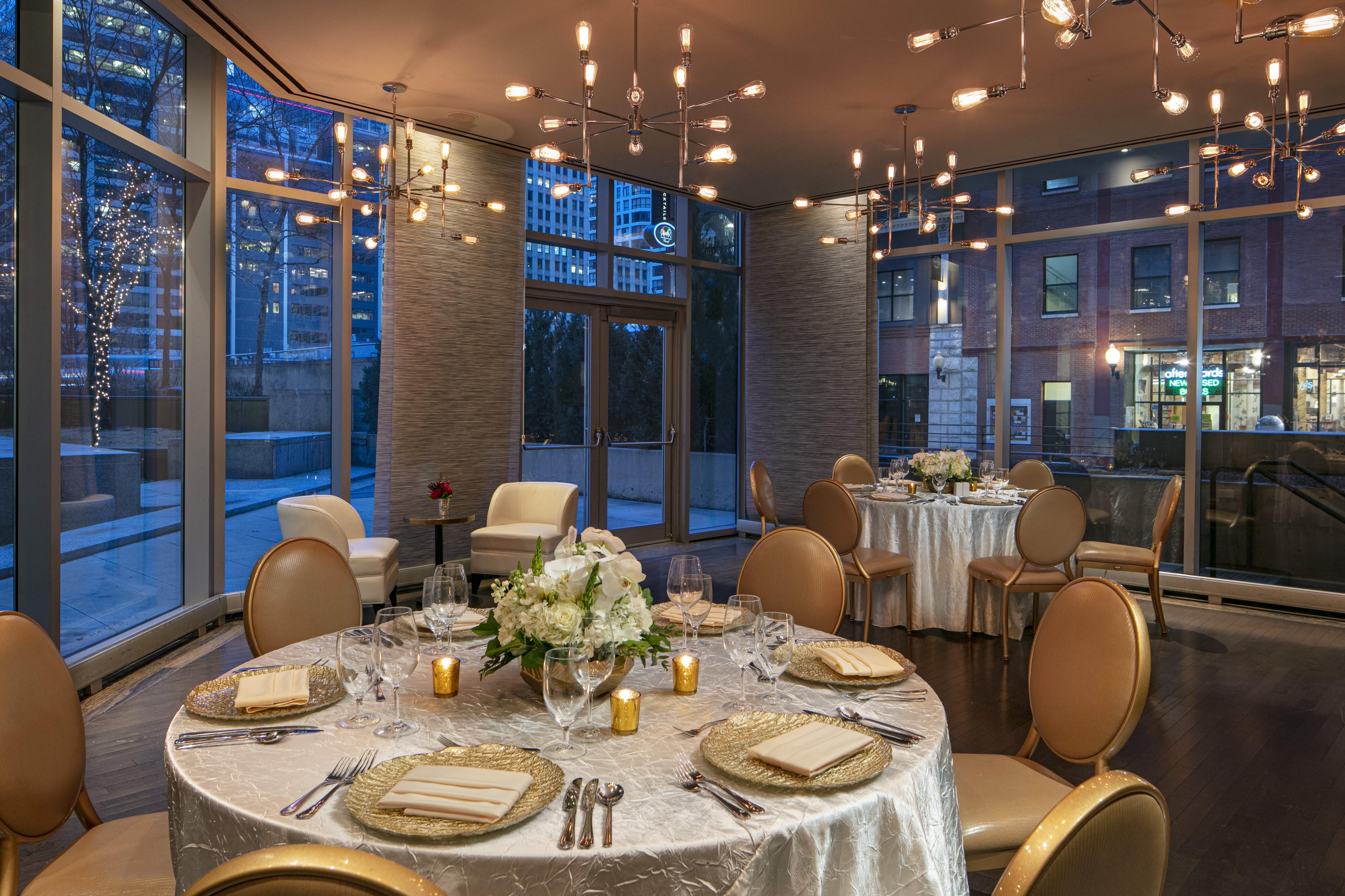 The Gallery Ballroom features natural light and sparkling chandeliers. A unique feature is the outdoor terrace, a perfect cityscape backdrop for photos.