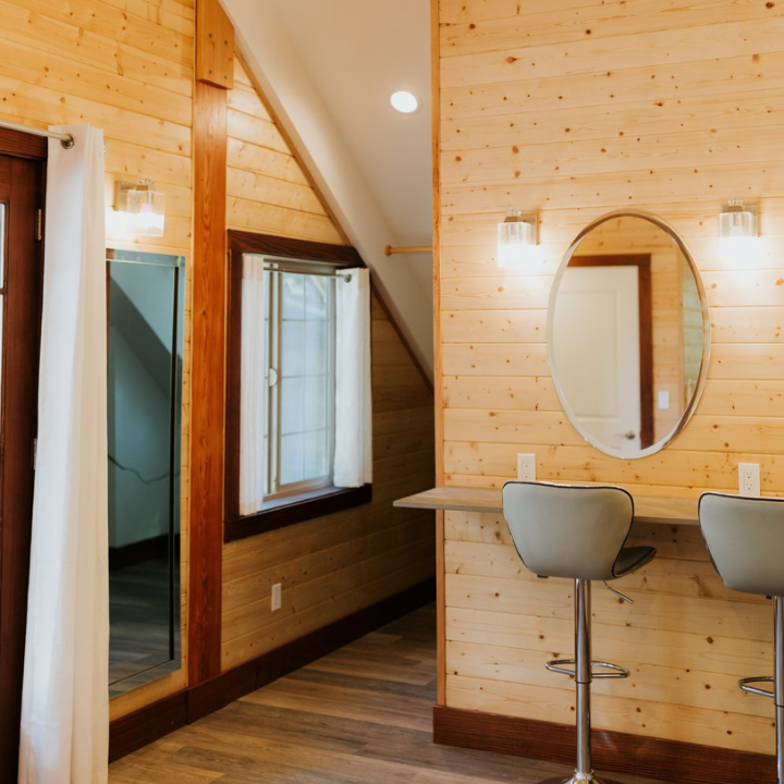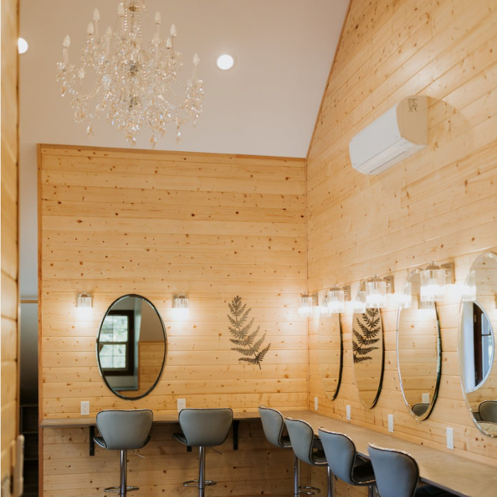 For weddings the women will be getting ready in a private loft including a bathroom, balcony, a/c and heat, mini fridge, two full size mirrors, seating area with sneak peek window overlooking the ceremony area and five complete stations that each have their own mirror, lighting and outlets for all the hot tools needed for that perfect look.