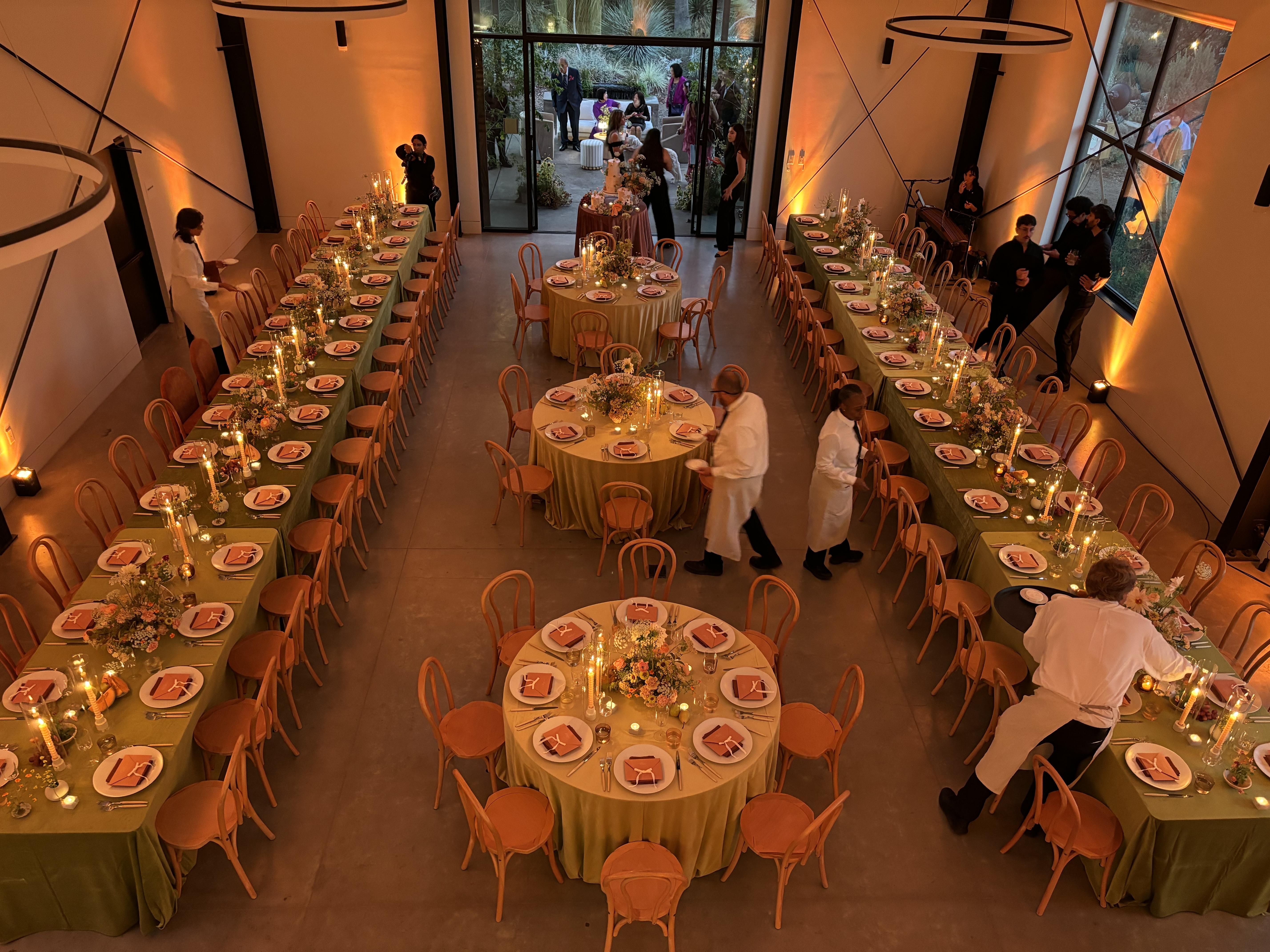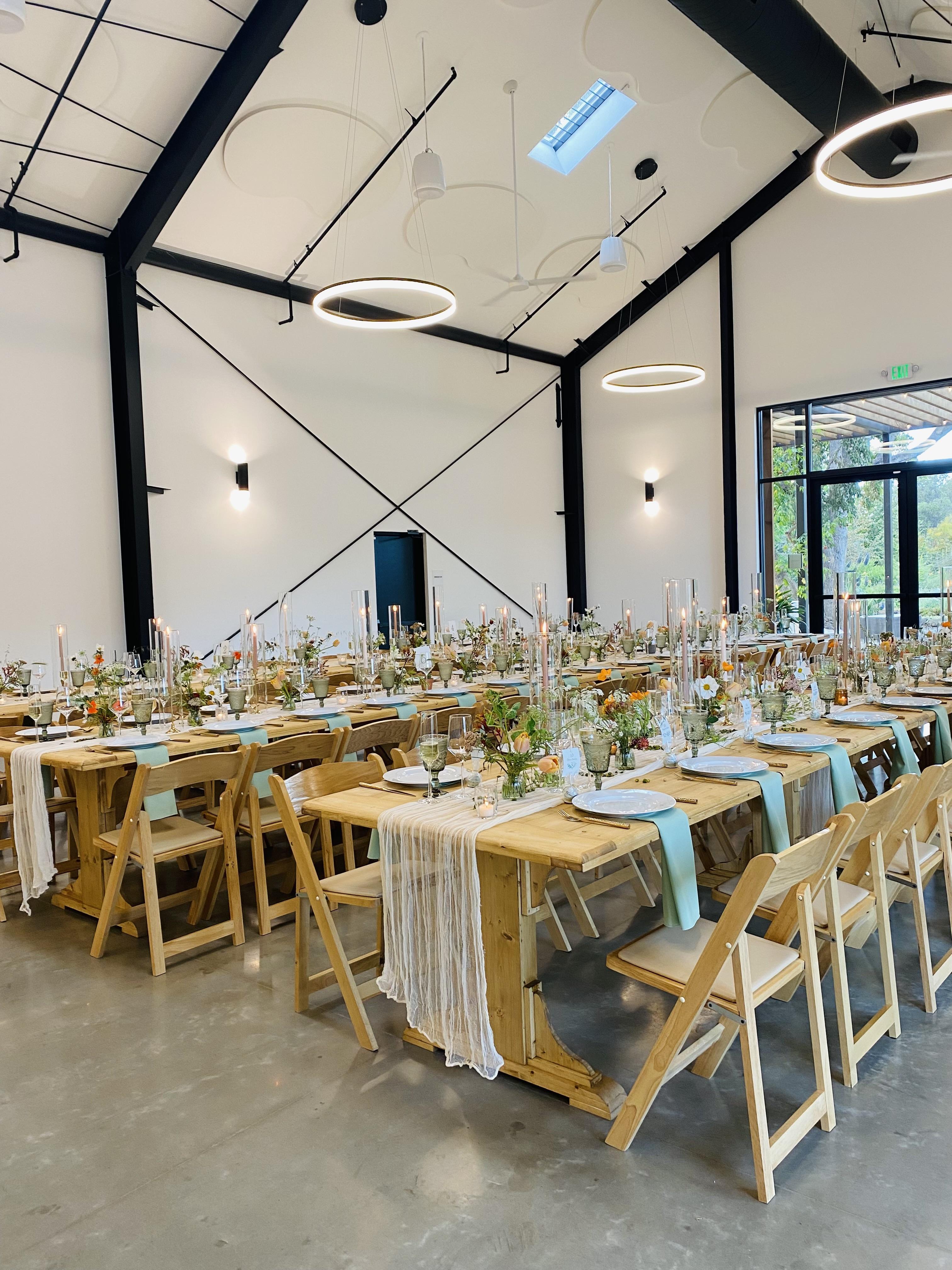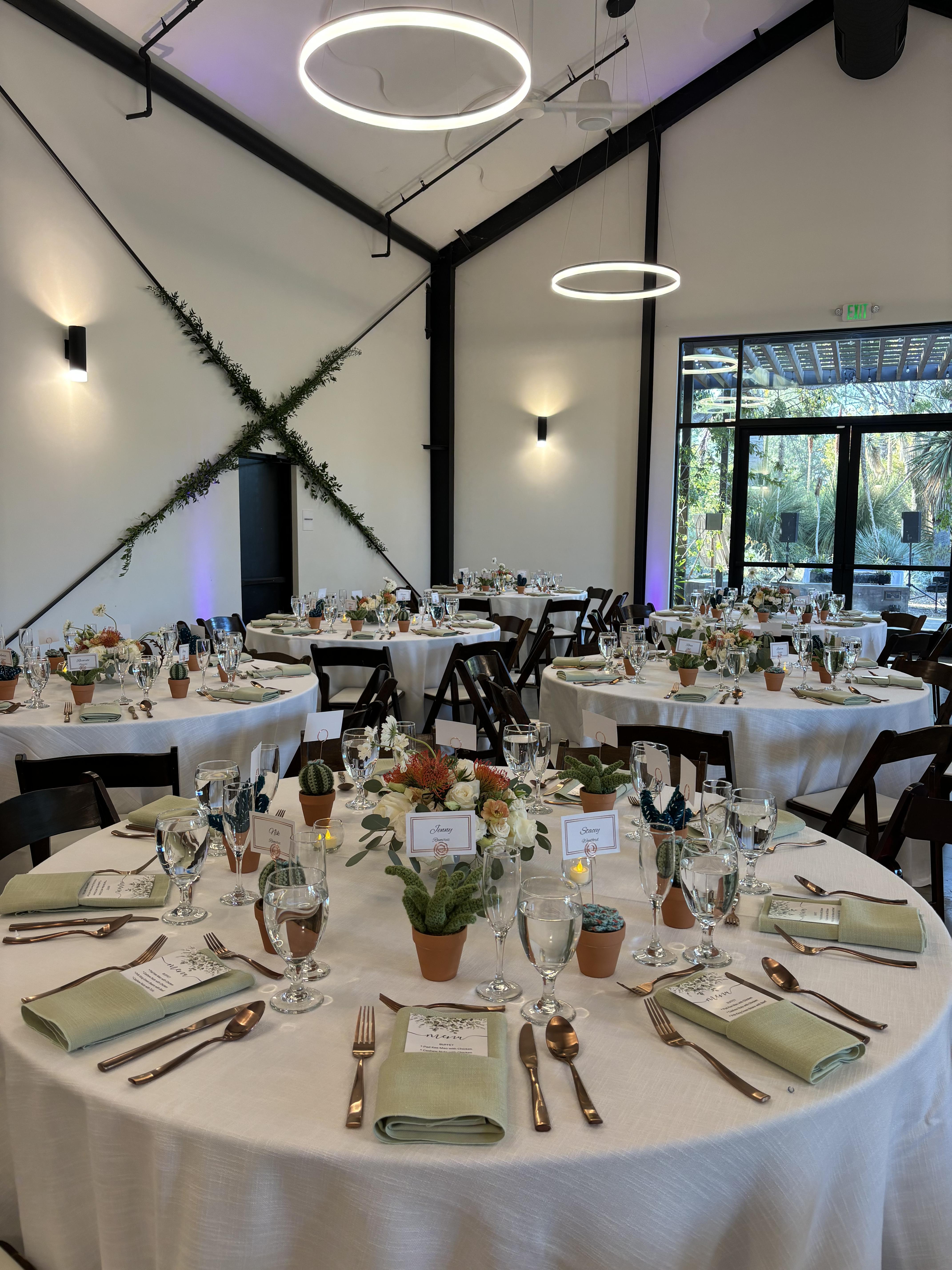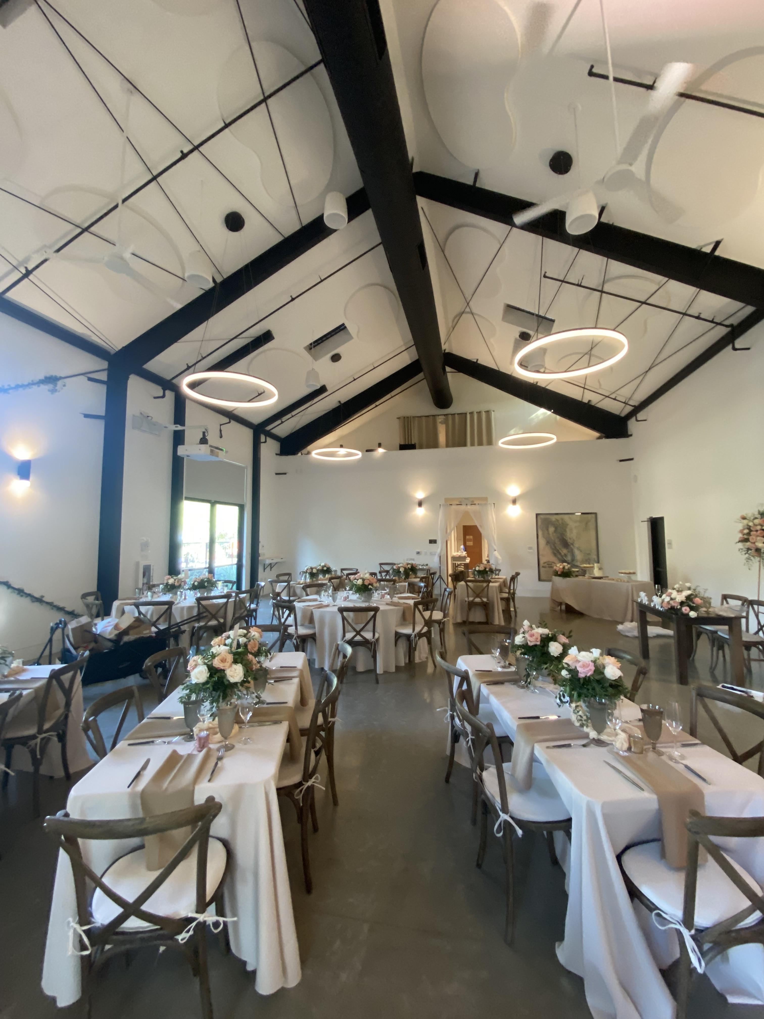 The Great Room is a modern, airy space with high vaulted ceilings and striking architectural accents. Warm ring pendant lights add an inviting glow for both daytime and evening events. Large windows fill the room with natural light and showcase garden views. With its clean lines, neutral palette, and spacious floor plan, it offers a flexible blank canvas for any style. Whether elegant, minimalist, or boldly decorated, the Great Room can be transformed to perfectly reflect your unique vision.