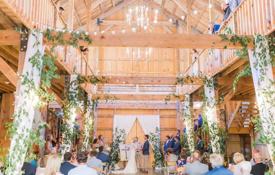 A charming barn boasting rustic elegance, rolling fields and country views.