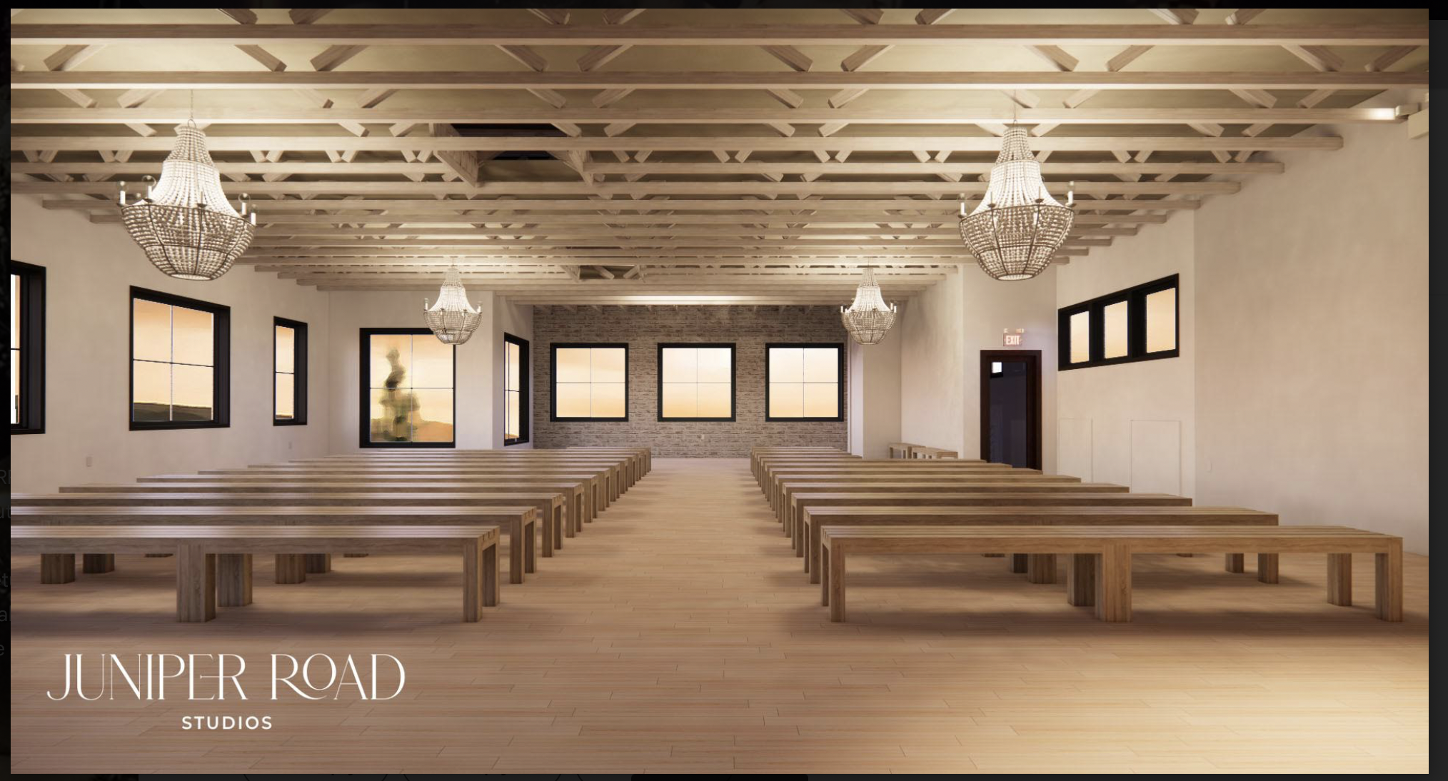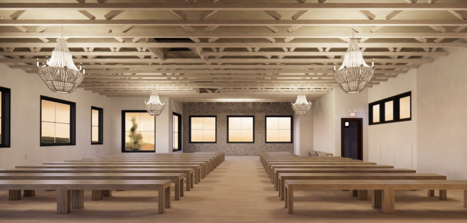 Ceremony Benches, Ceremony Backdrop, Exposed Ceiling for Floral Instal, Floating Bar, Getting ready suite