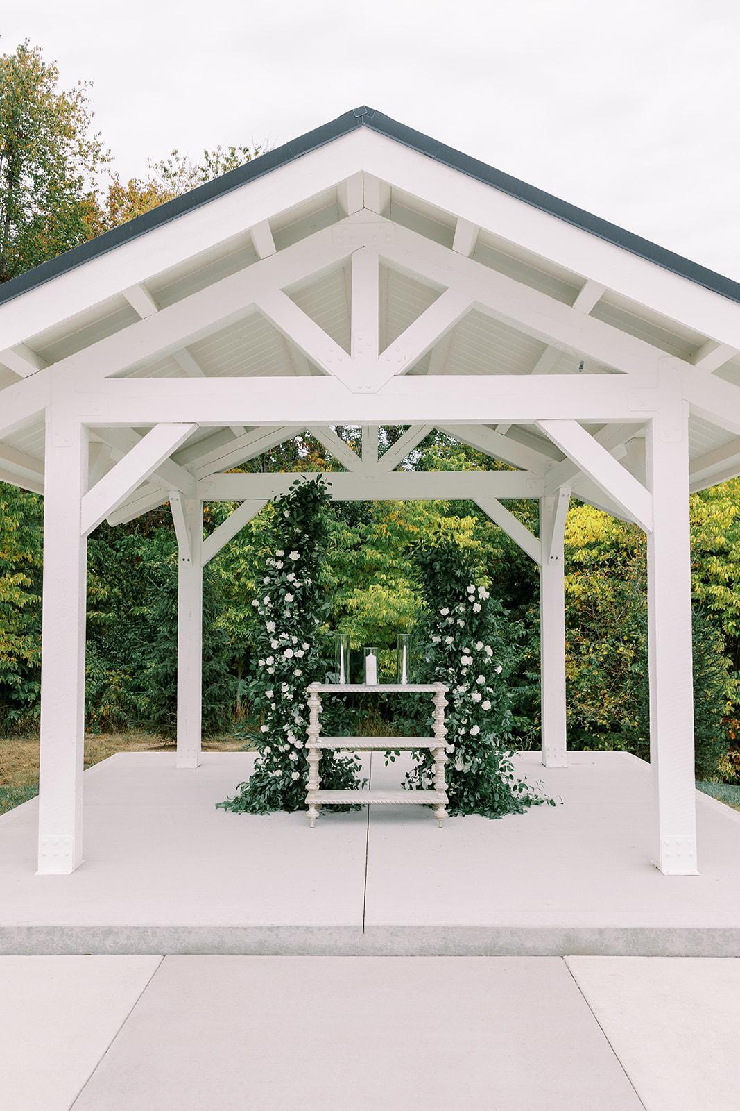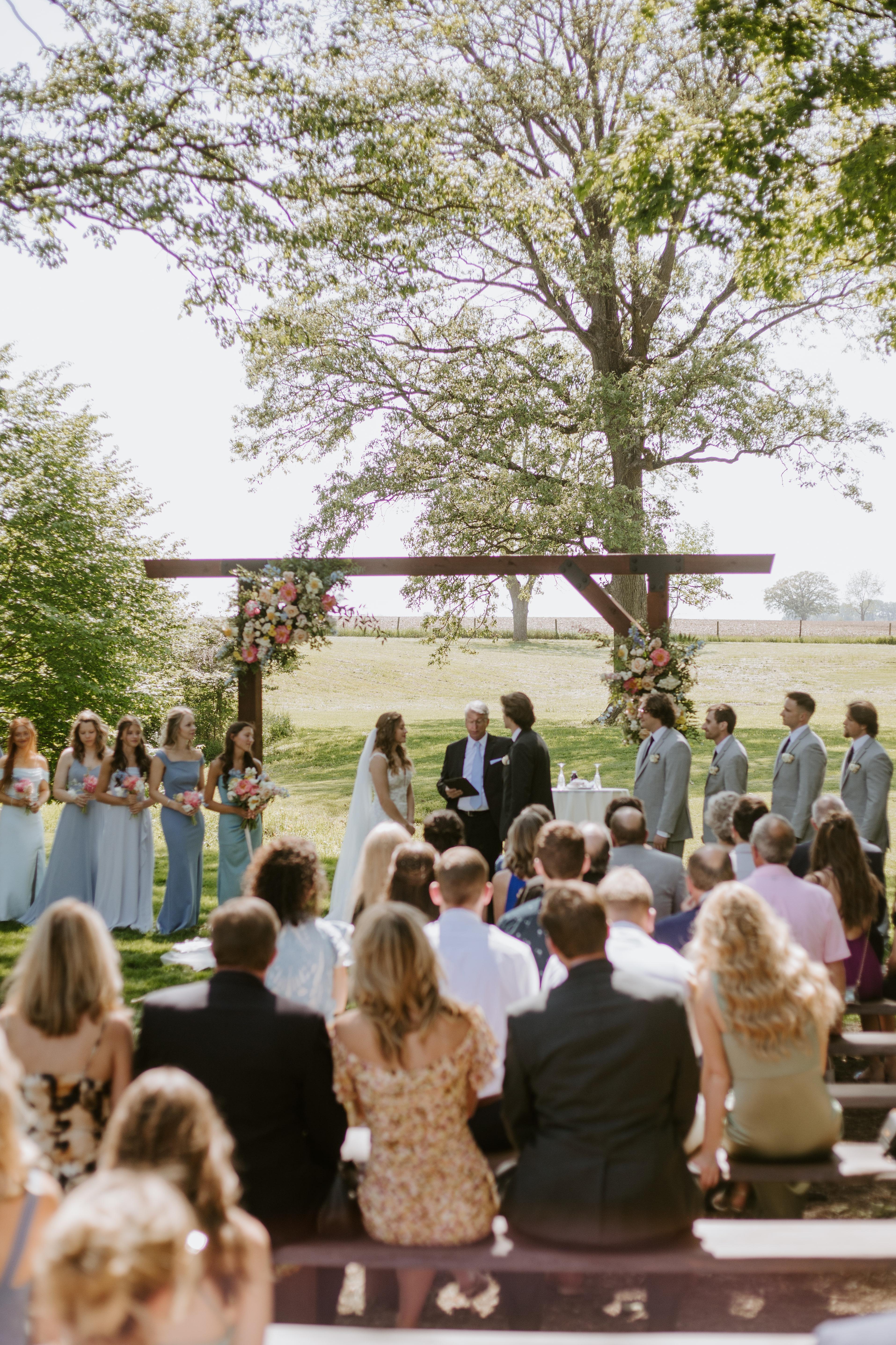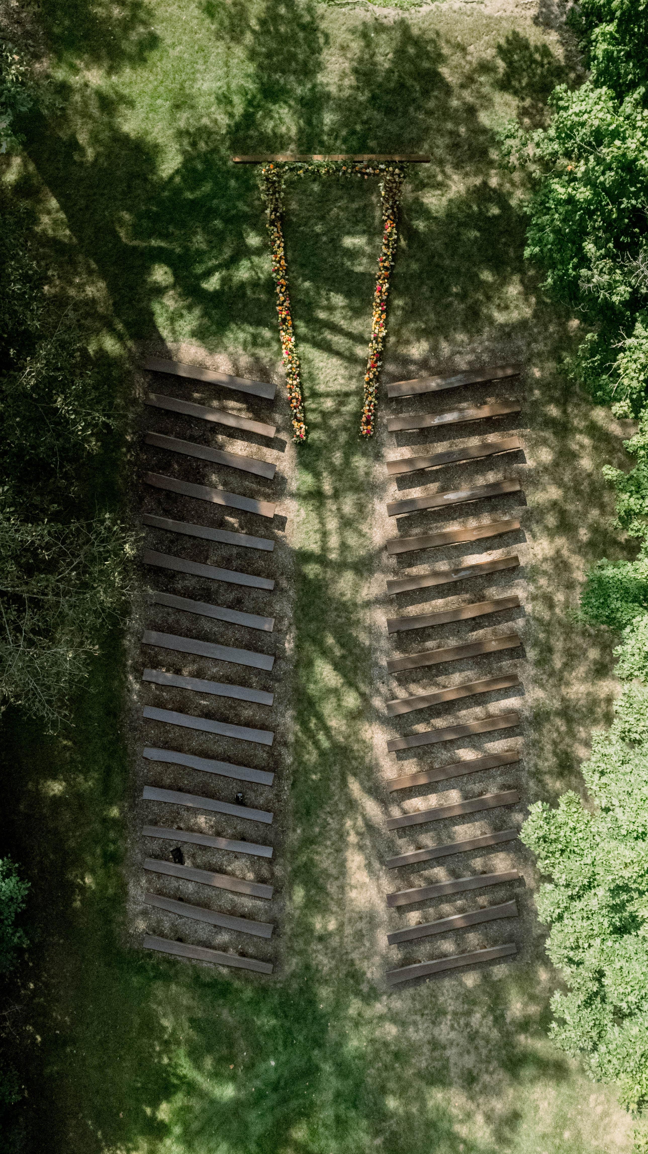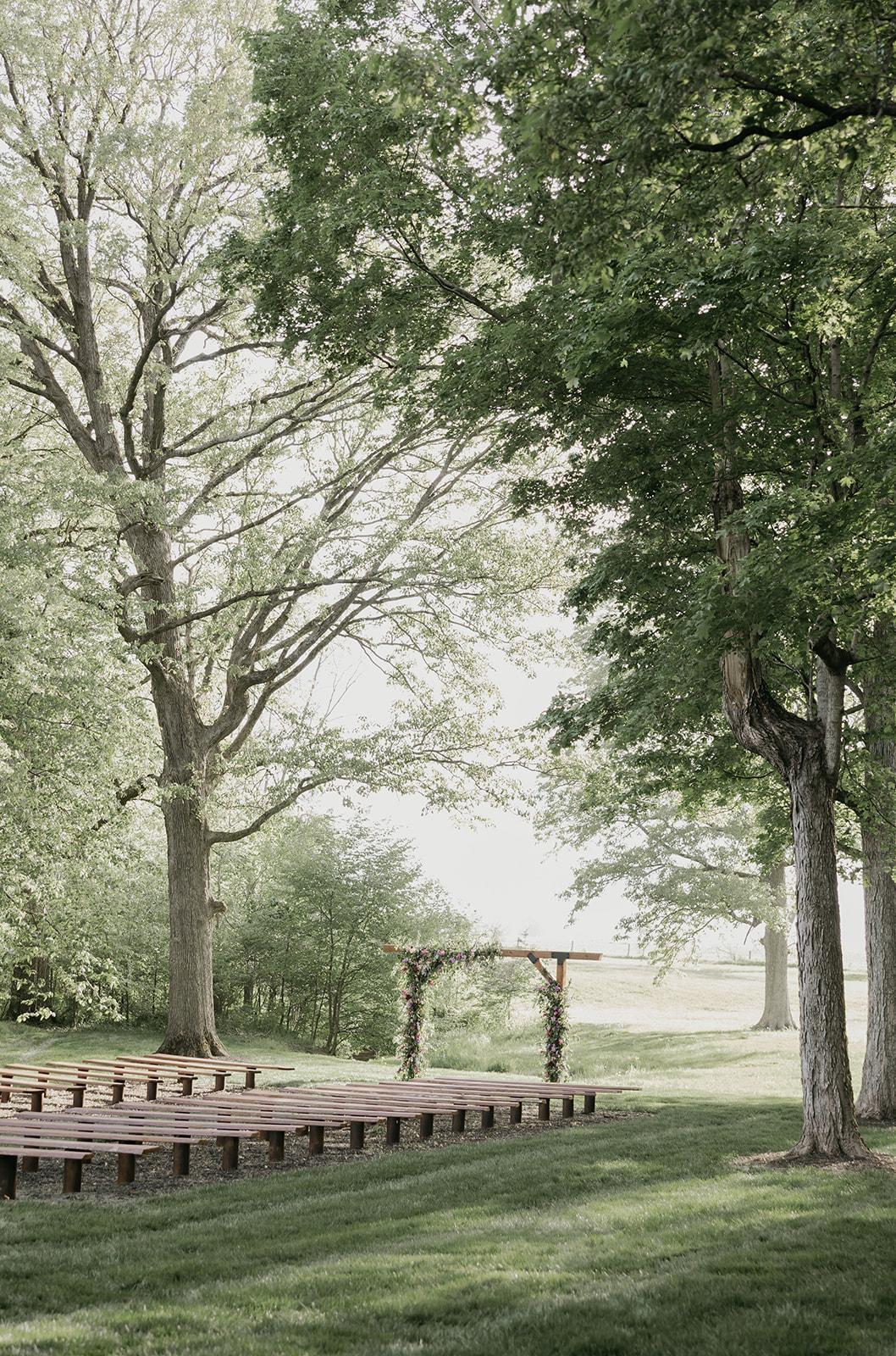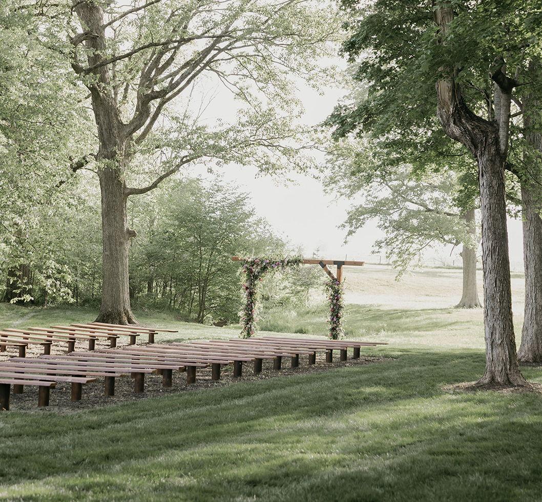 Our newest ceremony space, The Grotto wooded wedding space features Poplar pews, water service, power access, and seating for up to 225 guests.