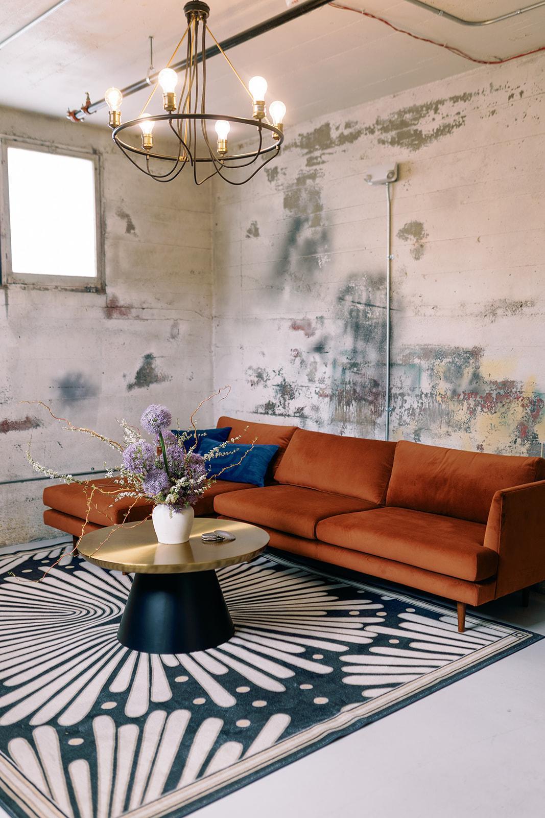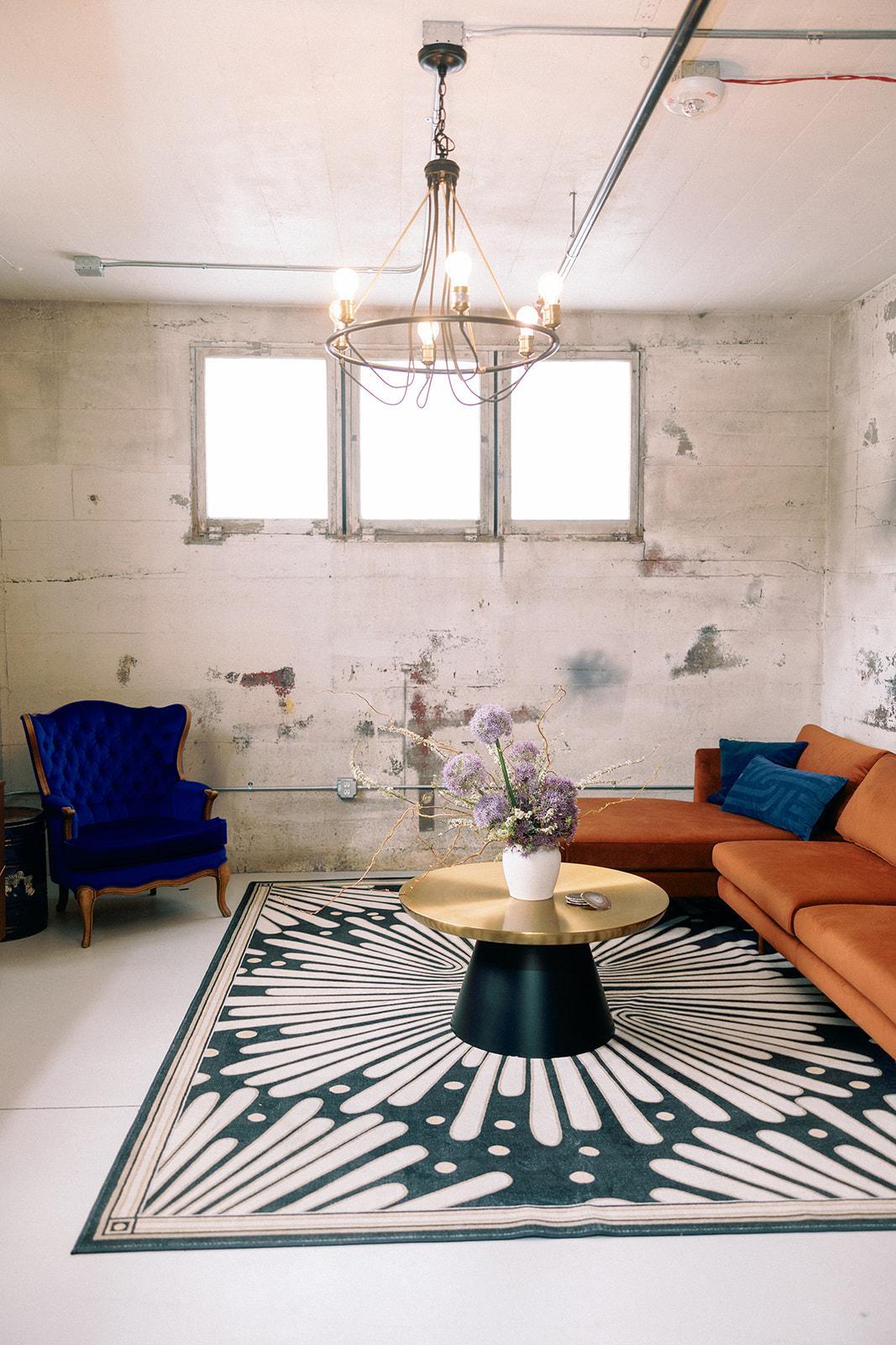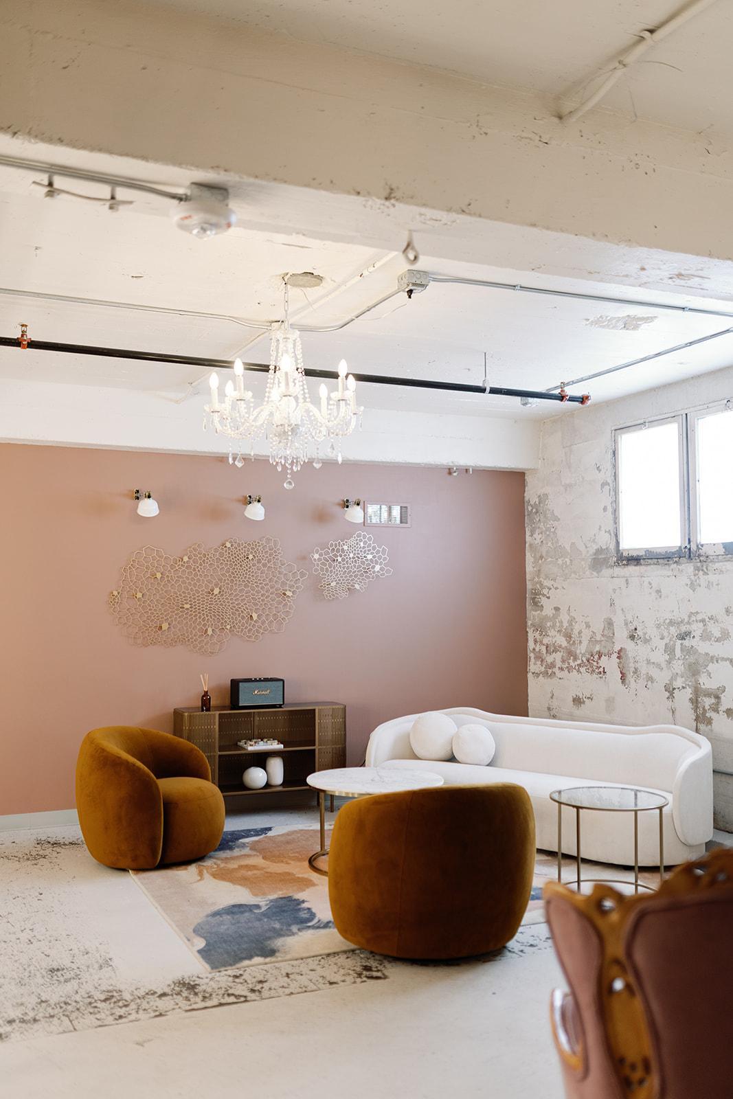 This suite features a sectional and high top chairs for lounging and retro USPS lockers for all your things. There is also a wall lit vanity and dart board. Enjoy cocktails made by you and your crew at the in-suite bar or stage swanky photos instead.