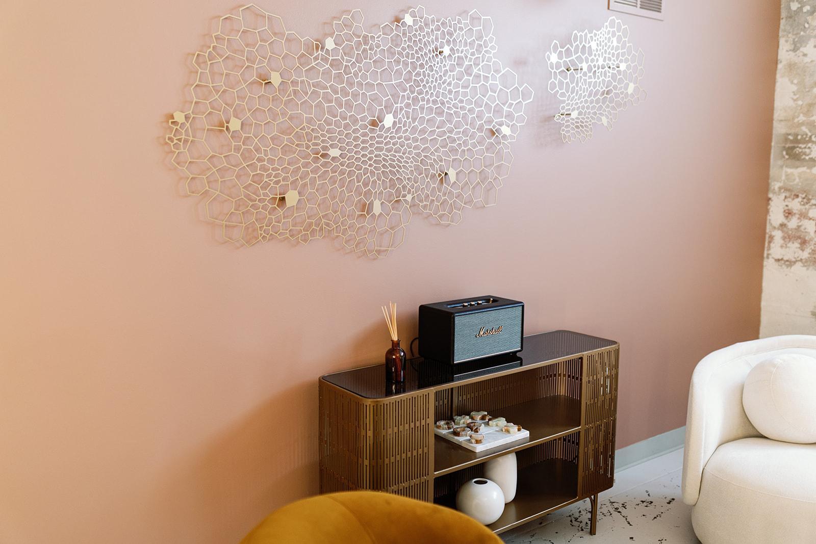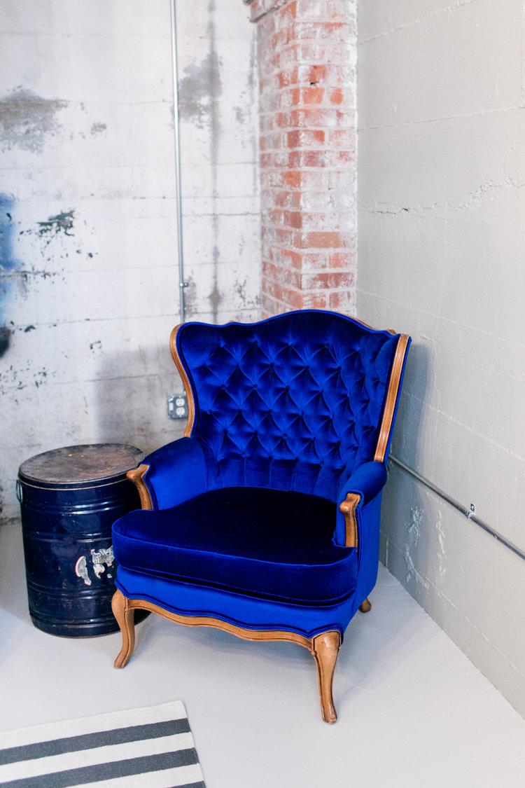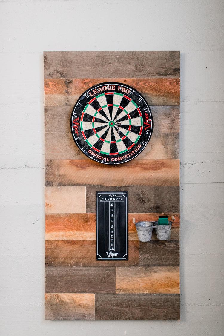 This suite features a sectional and high top chairs for lounging and retro USPS lockers for all your things. There is also a wall lit vanity and dart board. Enjoy cocktails made by you and your crew at the in-suite bar or stage swanky photos instead.