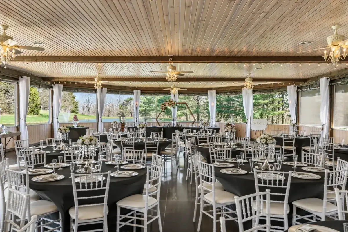 Both Suites are fully furnished and include comfortable sitting and preparation areas, newly remodeled full bathrooms and kitchens, cozy fireplaces, large screen TVs, internet, lakefront and wooded views, and relaxing covered porches. All of our facilities open up to the two-acre lake and the property is just magical. Our maximum capacity accommodates 200 guests, and all tables, chairs, decor and security are provided at no additional cost. You may also utilize the caterer of your choice, and we do permit alcohol.