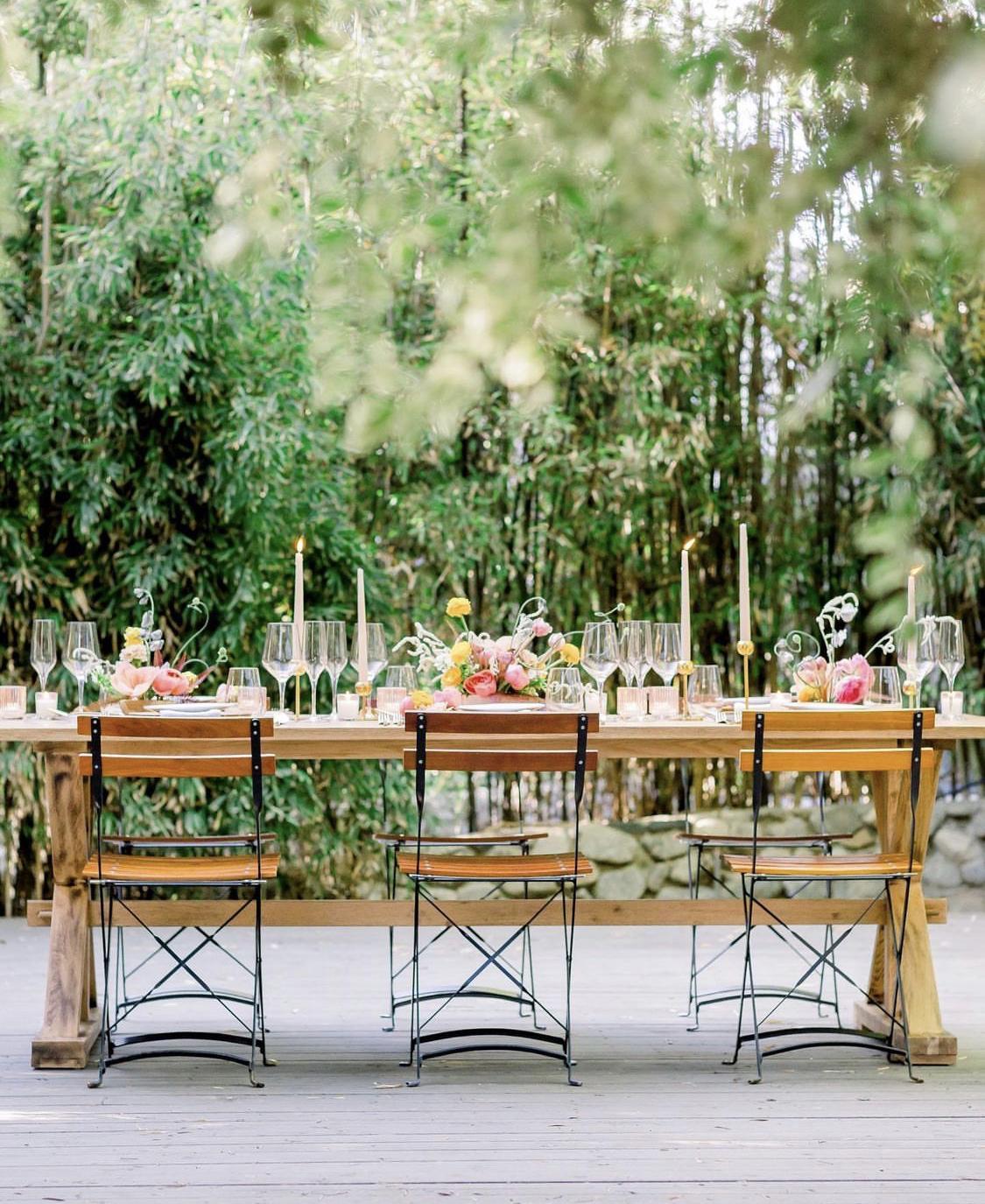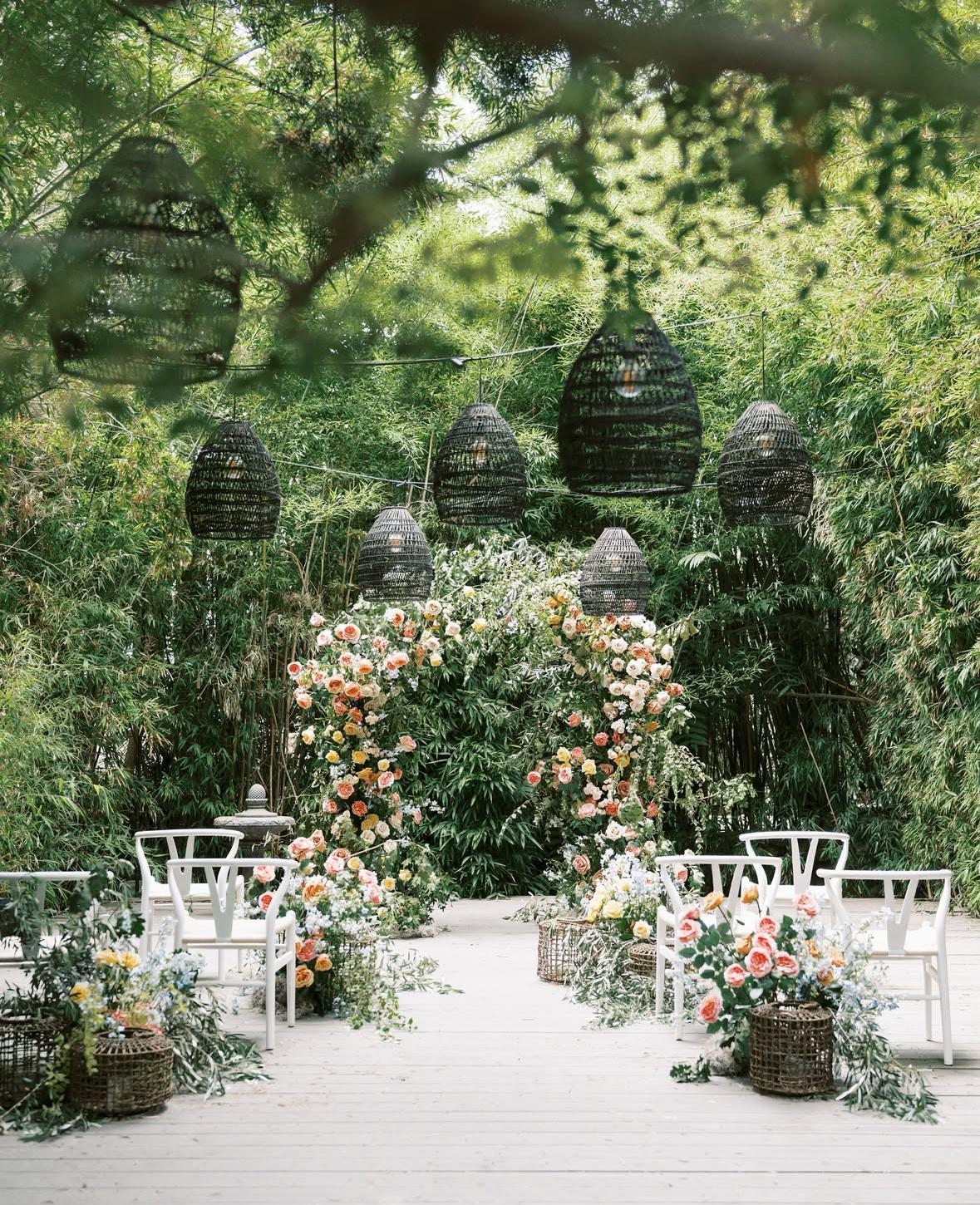 Hidden Haven- Discover the Secret Bamboo Garden, a secluded oasis perfectly hidden to surprise and delight your guests. Lush green, black, and yellow bamboo stalks create a serene ambiance, while soft shade provides an intimate setting for ceremonies, small receptions, or cocktail hours. Dramatic black rattan pendant lighting adds a touch of sophistication, making this hidden haven truly unforgettable.