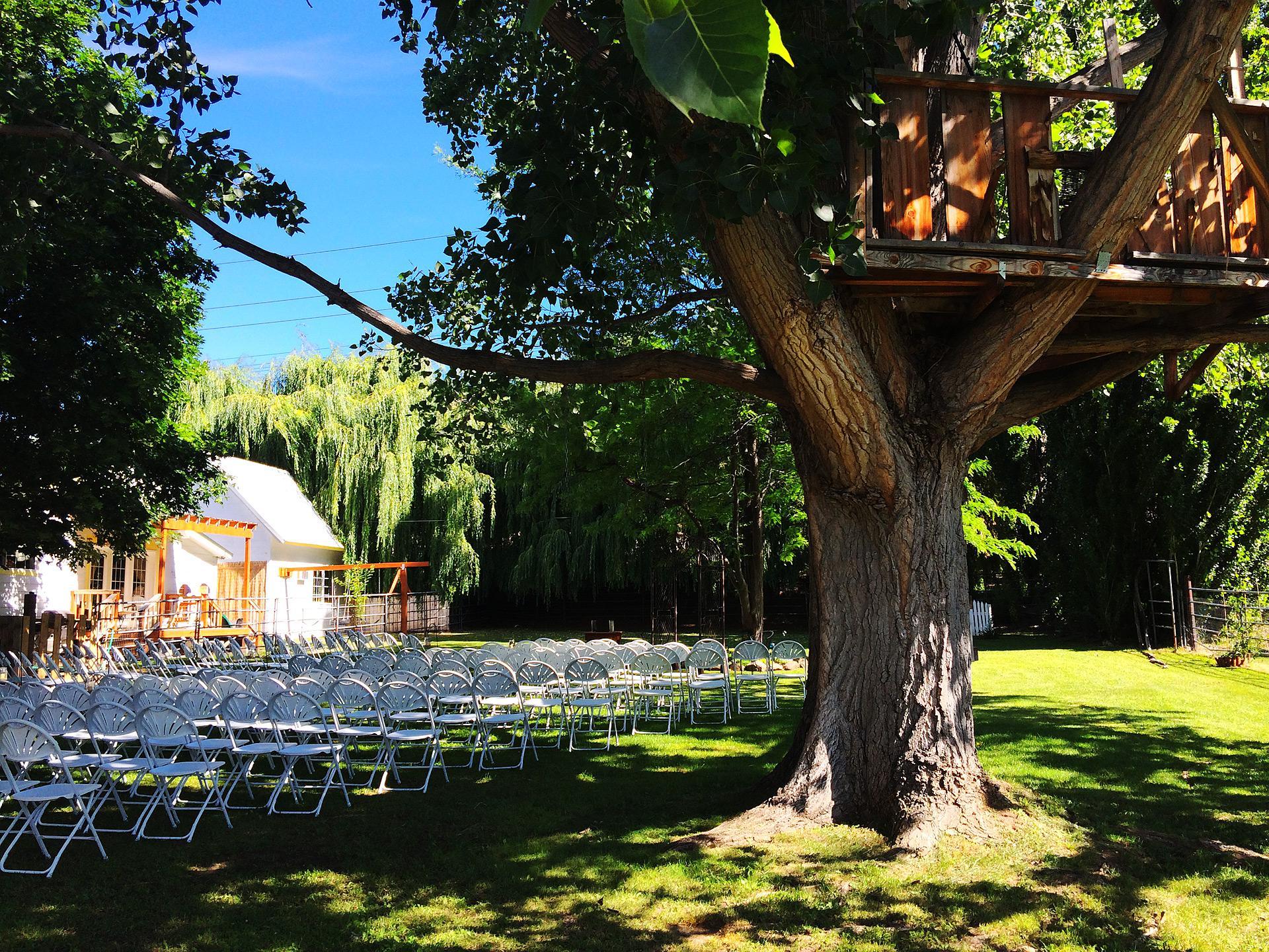 As you meander through the ranch’s acre and a half of lush greenery, you’ll discover the heartfelt details that set this location apart. The soothing sound of a country fountain, the playful spirit of an old treehouse and rope swing, and the delicate display of soft blue morning glory vines all add to the enchanting atmosphere. At the heart of The Sunshine Ranch stands its striking old barn, built in the early 1900s with its original wood still intact. Both sides open wide, seamlessly connecting the patio to a deck overlooking the grounds and orchards. Whether you choose the shady canopy of mature trees or an open lawn to bask in warm sunlight, The Sunshine Ranch offers countless ways to bring your dream wedding to life. Let us help you create memories that will last forever.