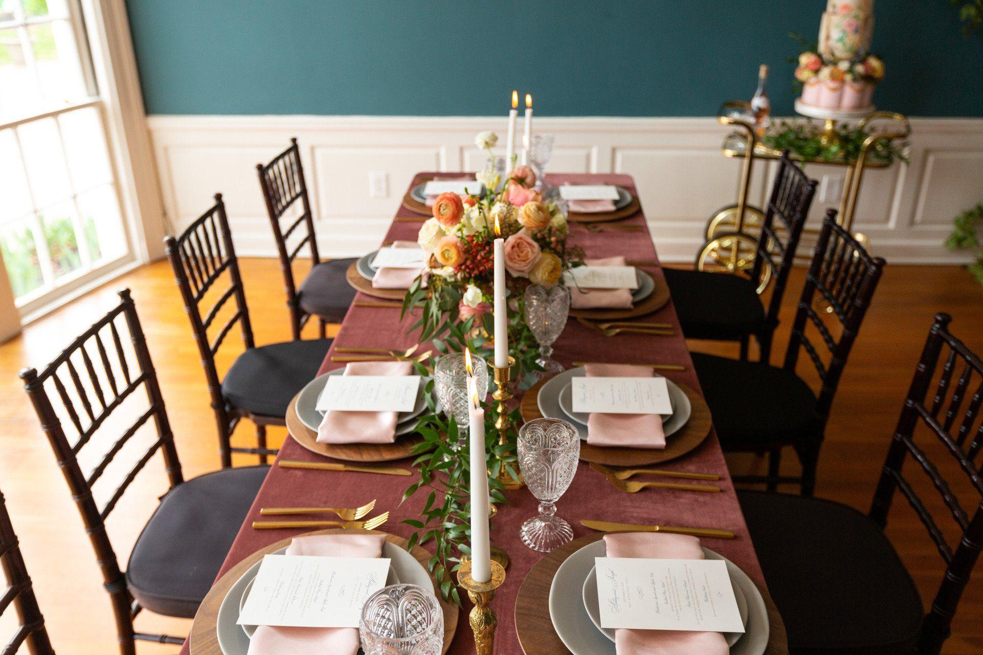 The Blue room makes a perfect place to set up a buffet station with easy access to the kitchen through a connecting door. It boasts of five tall curved windows overlooking the back patio, carriage house, and large white tent. Many colors and styles show well in this beautiful room.
