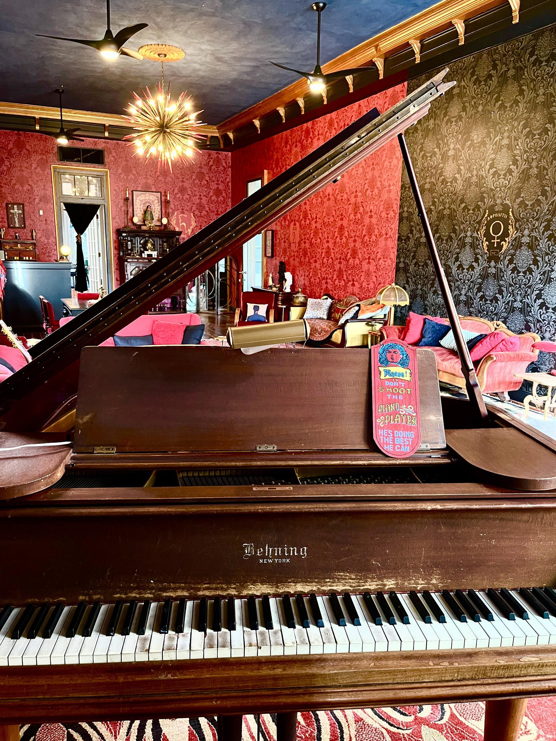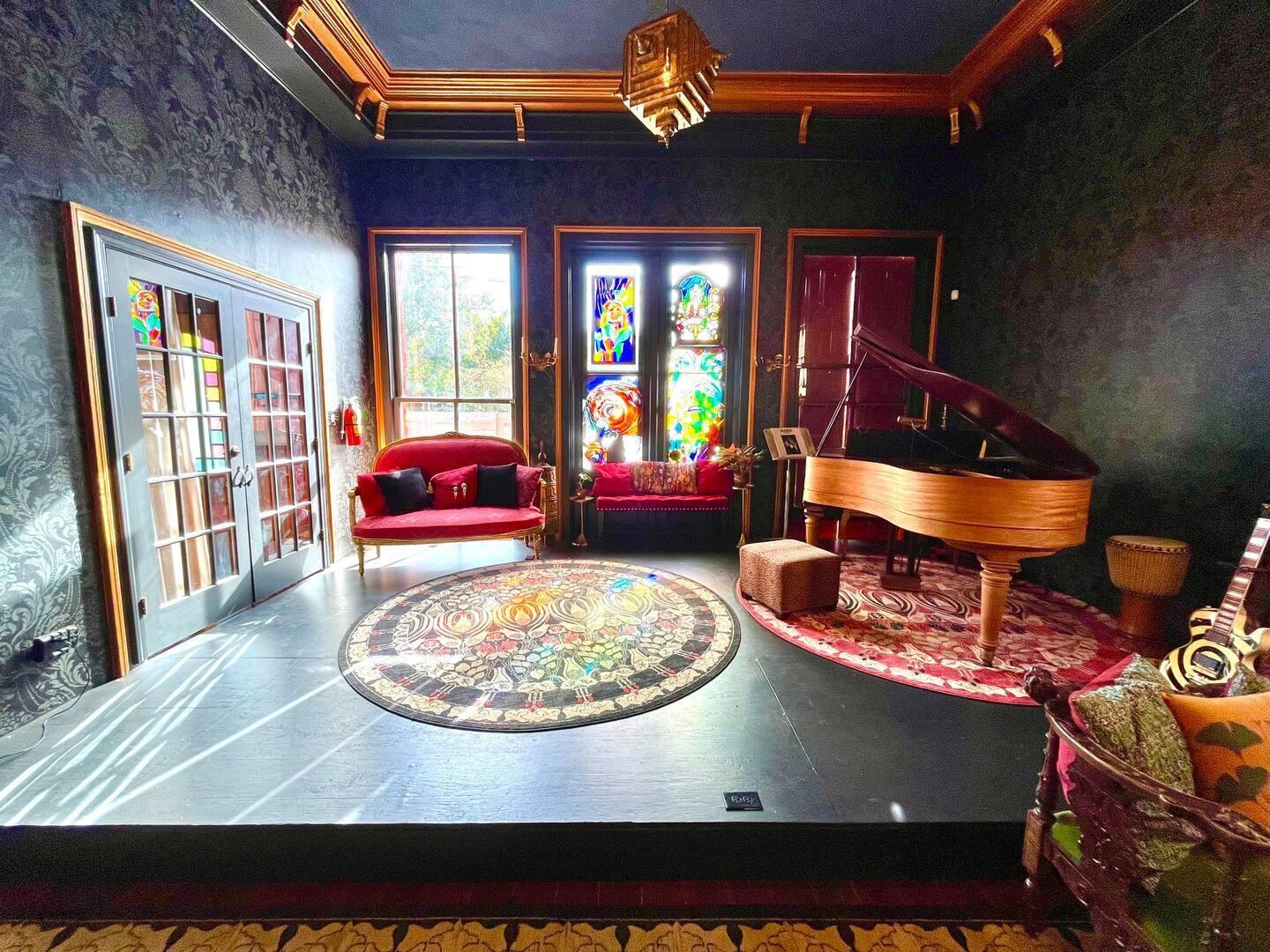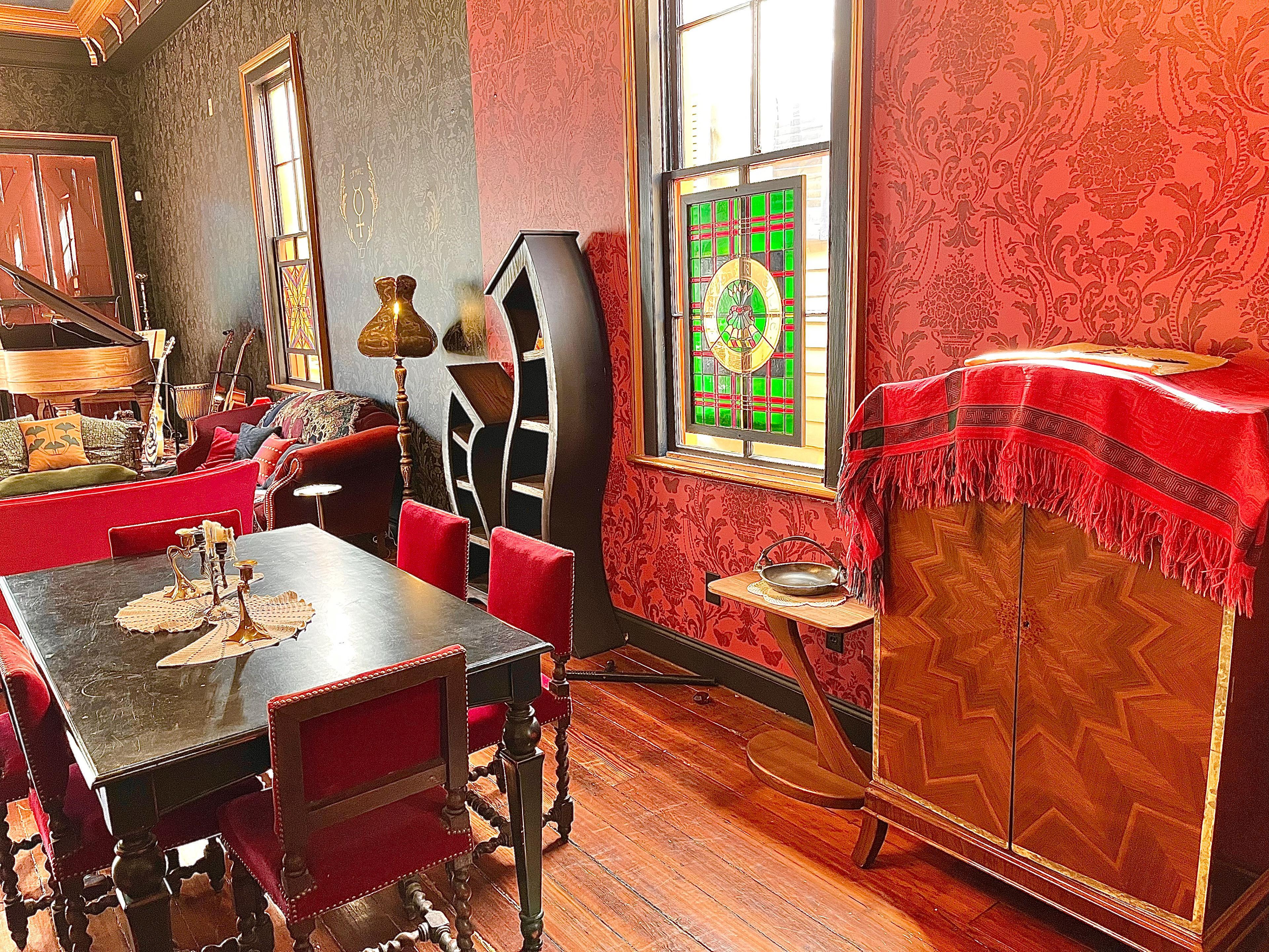 This spacious Art Nouveau-meets-Rock'n'Roll church is perfect for your wedding! (2600 sq. ft.) 1st floor space which includes 3 separate entrances, 3 bathrooms, a huge "Interview With A Vampire"-inspired red and black Ballroom (45x19 ft /850 sq ft) with stage (19x9ft), baby grand piano, guitars, mics/PA, DJ booth, all leading into an open service space (665 sq ft) with antique bar, large kitchen/dining area, a cozy bedroom/dressing room/coatroom, connecting to our screened-in Nouveau Patio (300 sq ft) and lovely private backyard (400 sq ft). Upstairs a 2nd Kitchen/Dining Room and 4th bathroom is available for negotiable charge. We can recommend outside catering, table/chair rentals, higher-end sound system rental (we have a very simple PA and seating for about 70 throughout the 1st floor and garden). Though we don't produce events we can also suggest staff, DJ, and performers. Due to the age of the house we can't provide ADA accessibility for entry or bathrooms.