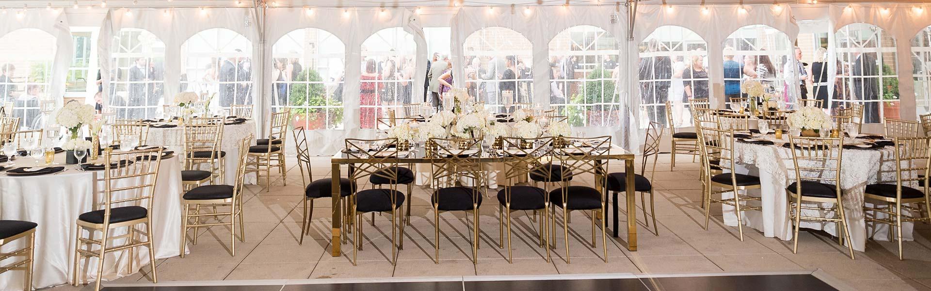 Rental Package Includes: 40x60 white tent with sides, 60" round guest tables, 6' banquet tables, high cocktail tables, Navy, Ivory, Black, Champagne or Silver linens, Ivory, Gold, Silver, or Black napkins, Flatware, Glassware, Silverware, White Garden Chairs, Tent Lighting, Lounge Furniture, Fire Pit, Corn hole boards, Hospitality Room, Complimentary room night for bridal couple, complimentary champagne for bridal couple, Set-up and tear down service, and On-Site Event Coordinator