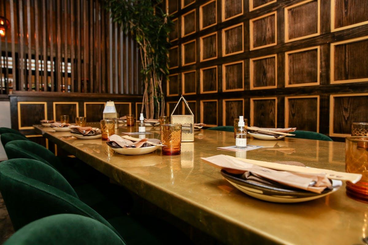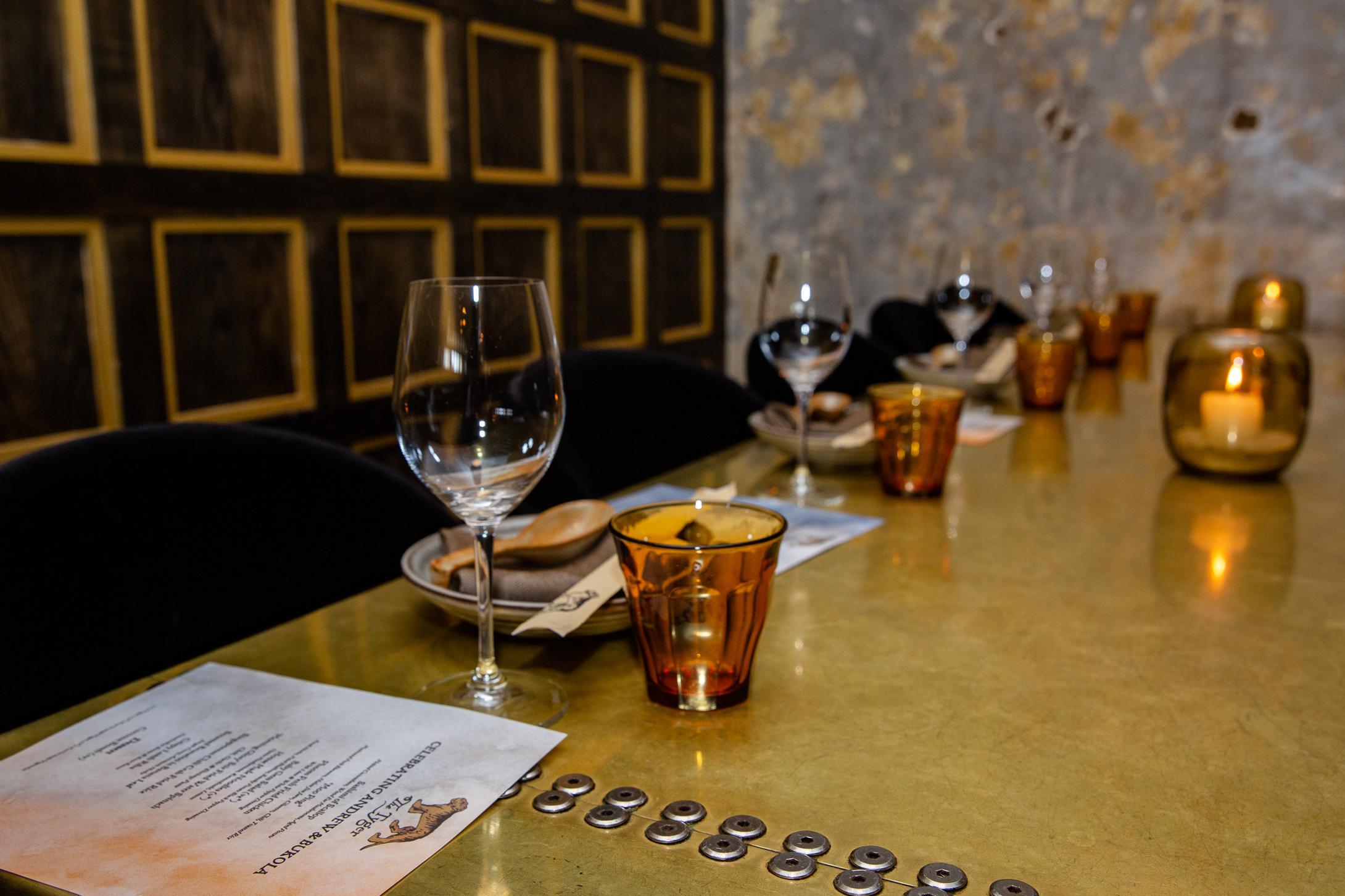 Featuring a dramatic 8 foot pressed brass dining table and forest green velvet chairs for a more intimate, elevated meal.