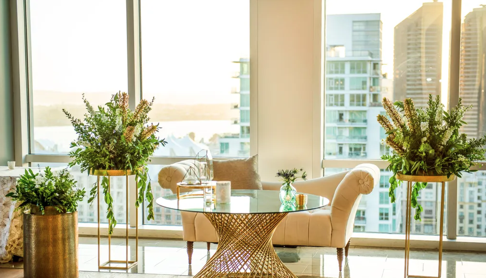 The Ultimate Skybox At Diamond View Tower is a unique event space and wedding venue in San Diego, CA. Couples and their guests are able to gaze out at the city skyline, providing an urban touch to a sweethearts’ event. Nearly-weds can easily host the unforgettable celebration that they’ve always envisioned! Overlooking Petco park with sweeping views of San Diego Bay and Coronado Island, The Skybox is at the top of the Diamond View Tower and is a versatile space suited to a myriad of events. Its understated design, modern aesthetics, and functional facilities make it an ideal setting for “I dos.” Our venue spans 4,500sqft and can accommodate up to 180 guests based on the time of year and type of event. The space includes a 100-foot-long patio with a 15-foot fireplace. With hardwood flooring, large windows, and sophisticated lounge furniture, the elegant venue can complement a couple’s wedding theme with little decor needed. It also features a limestone bar area and full kitchen.