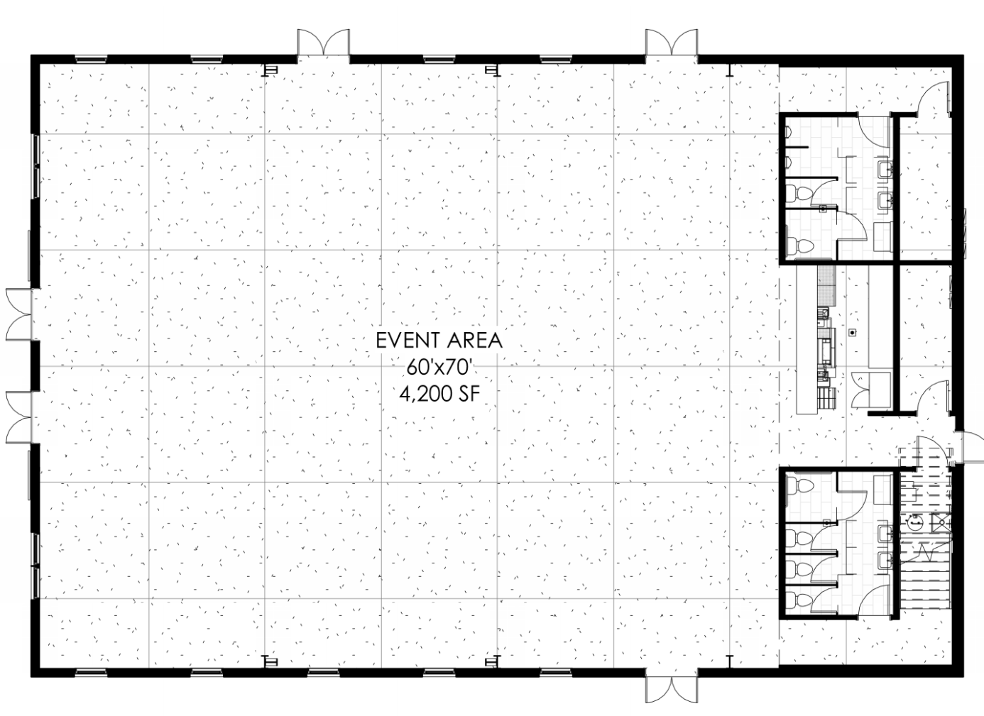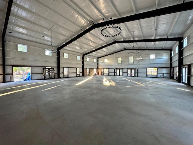 This space is a 4,400 sq feet open layout to be able to design your event any way you would like. With 20' ceilings all white with black chandelier and accents.