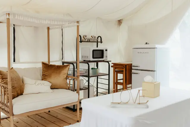 -Seating for up to 8 guests -Standing for up to 10 guests -Wood Burning Stove -AC Unit -Two Vanity Mirrors -WiFi -Mini Fridge -Complimentary Champagne -Complimentary Water -Kitchenette -Outdoor Enclosed Shower -Outdoor Enclosed Sink -Outdoor Enclosed Toilet -Fresh Towels -Full-Length Vanity Mirror -Hanger Rack -Love Sofa -Giant Hammock