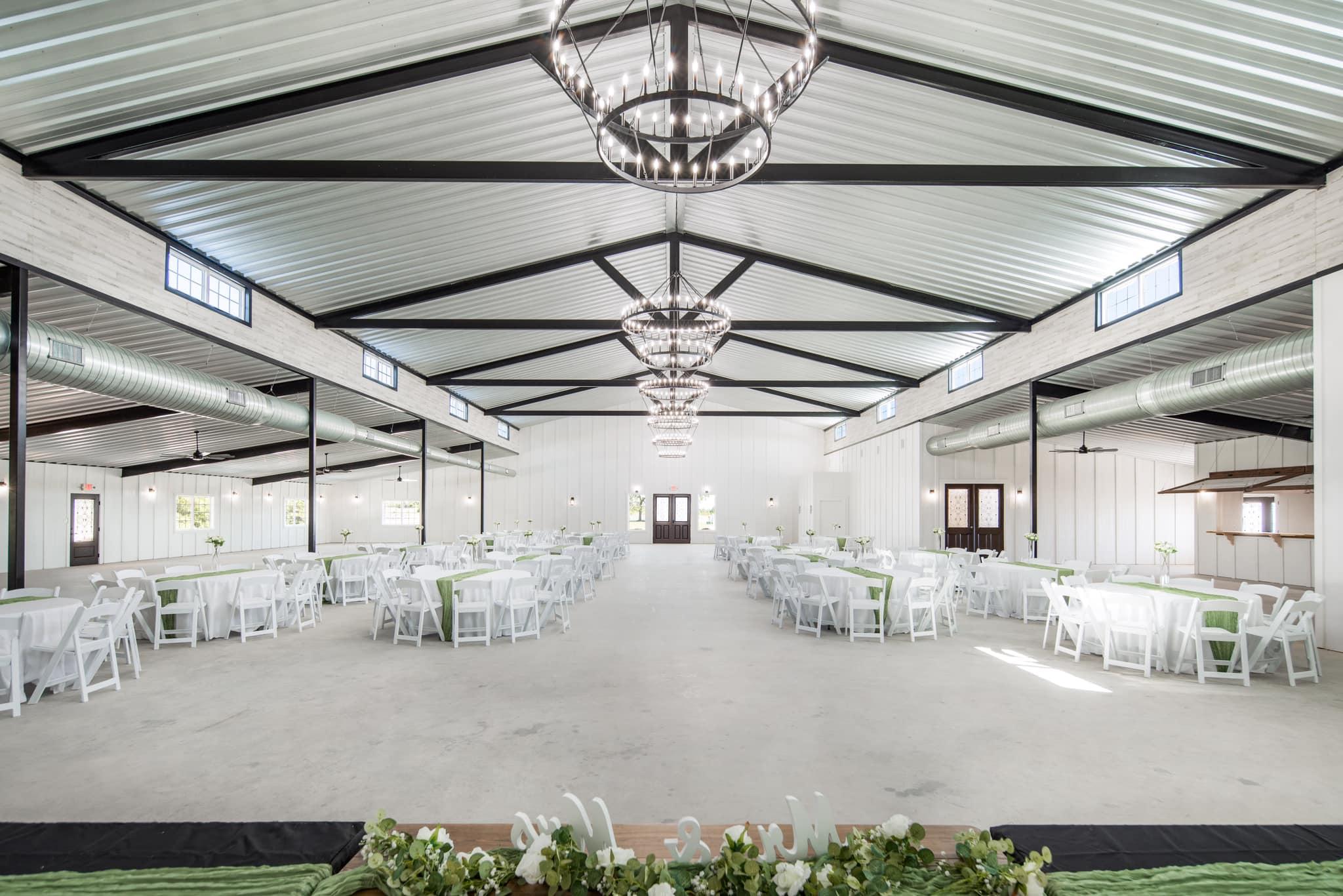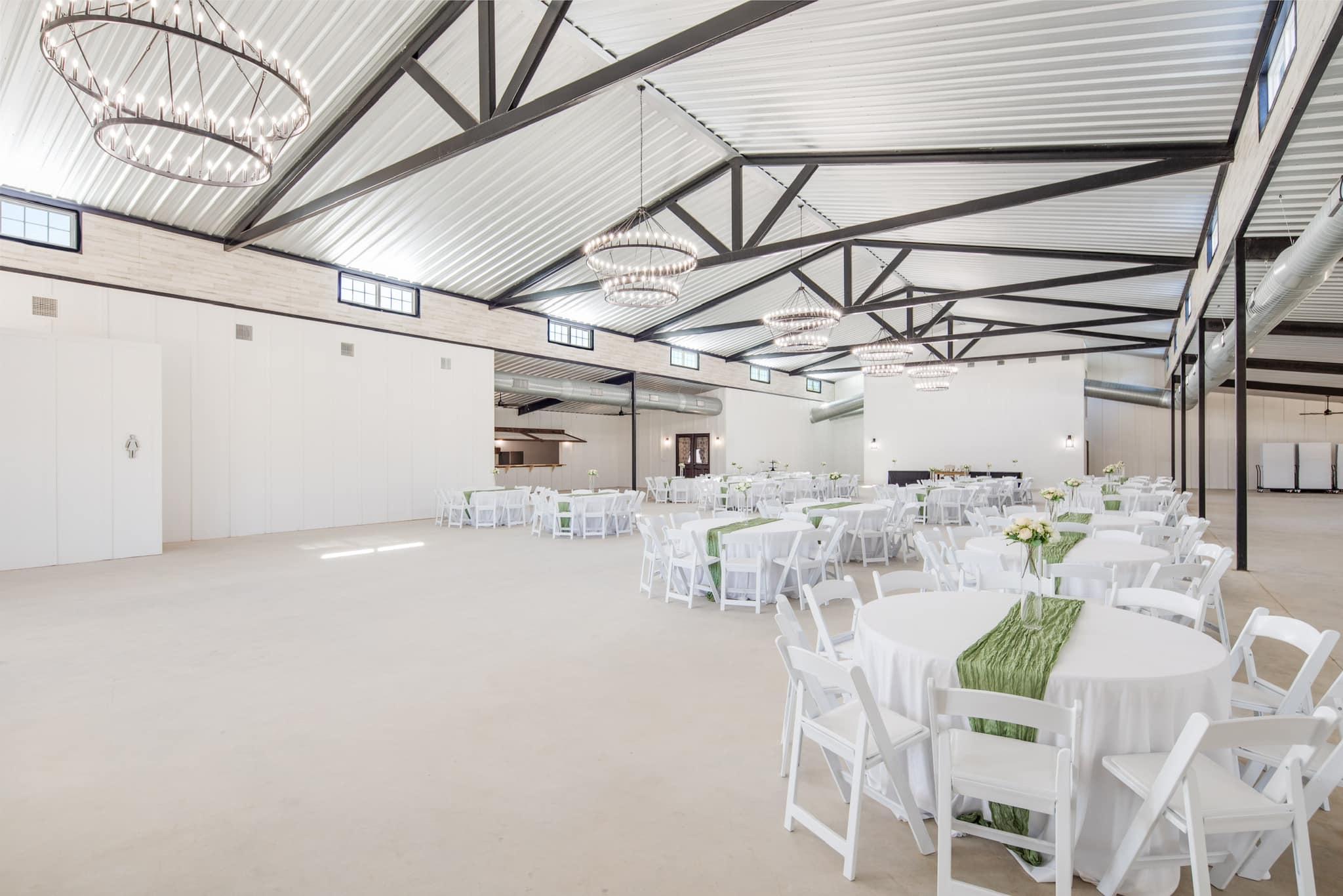 Indoor/Outdoor Ceremony Options, Beautiful Outdoor Ceremony site with mature trees and built-in benches to include all your guests, 13,000 sq. ft climate-controlled venue space for up to 650+ guests, Gorgeous & chic bridal suite with built in beauty bar, adjustable chairs, shower, wine fridge, Rustic and FUN groom’s suite for a day of getting ready full of fun for the groom and his guys. This includes a pool table, big screen TV, 2 private bathrooms, and a private dressing room