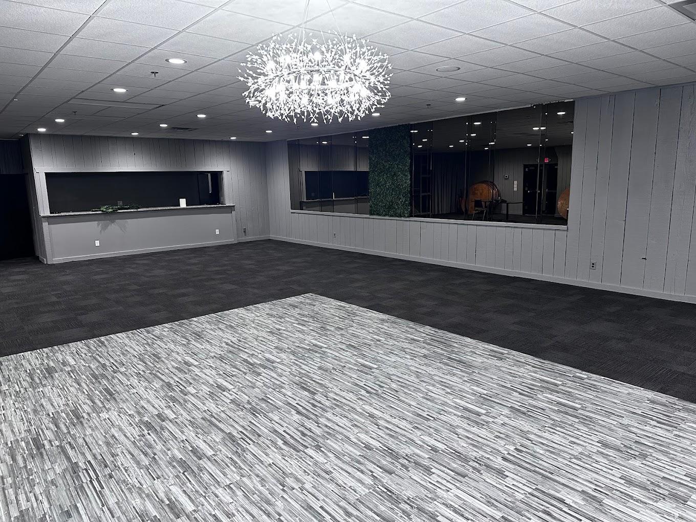 The event space features a sleek, neutral color palette with stylish carpeting and a dedicated dance floor, providing an elegant canvas that can be customized to match your wedding vision. A stunning chandelier adds a touch of glamour, while the spacious layout allows for a seamless flow between dining, dancing, and mingling with guests. With a built-in bar and ample space for seating and décor, The Venue at Danny Boys is ideal for wedding receptions, rehearsal dinners, and bridal showers. The mirrored wall adds a sense of depth and elegance, making the space feel even more inviting. Whether you're planning an intimate gathering or a lively celebration, our versatile venue sets the perfect stage for your special day.