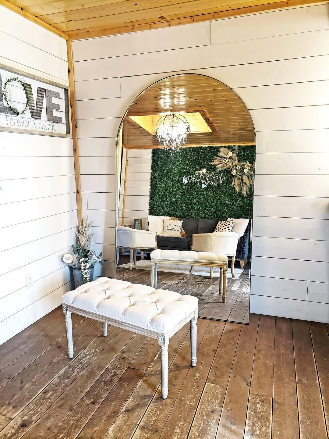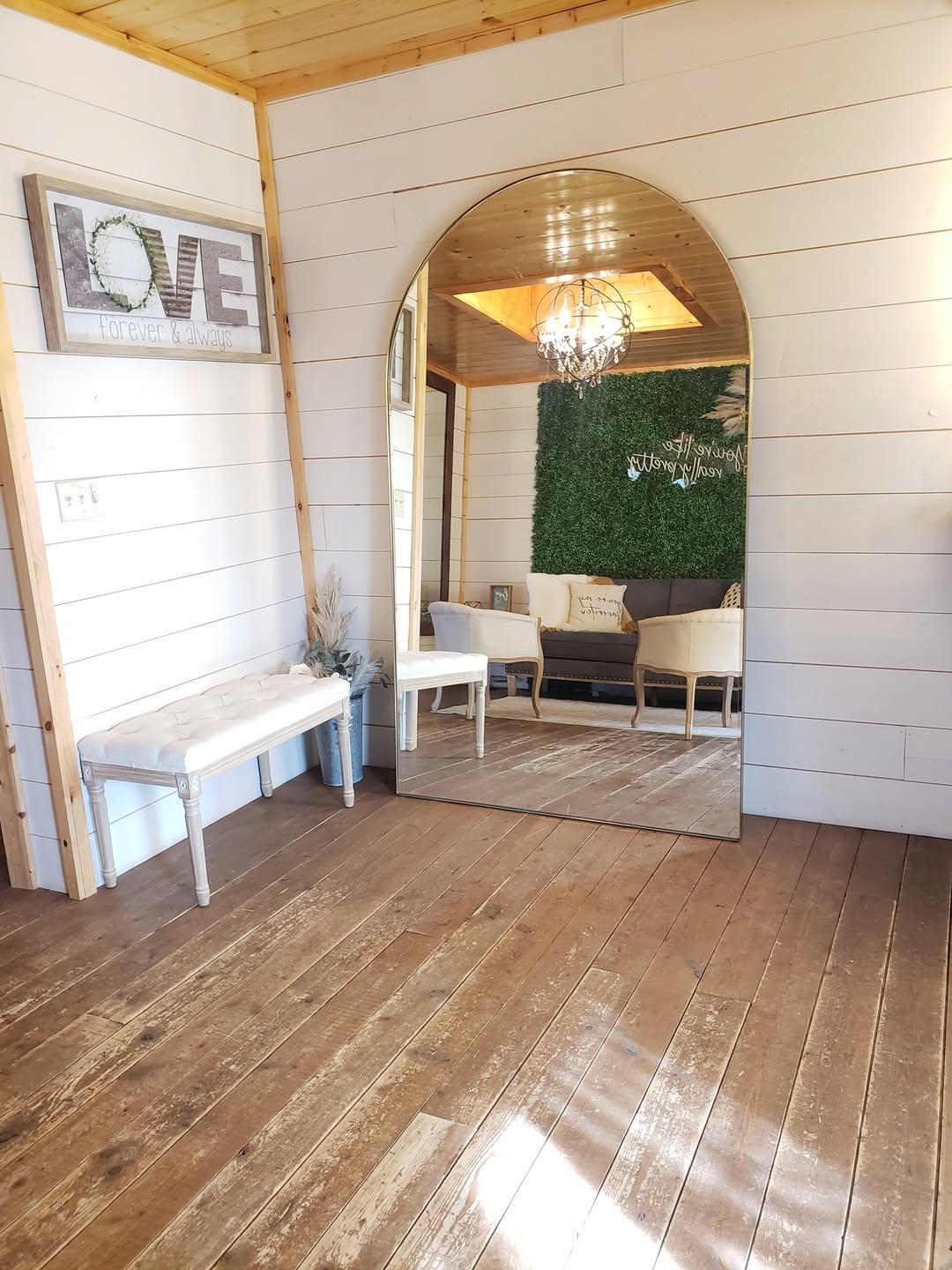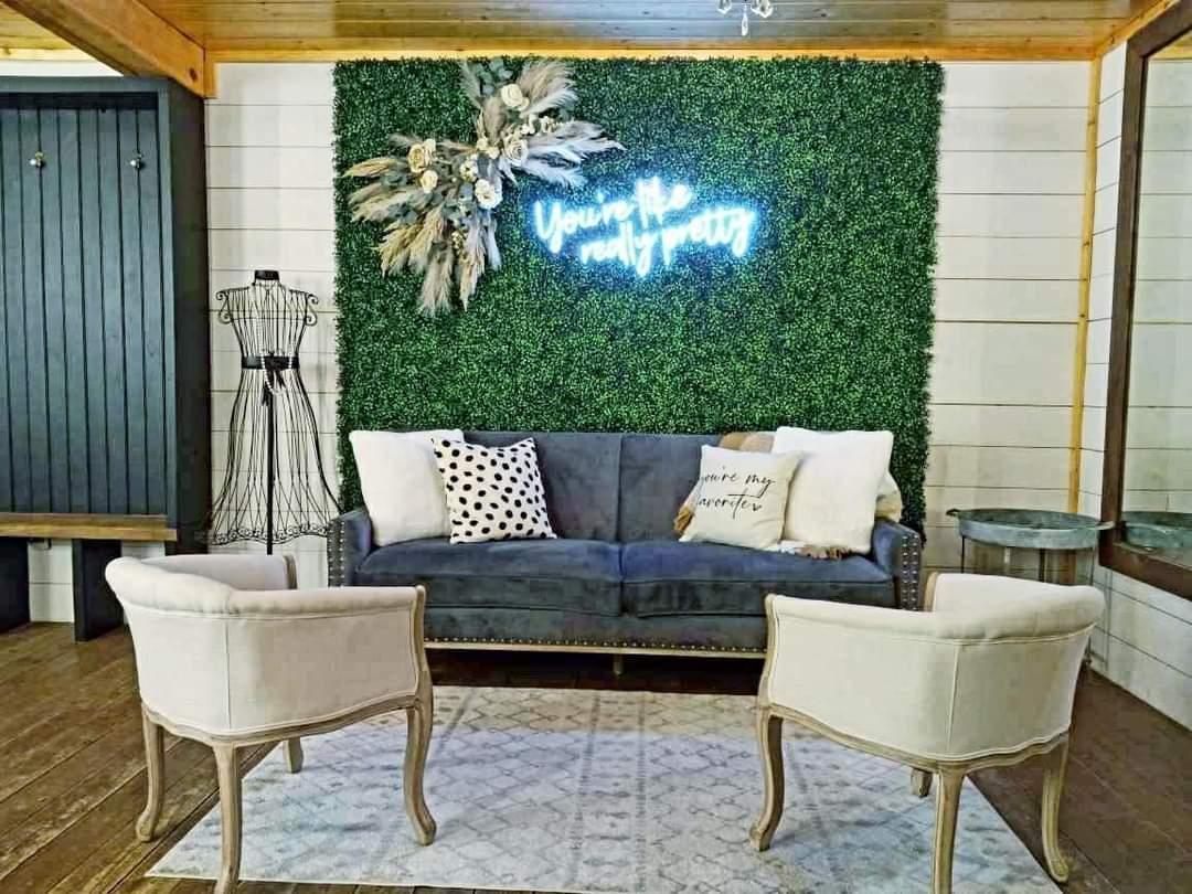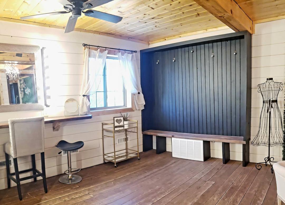 This space features 4 high tops chairs, tons of mirrors, and great lighting for hair and makeup! Plenty of extra seating for guests to relax and hangout with a large couch and additional chairs. Perfect photo opportunities with all your best gal pals!