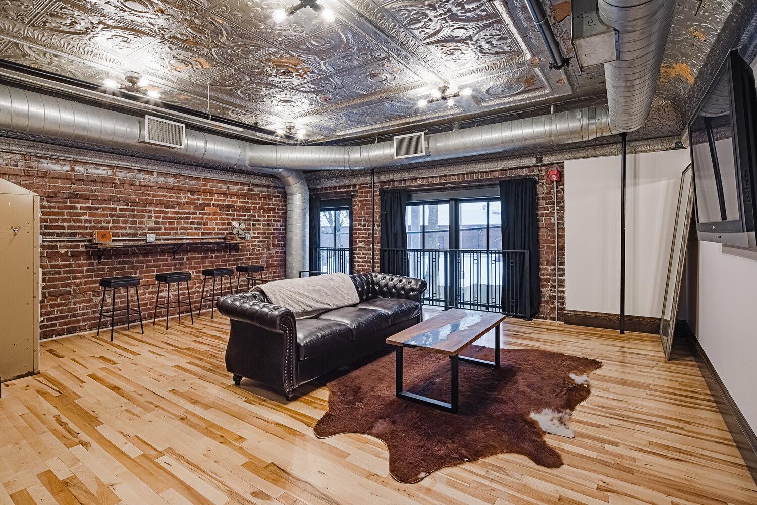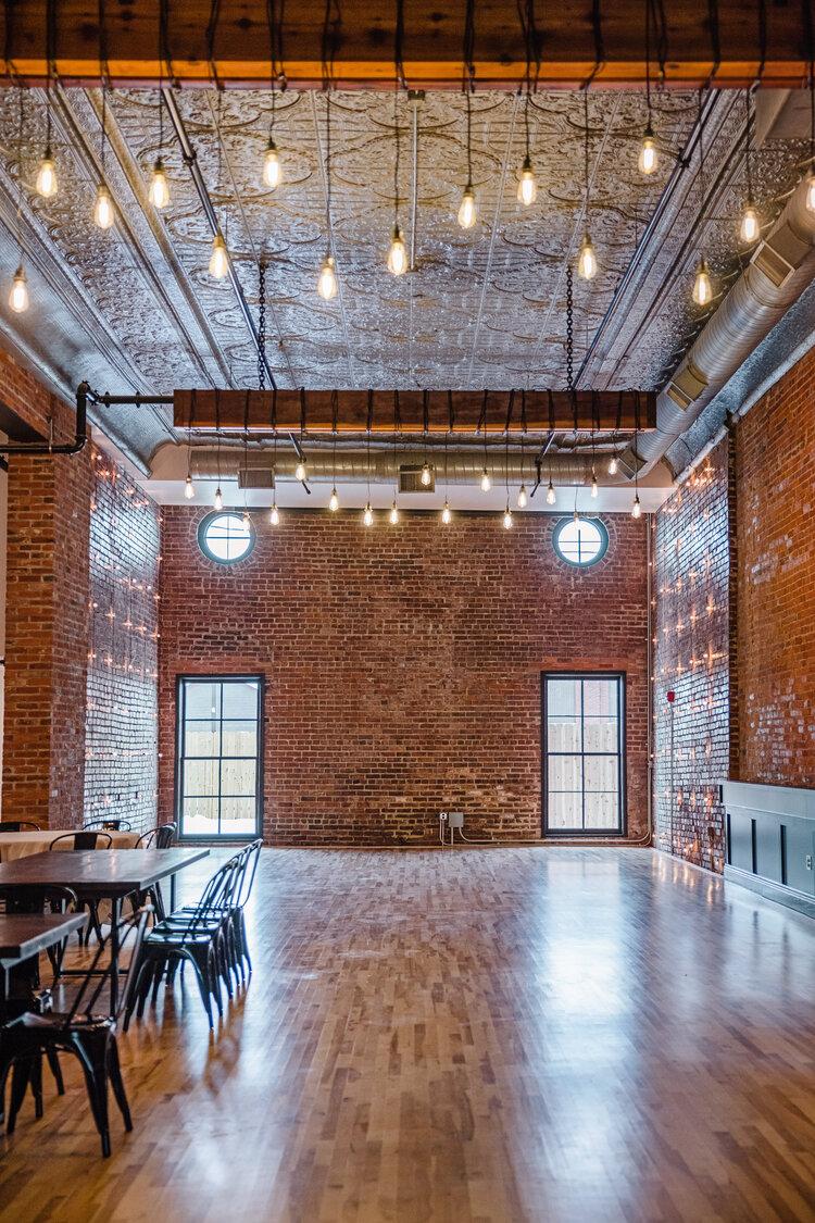 The Varsity Ballroom is the primary event space at The Venue CU. Long sight lines, updated vintage brick, renewed original tin ceilings, and beautiful wood floors are just a few of the design elements you are greeted with as you walk through the grand entryway. The space is yours to decorate any way you like for your special event! With reception-style table and chair seating. Our unique, modern, one-of-a-kind lighting fixtures within the space not only provide ambiance for the event, but also stand as pieces of art as secondary decorations.