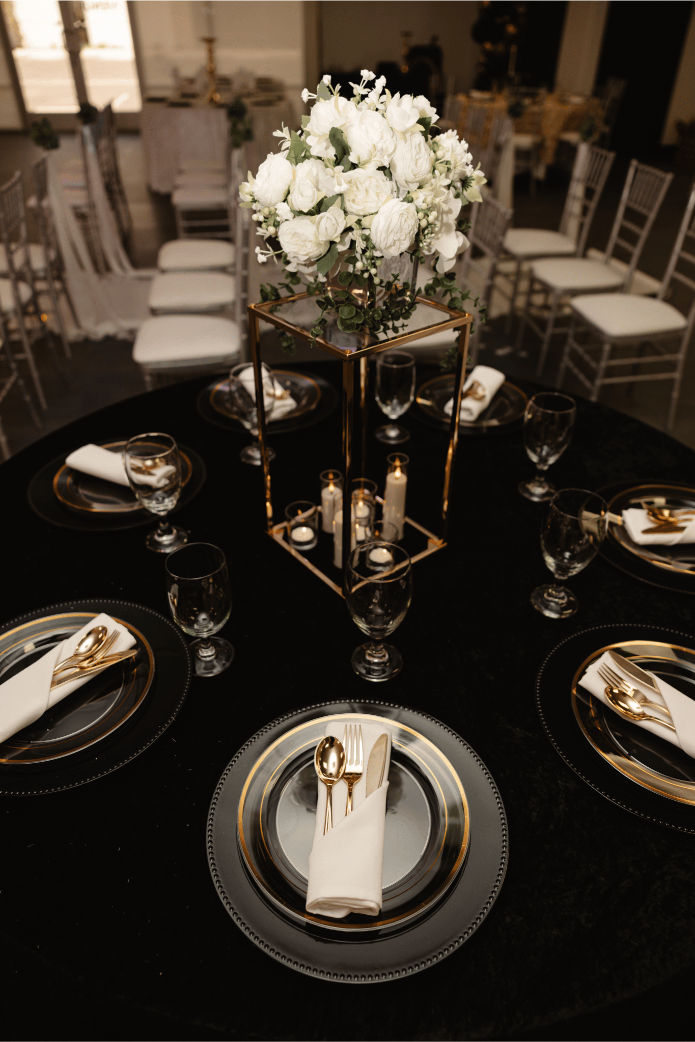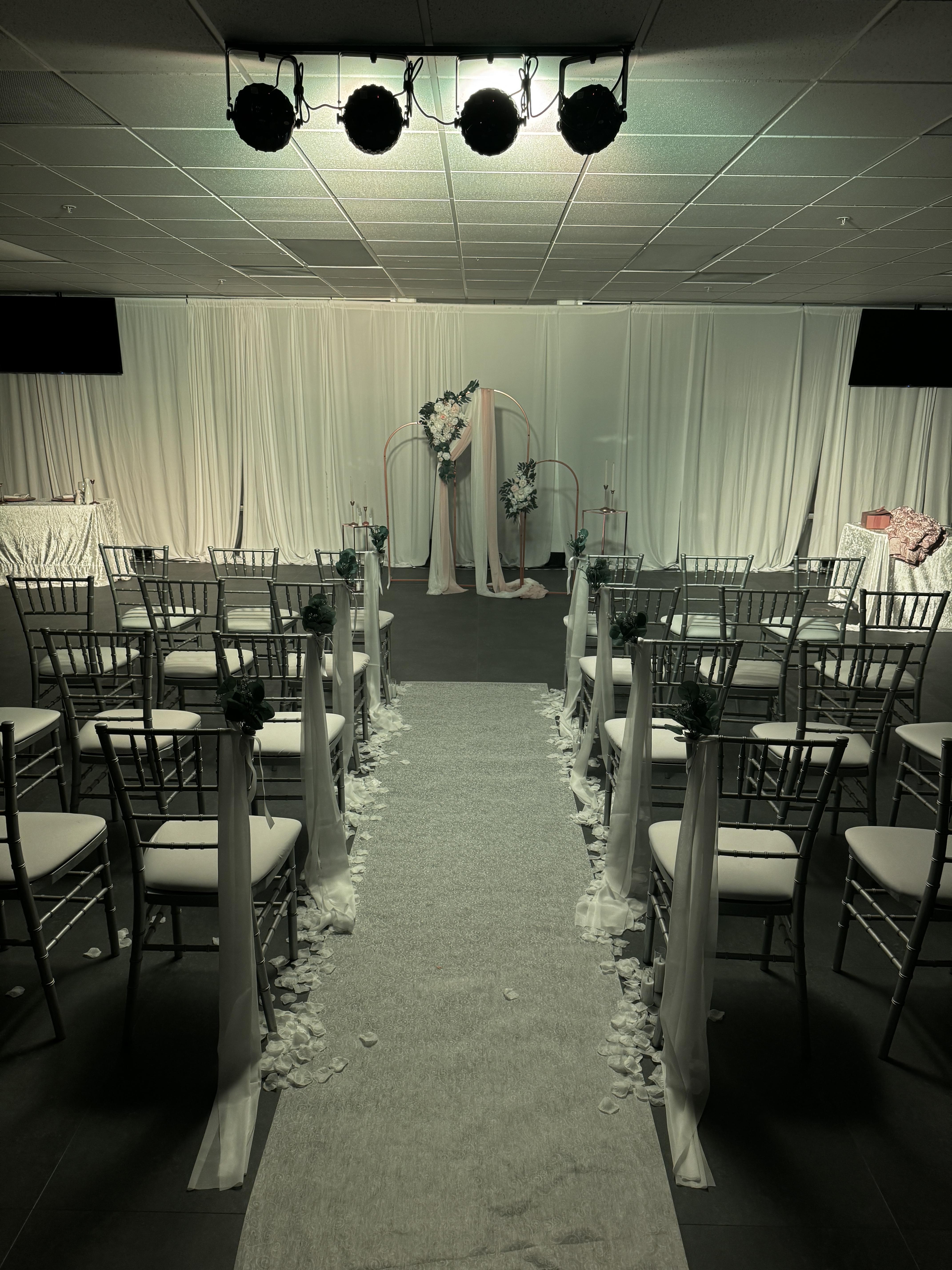 - Round tables - Chairs - Black or White Table Linens - Prep Kitchen - Sweetheart Table - Uplights - Security Guard - Cleaning fee