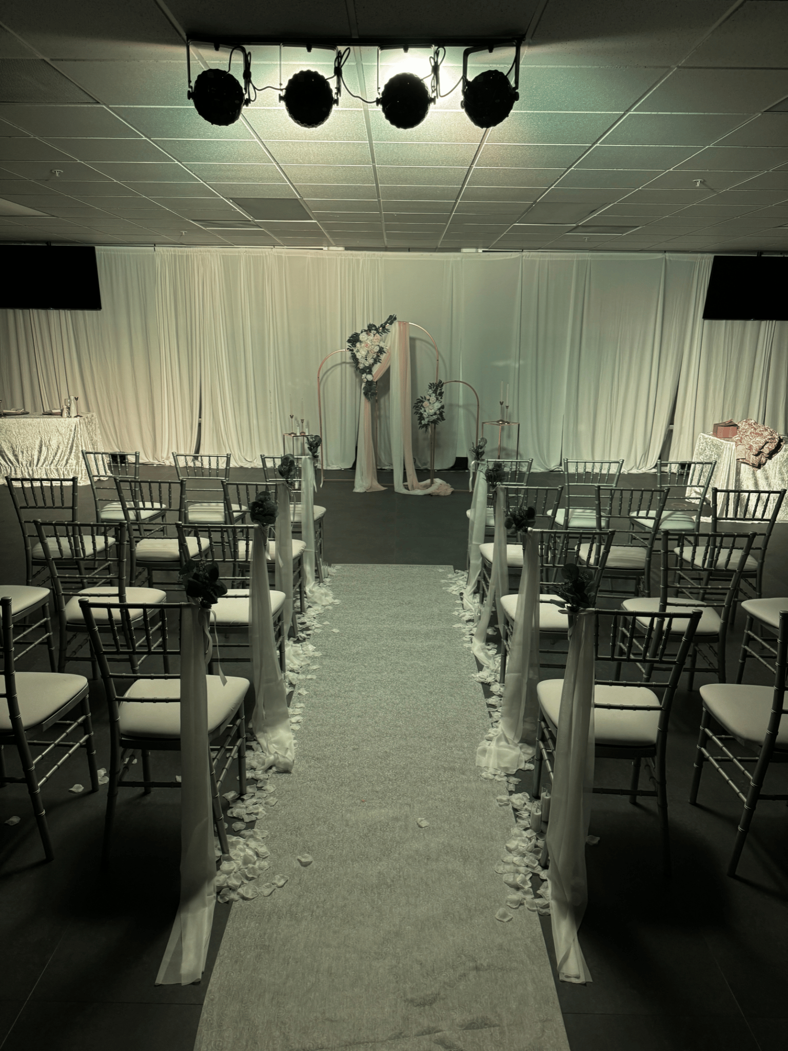 Our venue offers 3,000 sq. ft. of versatile space, indoor restrooms, a prep kitchen, outdoor patio, ample parking, and professional lighting — perfect for weddings, receptions, and events. Make your next celebration unforgettable with us!