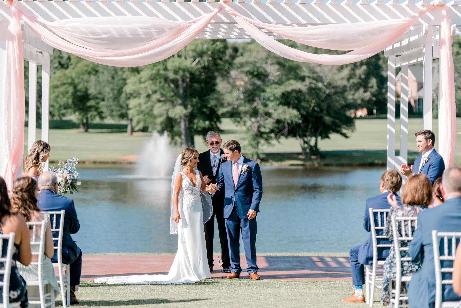 A beautiful lakeside ceremony space, complete with a beautiful white pergola.