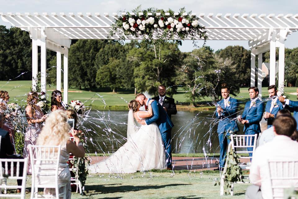 Located in Matthews, NC. The View at Emerald Lake is an elegant venue with a rustic vibe, situated on a picturesque golf course. Our brand new 5,000 square foot ballroom can comfortably accommodate up to 250 guests, and features a 32-foot high stone gas fireplace, beautiful chandeliers, well appointed bridal and grooms' suites, and much more.