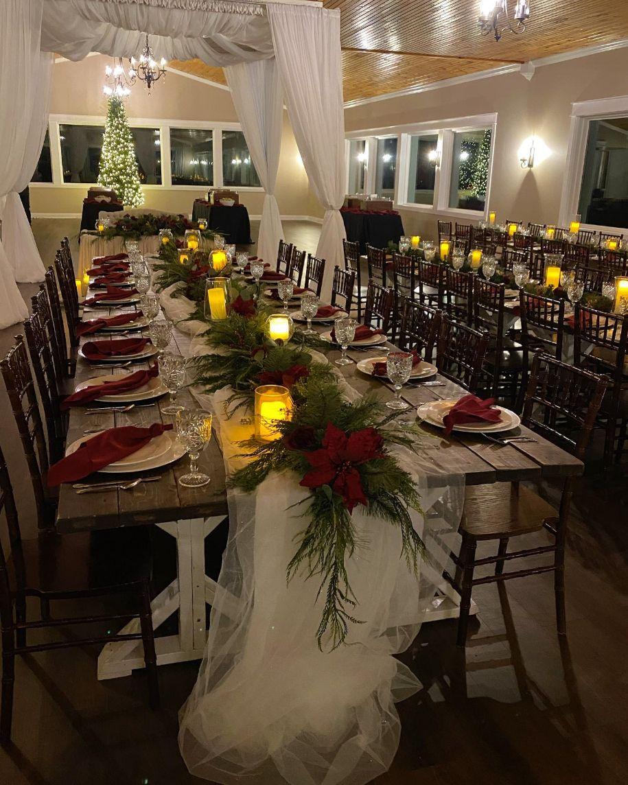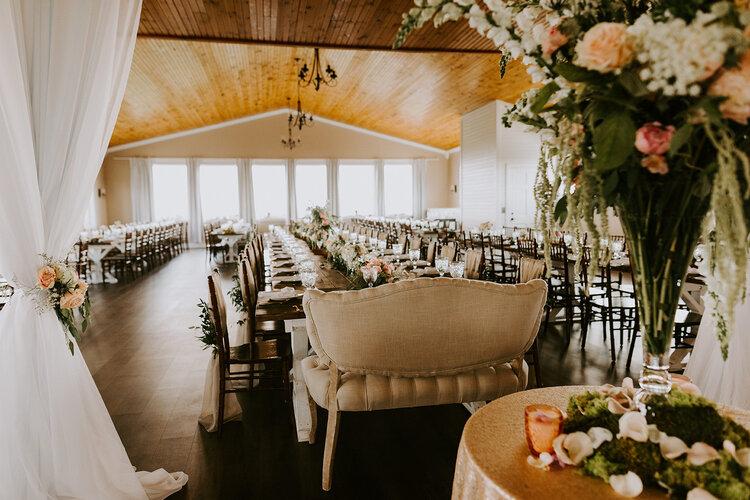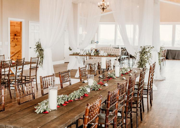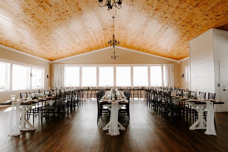 In The Dining Hall, up to 300 of your loved ones can enjoy a decadent meal provided by the on-site catering team while enjoying the exquisite mountain views. Farmhouse tables can be adorned with any combination of linens, flatware, dinnerware, glassware, and decorative accents from our collection. This allows you to create the exact wedding aesthetic you have envisioned, without the hassle of renting dishes or decor.