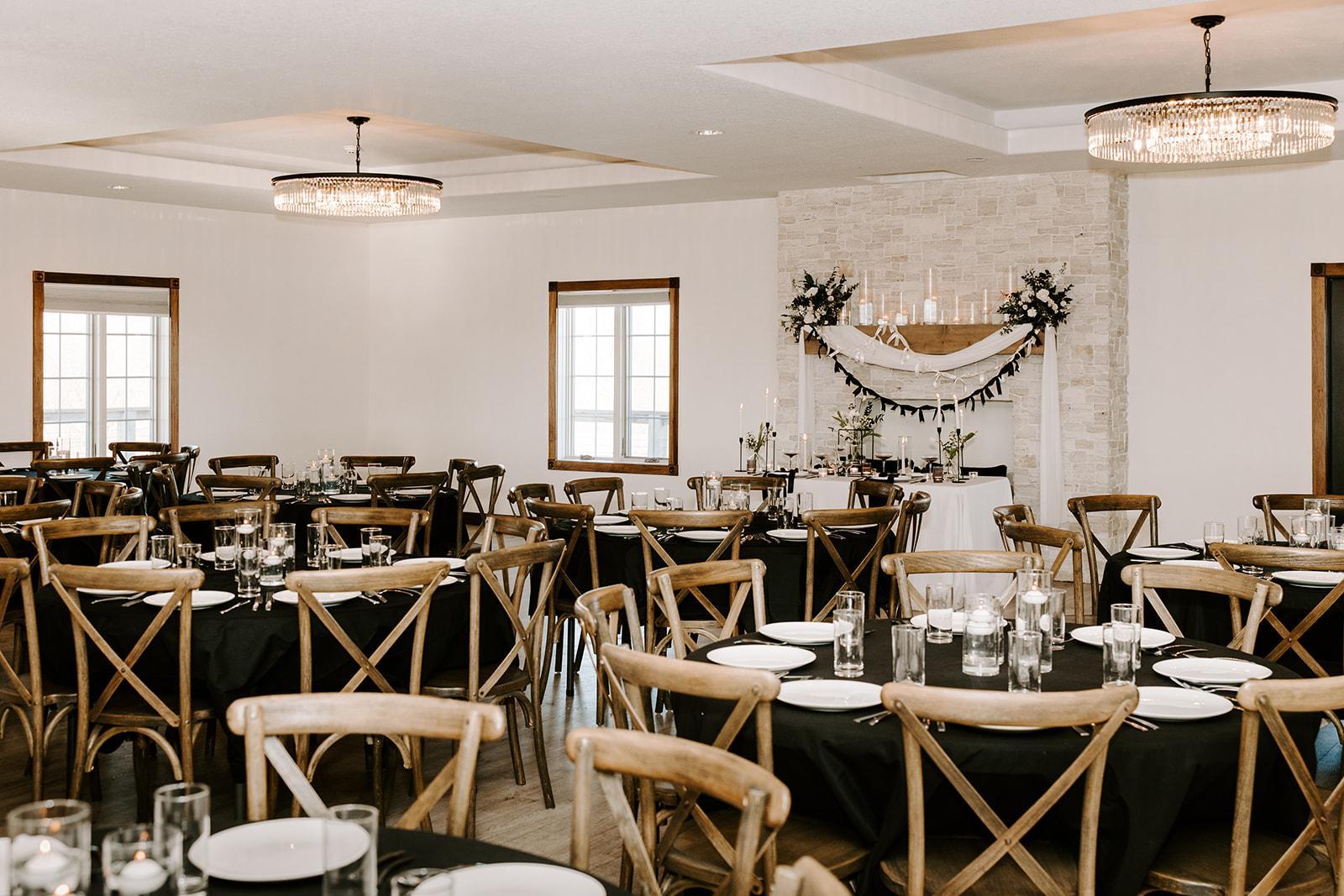 - Dimmers for customizable lighting - Elegant cross-back chairs - Wooden farm tables and round guest tables