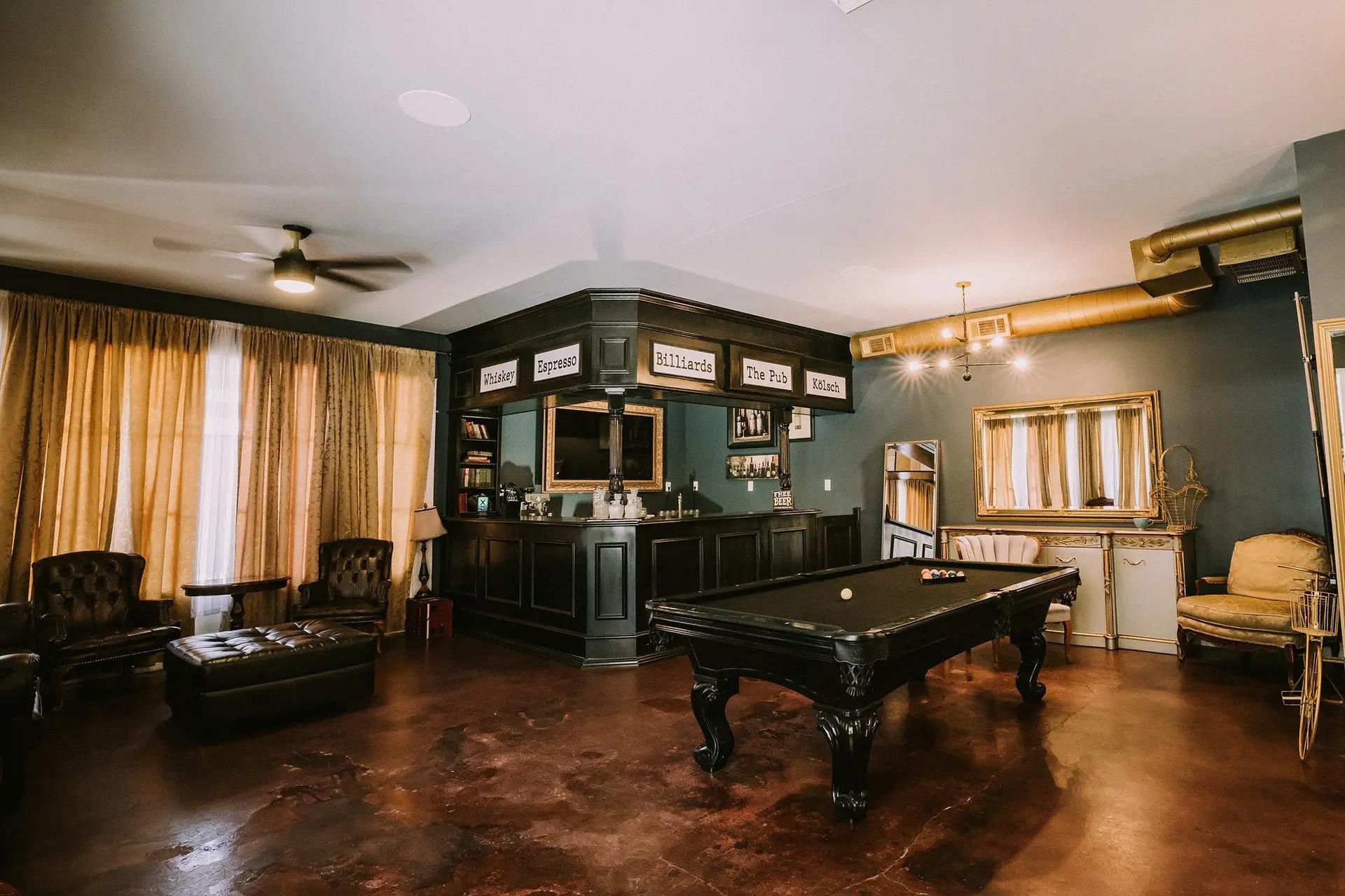 Begin with a romantic ceremony in the rustic barn, followed by cocktails in the cozy speakeasy lounge. Host your reception in the elegant, farm-table-filled hall, blending rustic chic with French vintage flair. The spacious bridal suite offers gorgeous mirrors, vintage sofas, and a powder room ideal for getting ready, while the groom's pub provides a cigar bar vibe with a pool table, leather sofas, and a private bar.